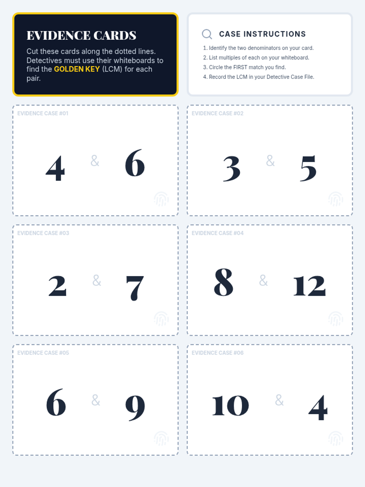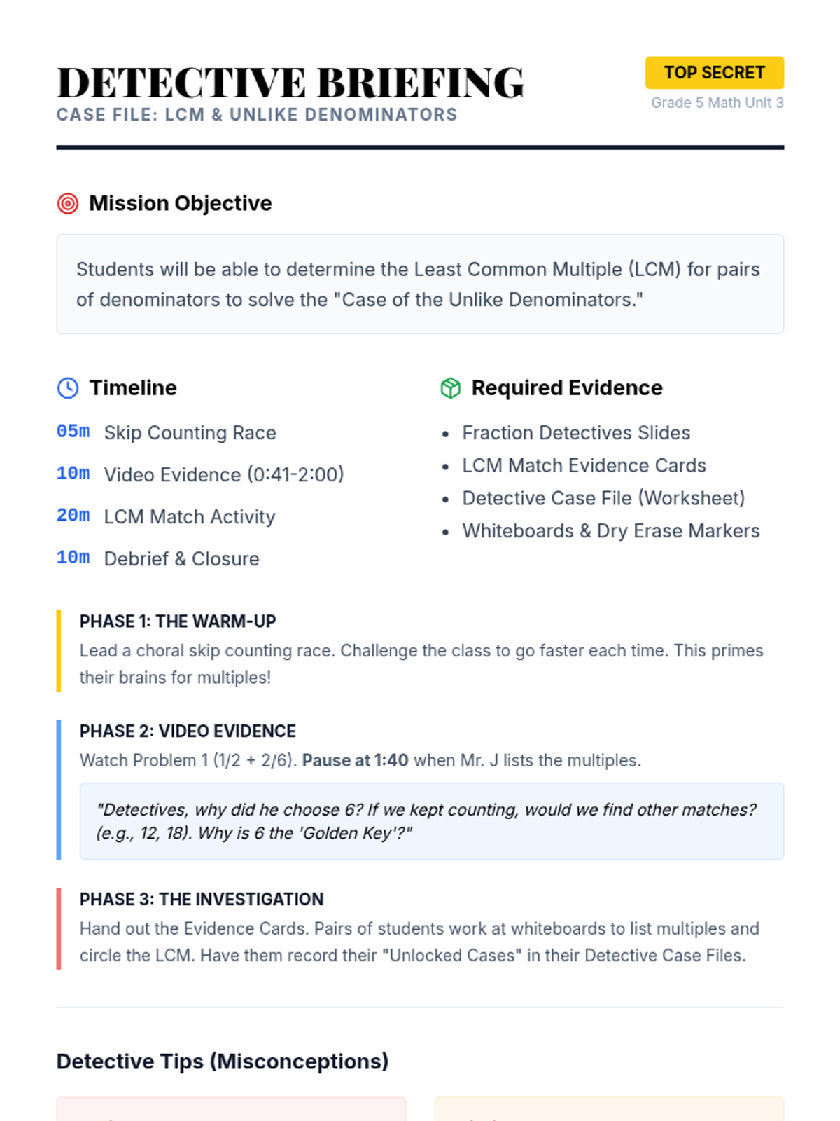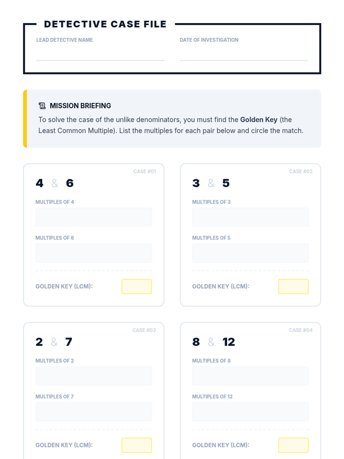 A detective-themed lesson where 5th graders solve the 'Case of the Unlike Denominators' by mastering the Least Common Multiple (LCM) to find common denominators. Students use multiples to unlock fraction problems through video analysis and a hands-on matching activity.