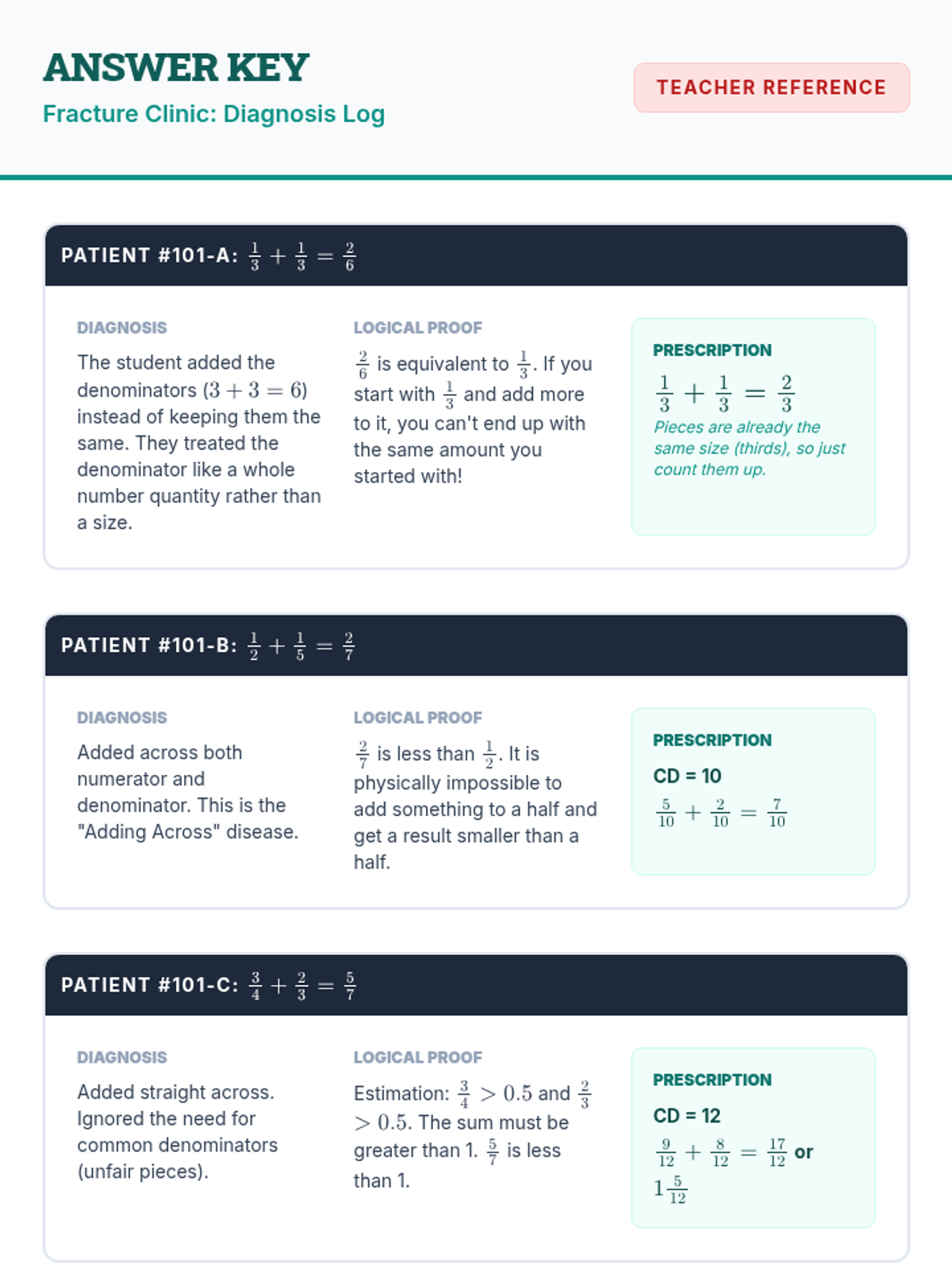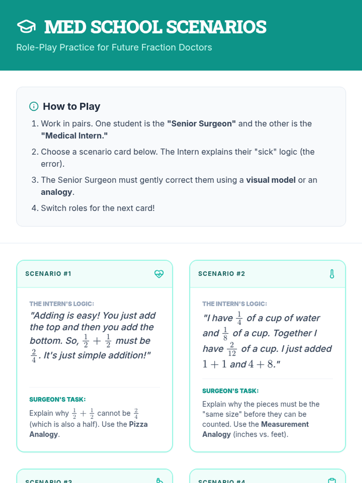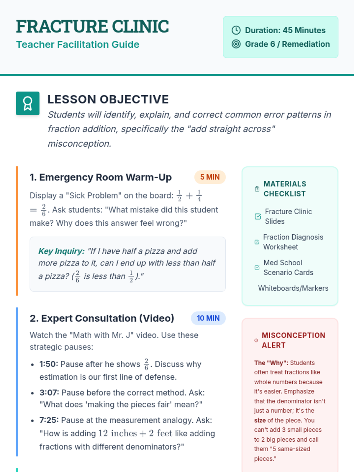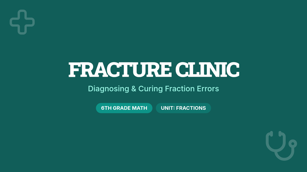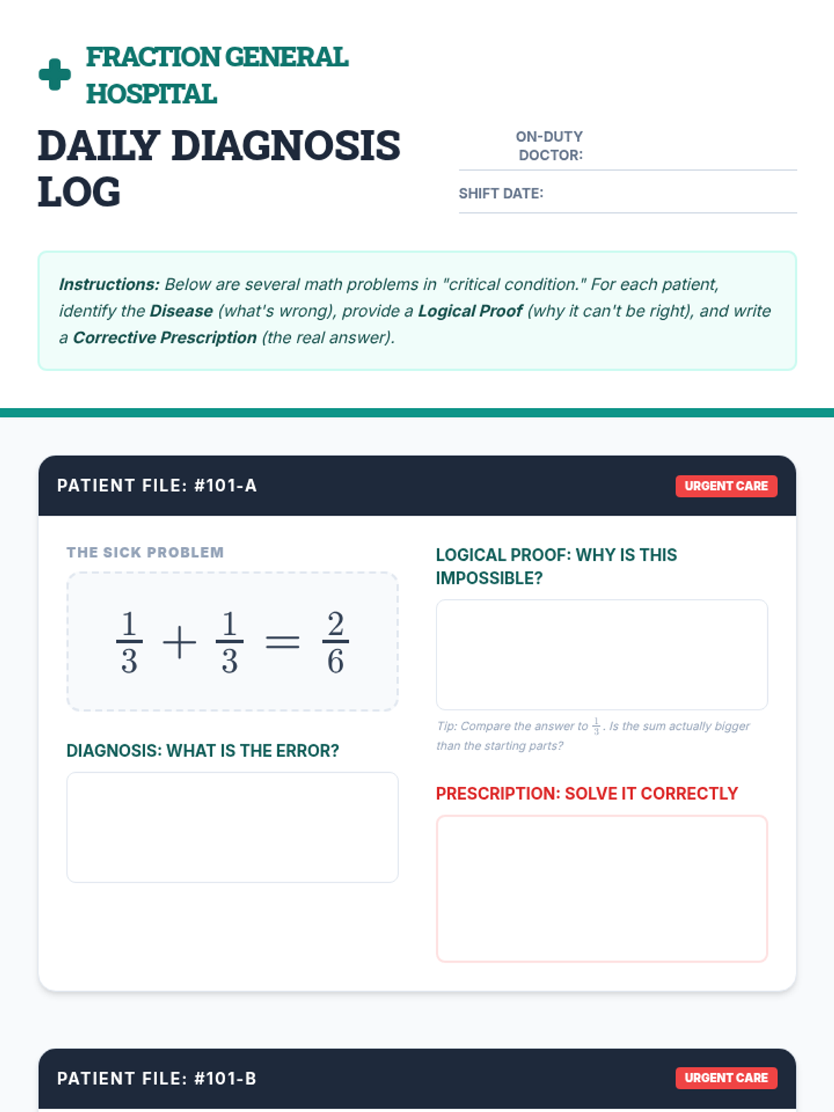 A remedial 6th-grade math lesson focused on identifying and correcting the common error of adding numerators and denominators straight across. Students take on the role of 'Fraction Doctors' to diagnose 'sick' math problems and prescribe the correct solutions using common denominators.