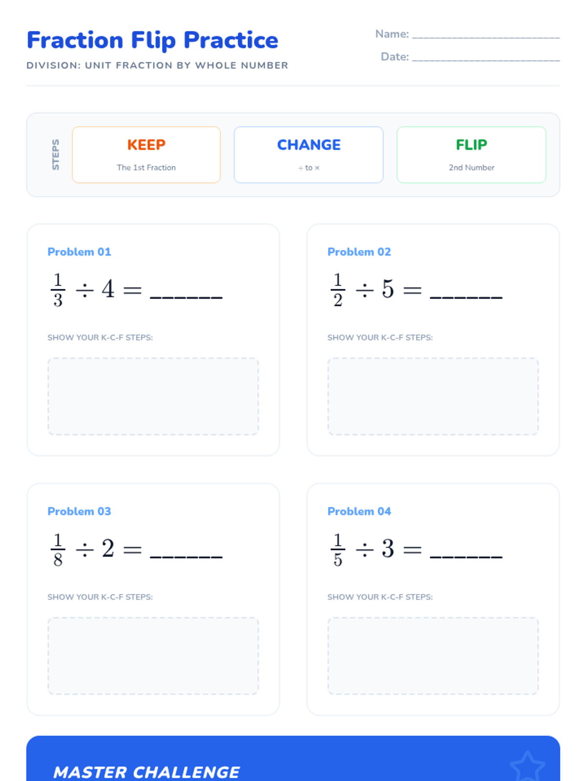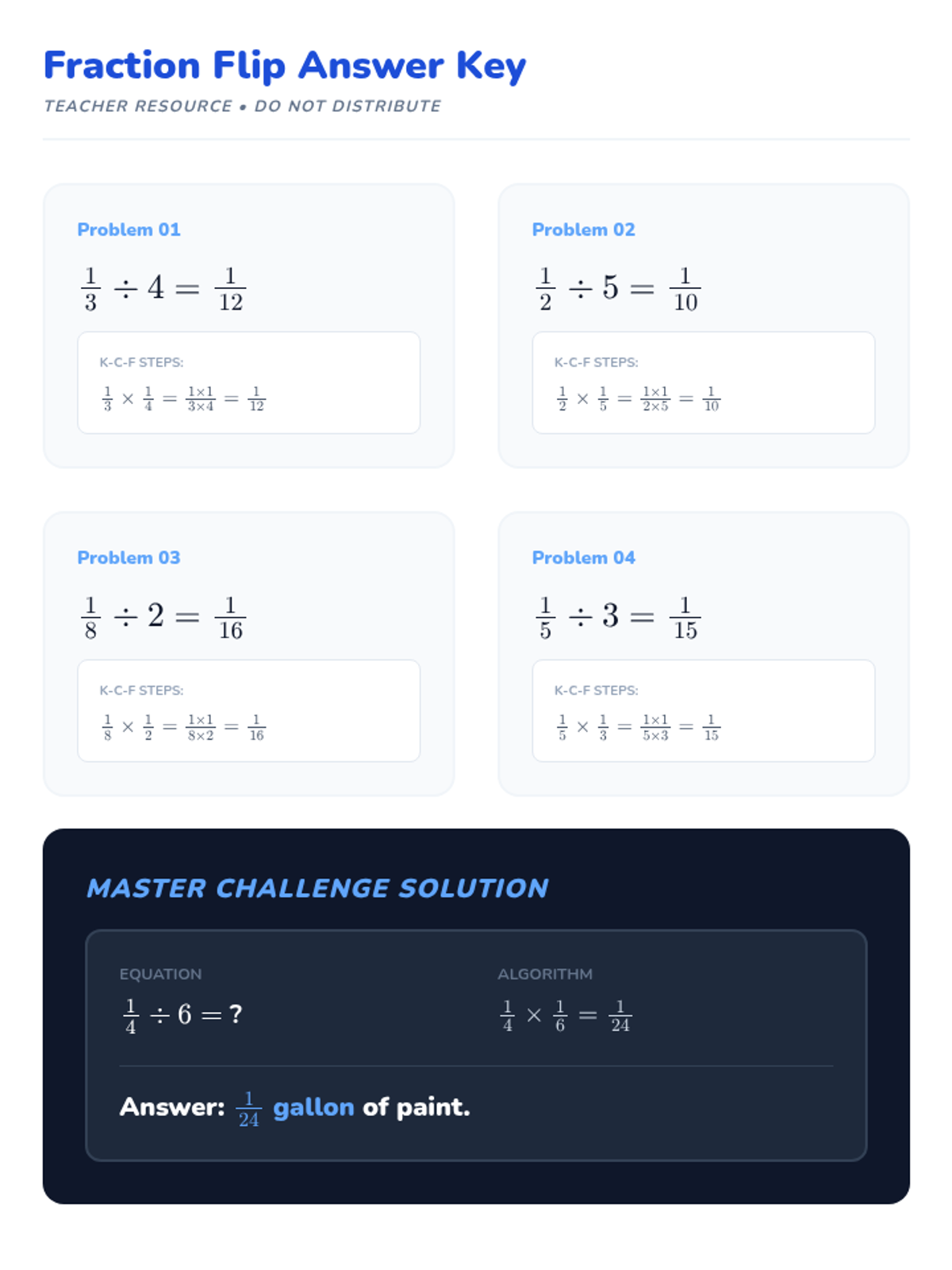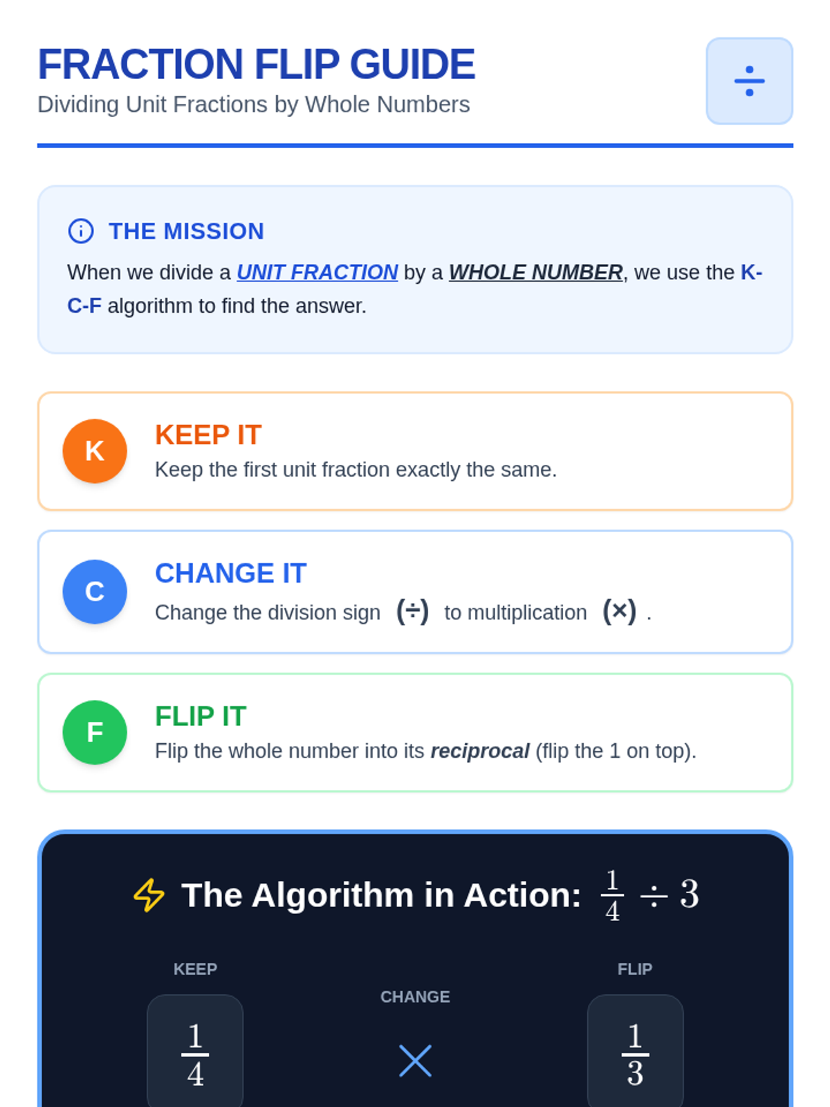A lesson focused on the procedural steps of dividing unit fractions by whole numbers using the Keep, Change, Flip algorithm.