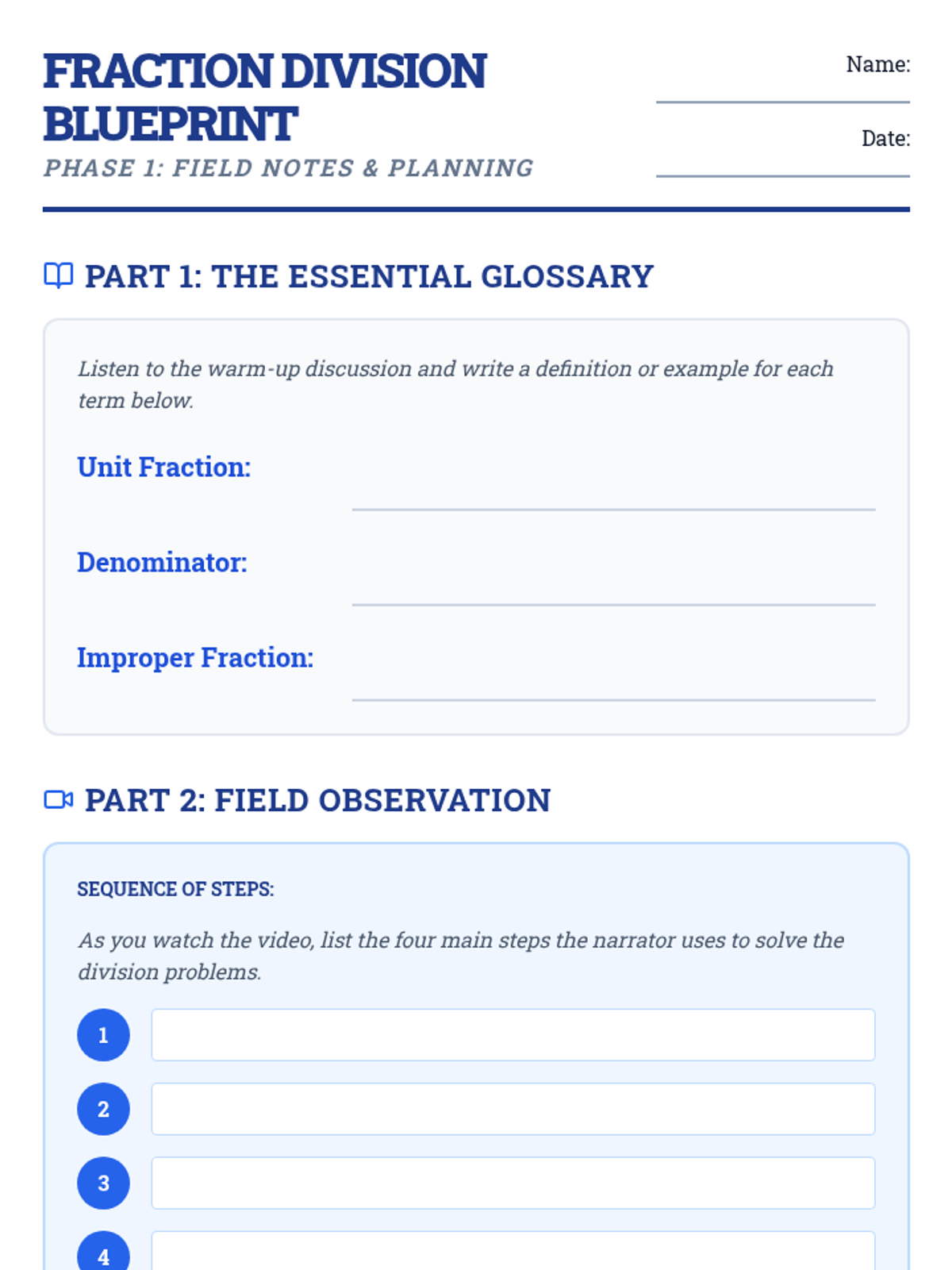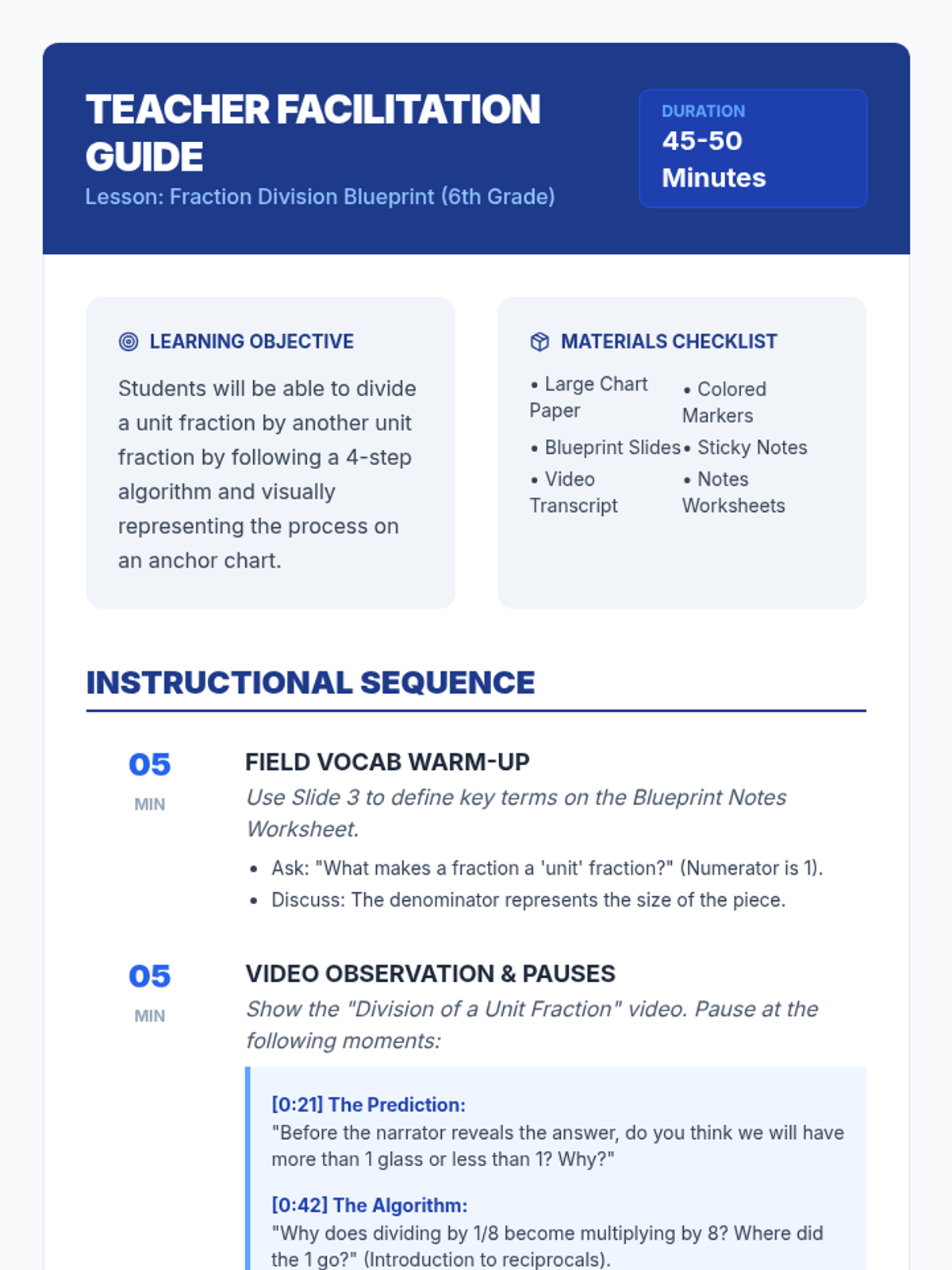 A comprehensive lesson where students learn to divide unit fractions through visual observation, algorithmic reasoning, and collaborative anchor chart creation using a 'blueprint' theme.