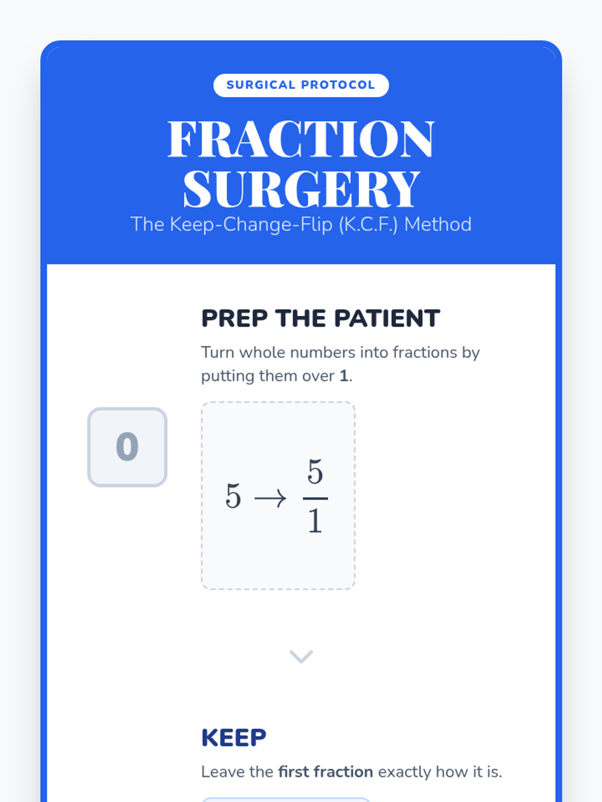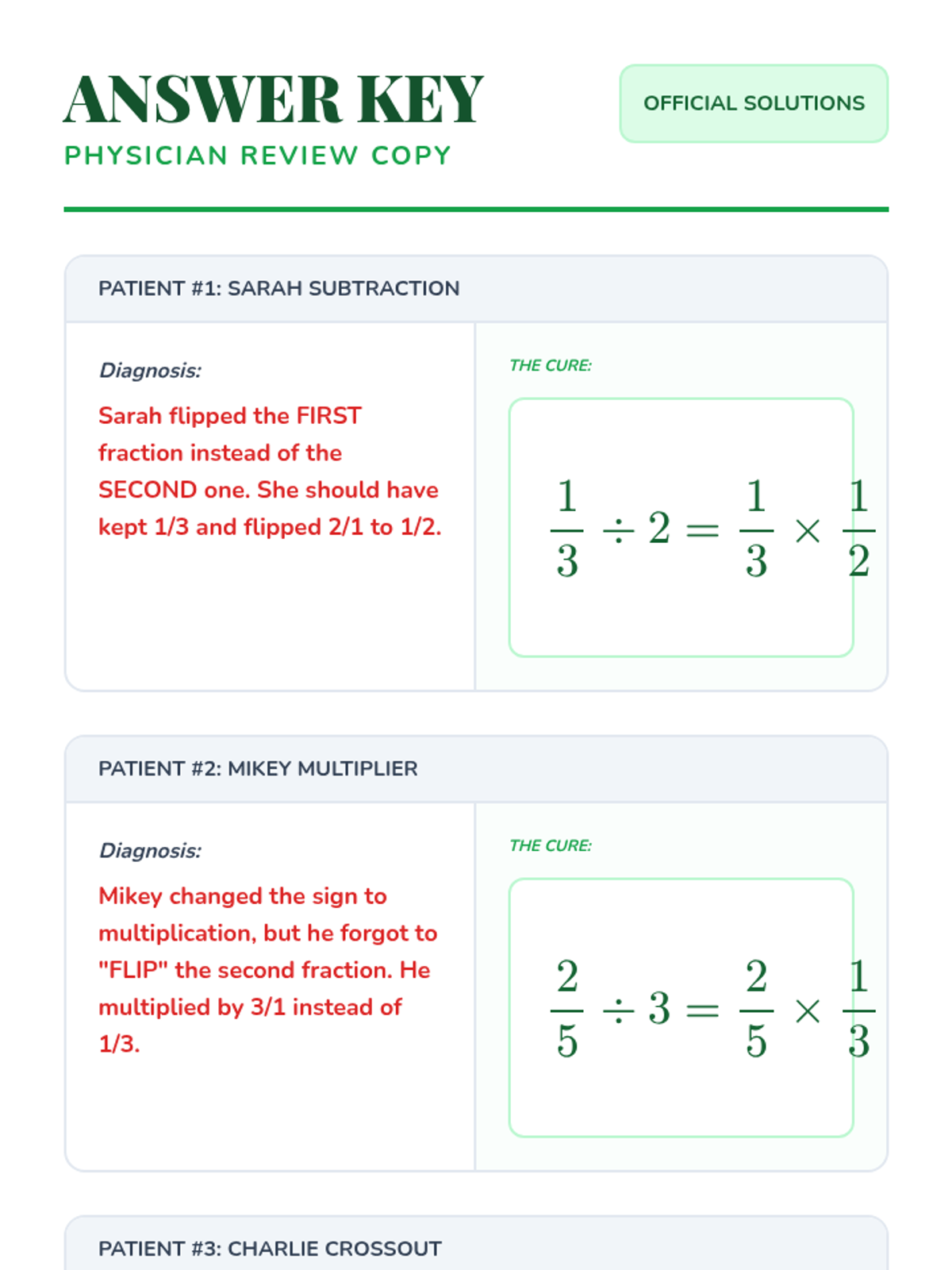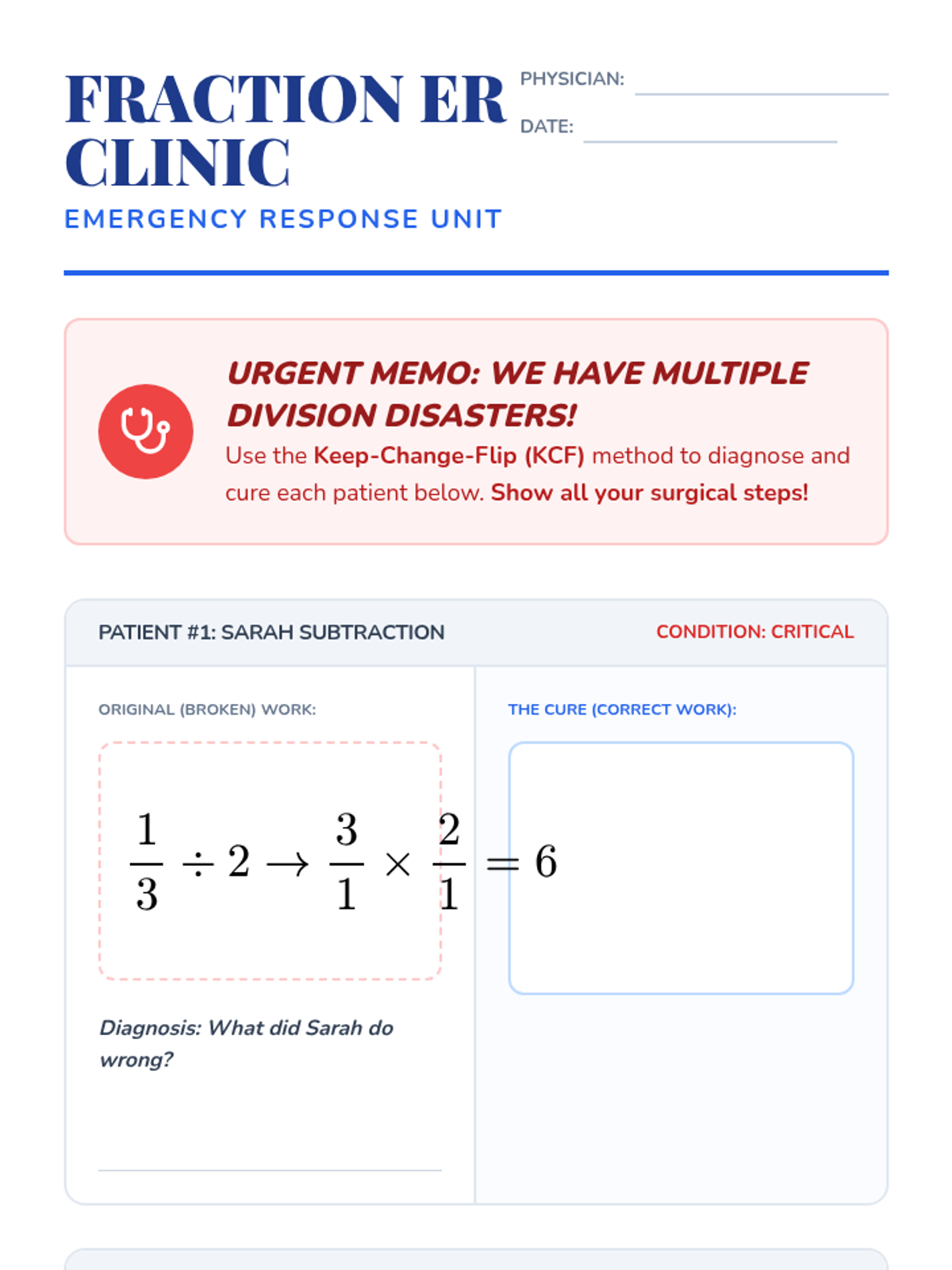A remedial math lesson for 5th and 6th graders focused on identifying and correcting common mistakes in dividing fractions by whole numbers using the 'Keep Change Flip' method and a medical-themed 'Doctor Math' activity.