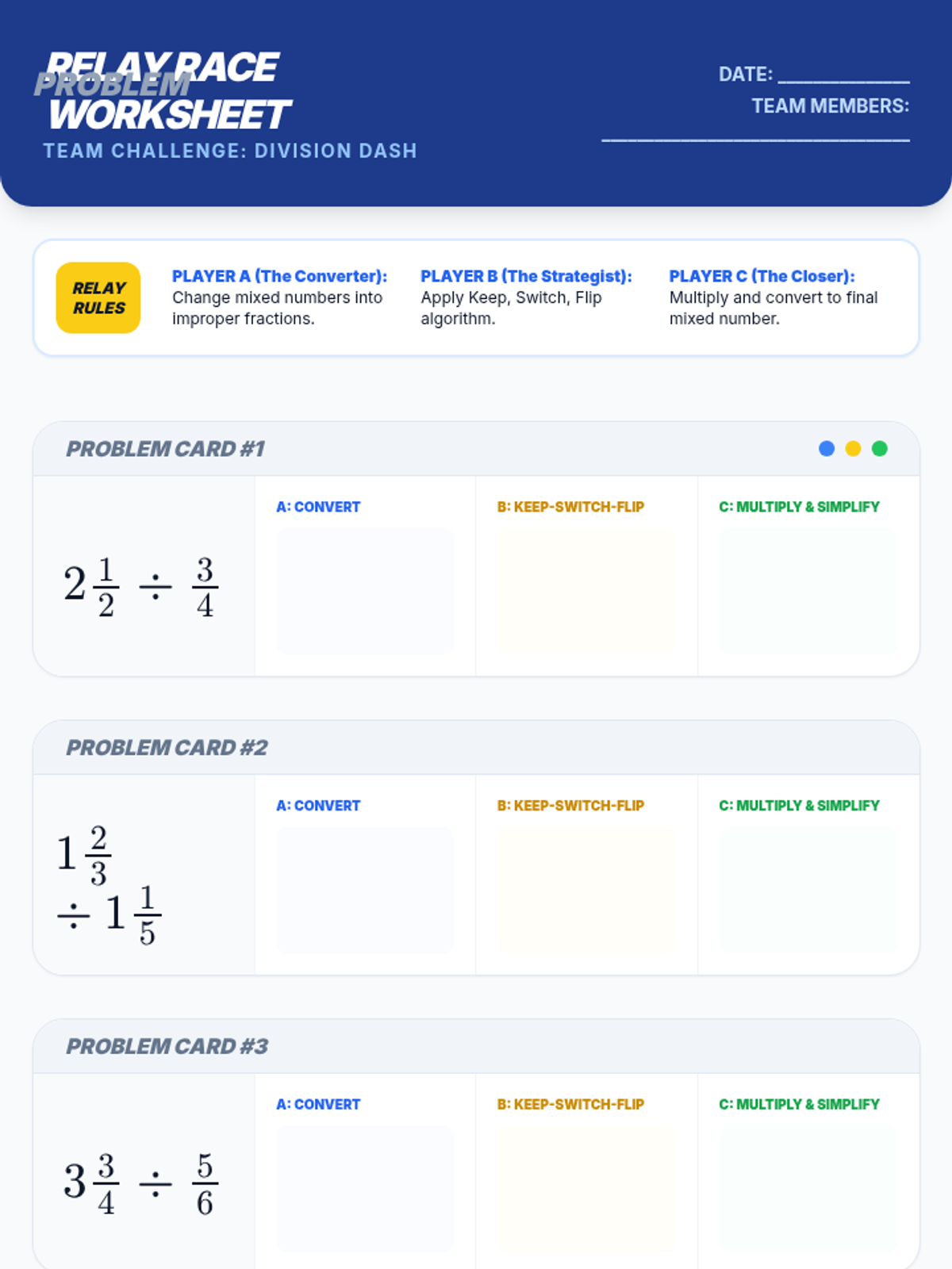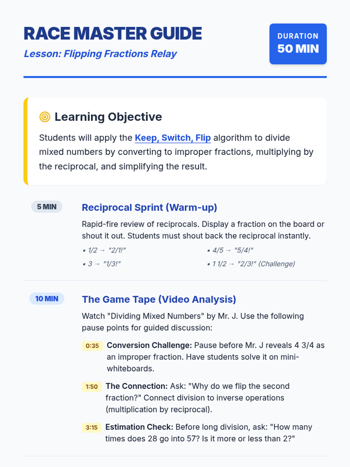 A high-energy 6th-grade math lesson where students master dividing mixed numbers using the 'Keep, Switch, Flip' algorithm through a collaborative relay activity and video analysis.