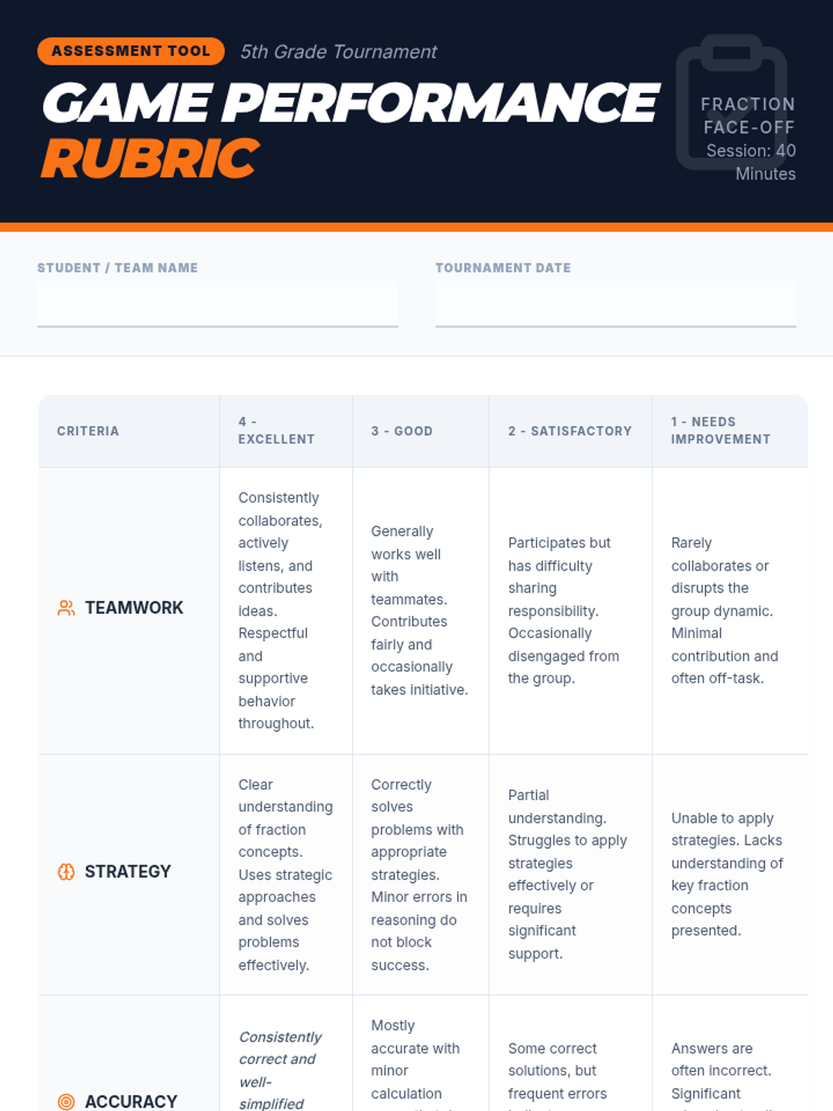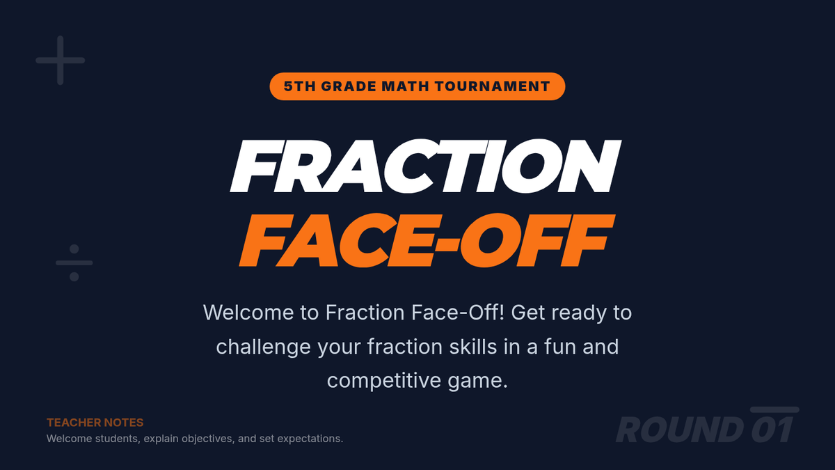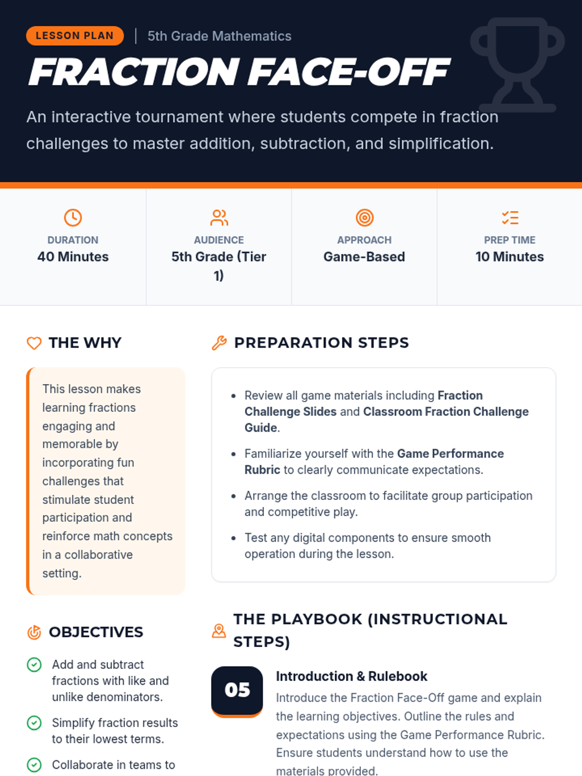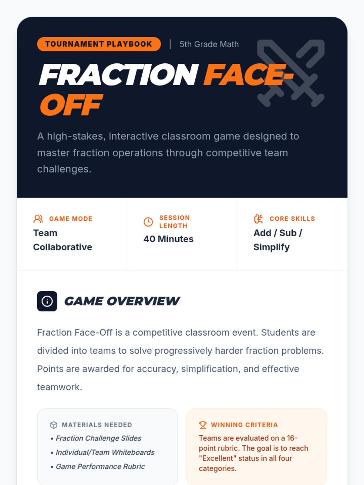 A high-energy, competitive game-based lesson designed to reinforce 5th-grade fraction skills through interactive team challenges in a tournament-style format.