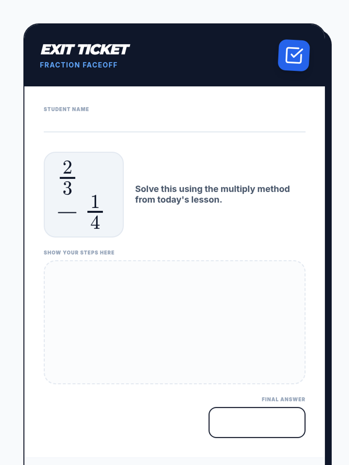 A lesson focused on mastering addition and subtraction of fractions with unlike denominators using the cross-multiplication (butterfly) method. Students use structured graphic organizers to visualize each step of the process.