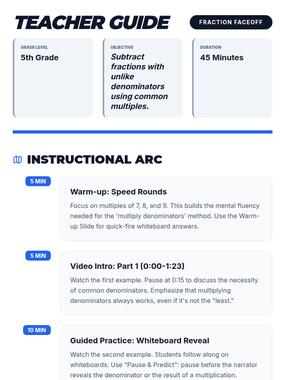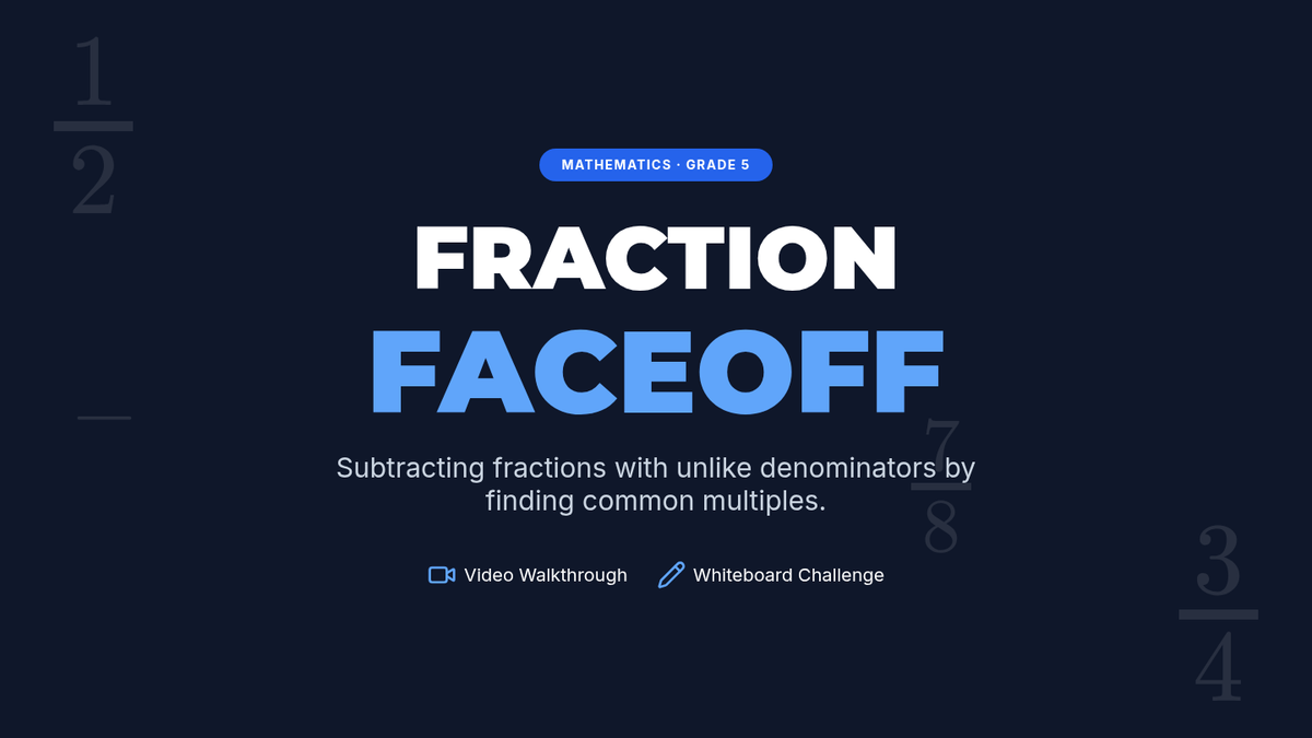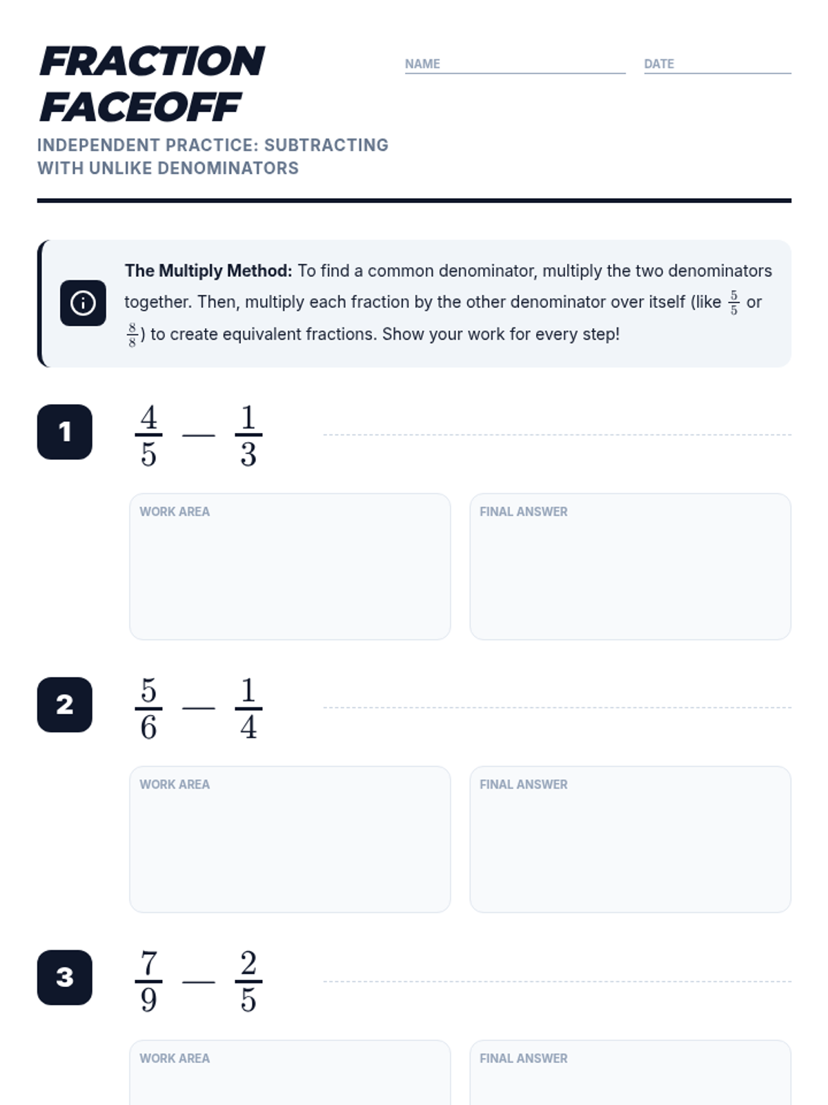 A lesson focused on subtracting fractions with unlike denominators by finding common denominators through multiplication, featuring a guided video walkthrough and hands-on practice.