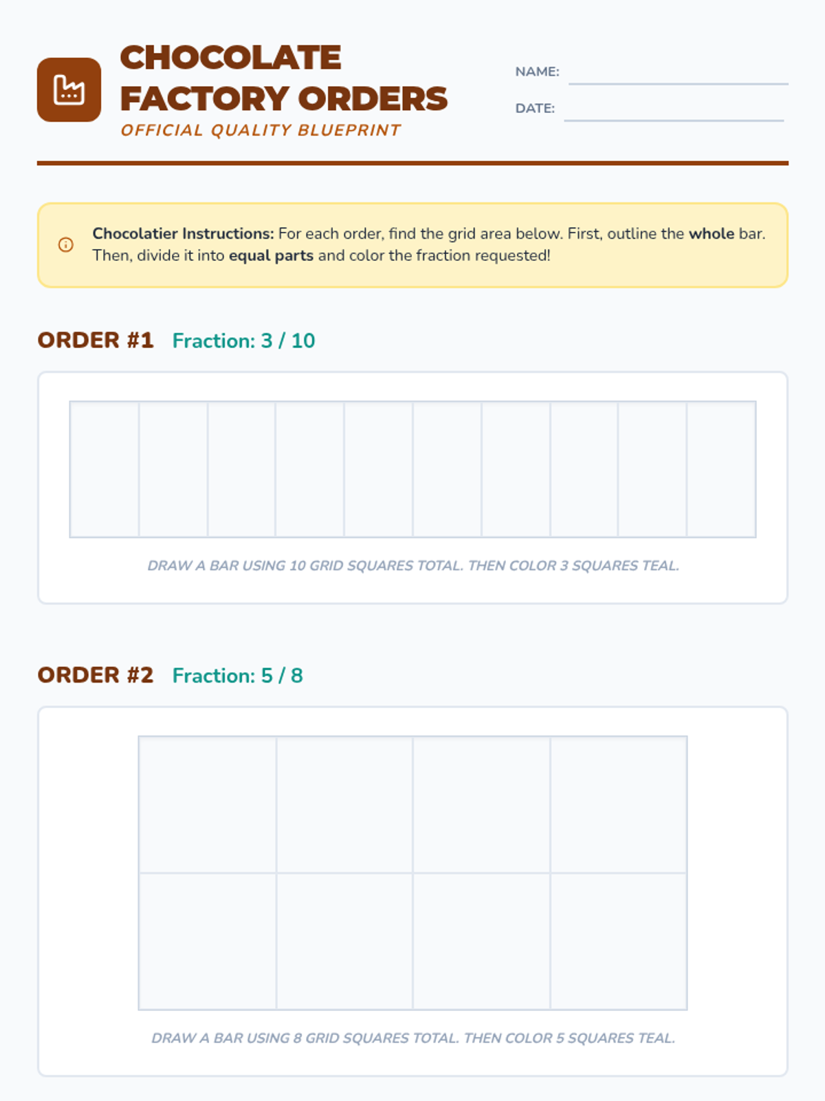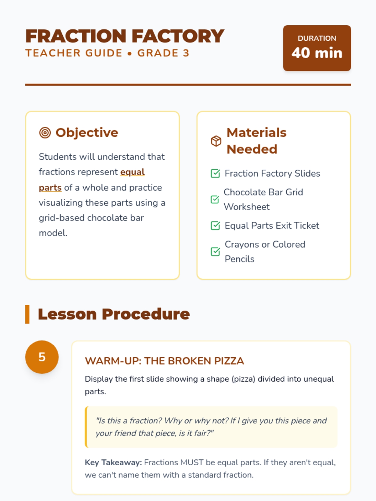 An introductory lesson for 3rd graders focusing on fractions as equal parts of a whole, featuring a chocolate factory activity and video analysis.