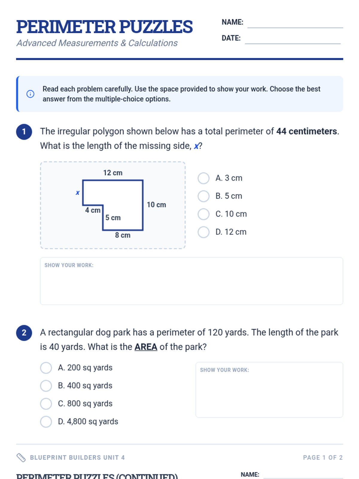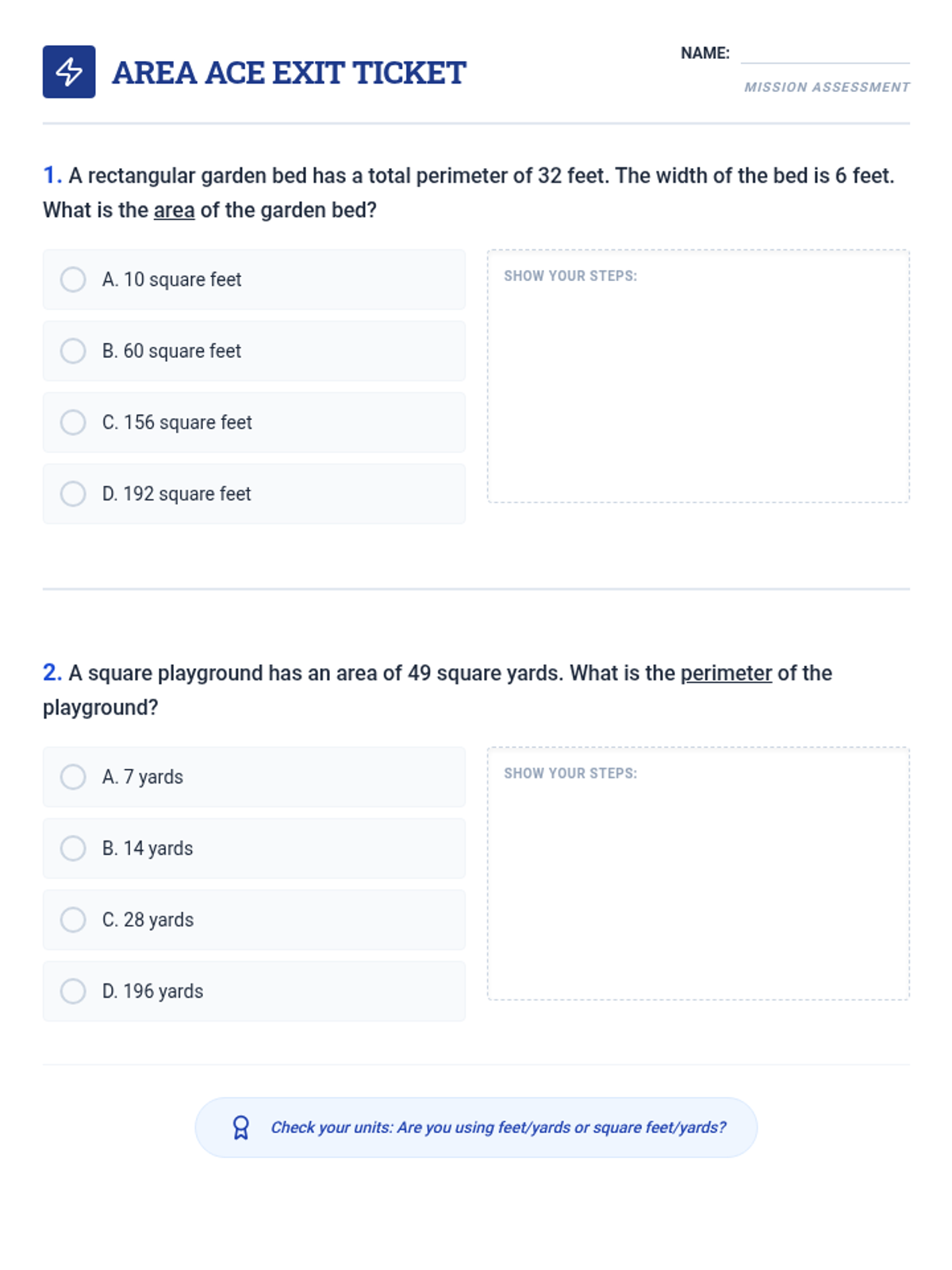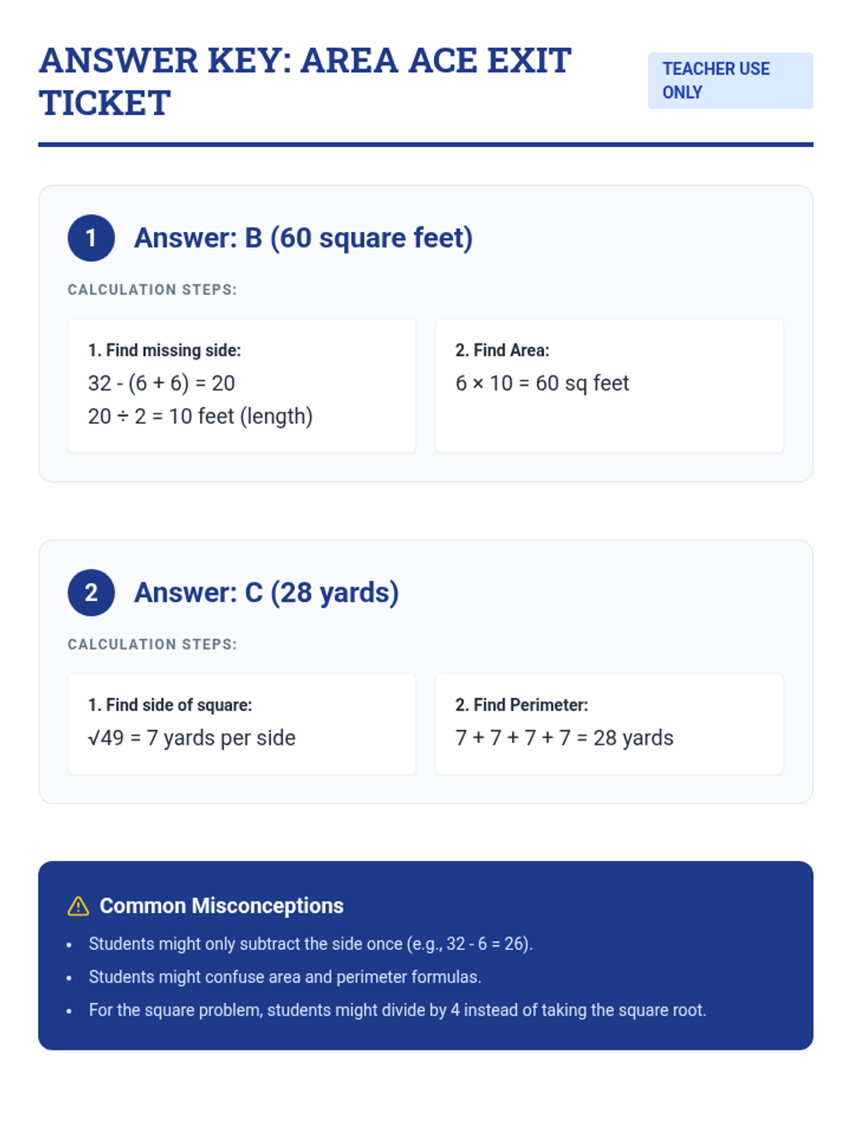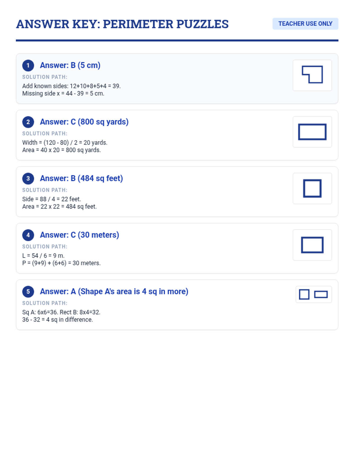 A rigorous math lesson focused on solving complex area and perimeter problems, including multi-step calculations to find area from perimeter and identifying missing side lengths in polygons.