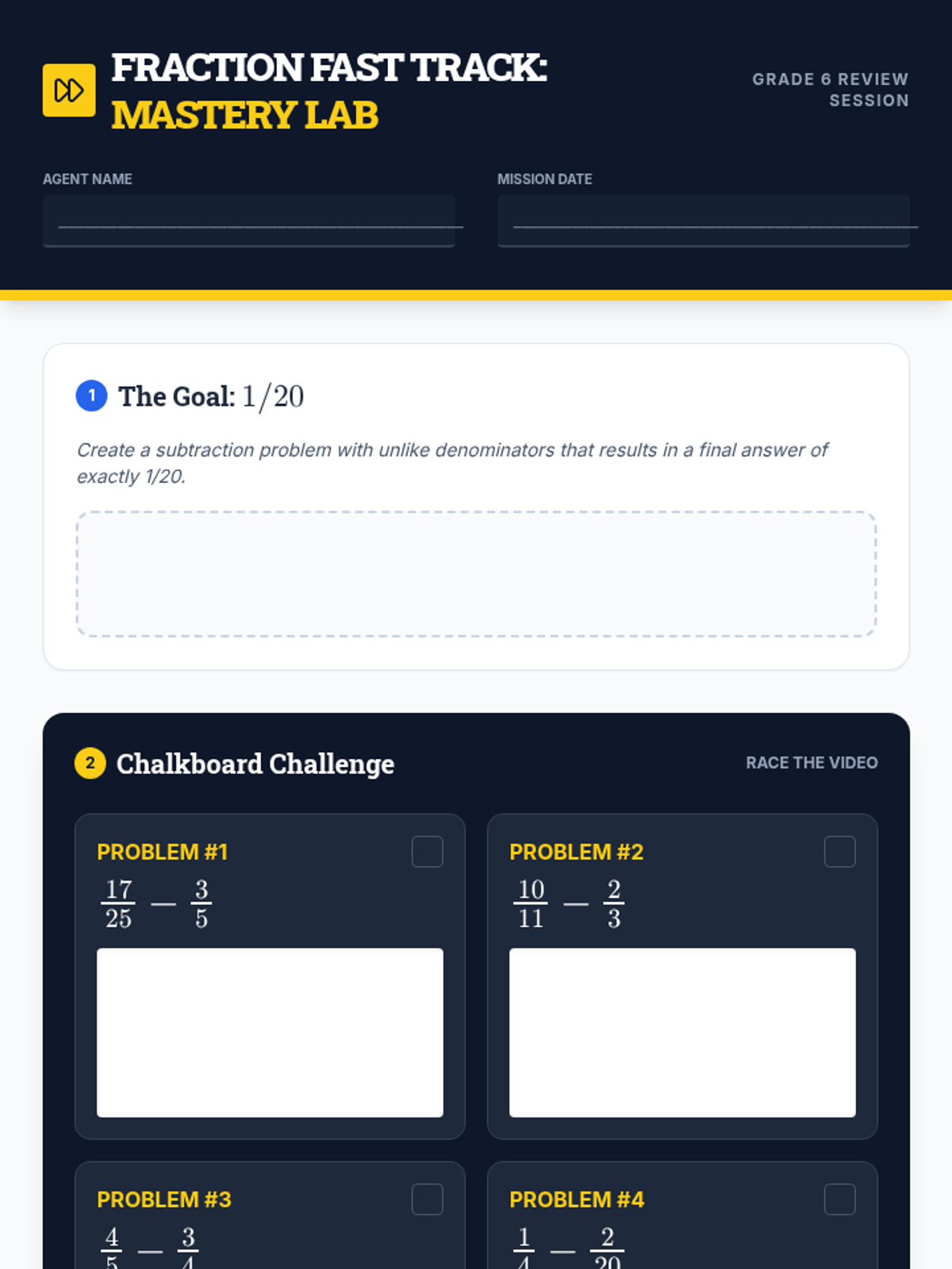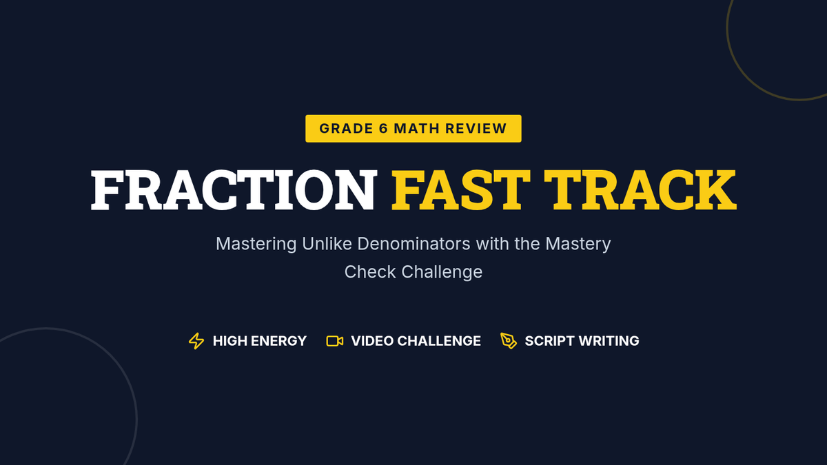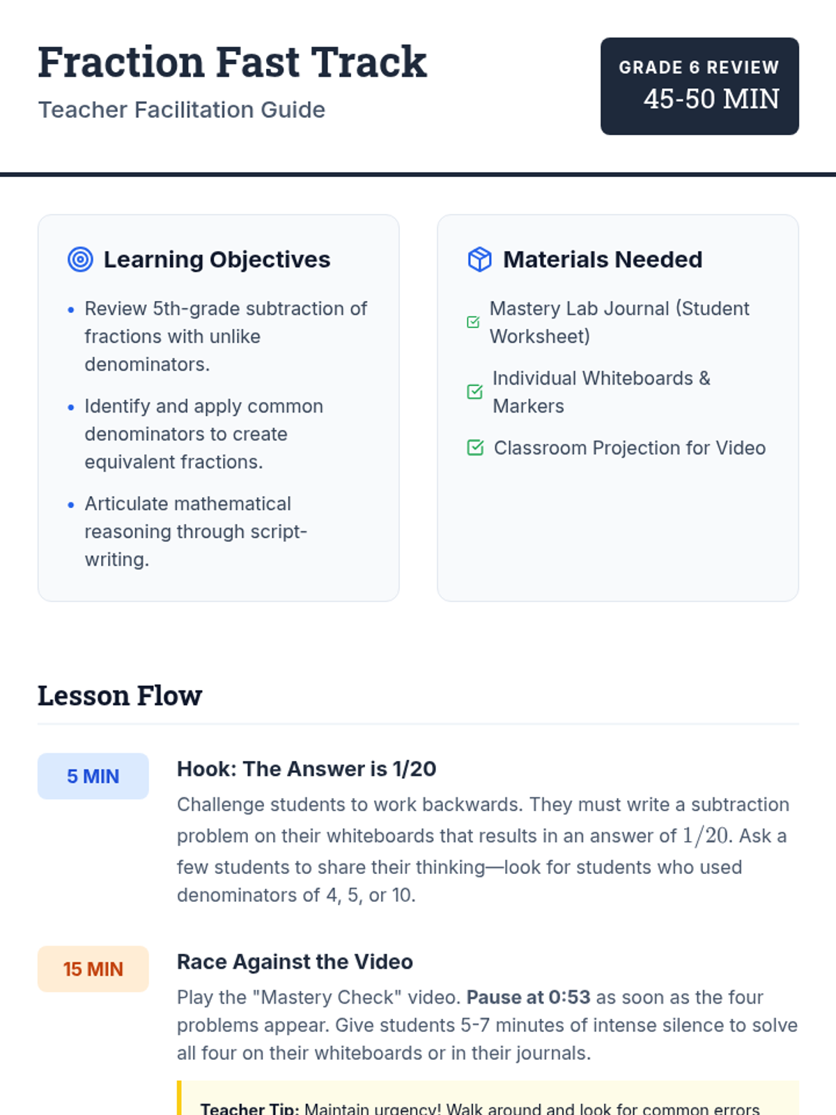 A high-energy review of 5th-grade fraction subtraction standards designed to prepare 6th graders for mixed number operations. Students compete against a 'Mastery Check' video and then step into the role of the teacher by scripting their own instructional segment.
