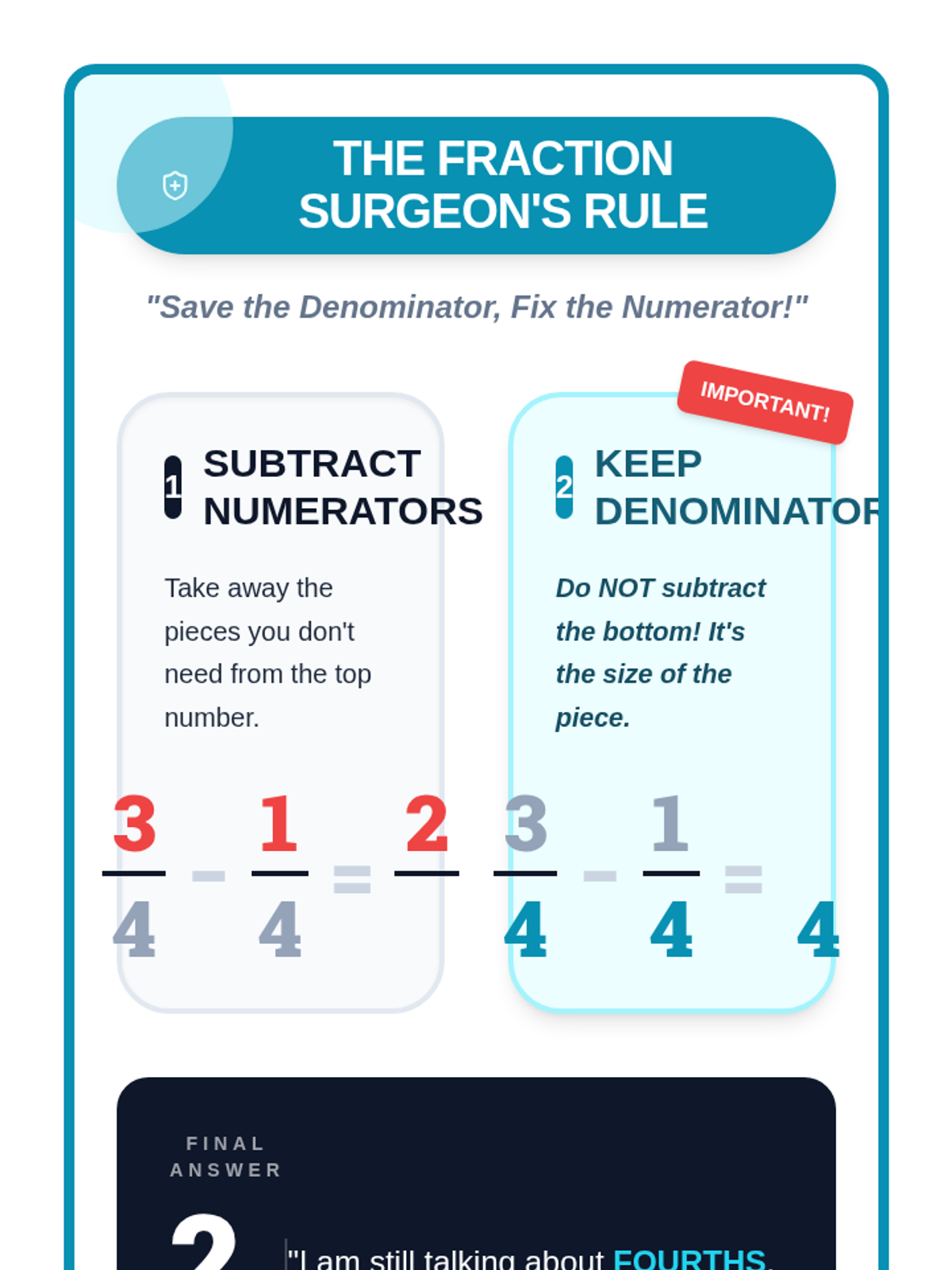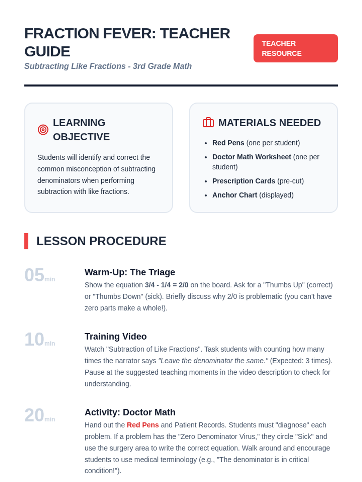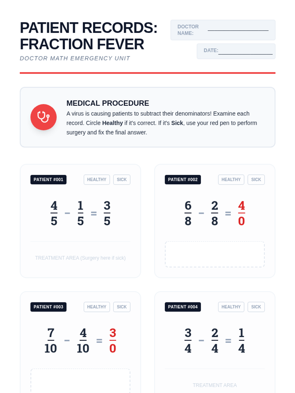 Students become 'Fraction Doctors' to identify and fix the common misconception of subtracting denominators in like fractions. Through a visual video and hands-on diagnosis activity, they learn to keep the denominator the same while subtracting numerators.