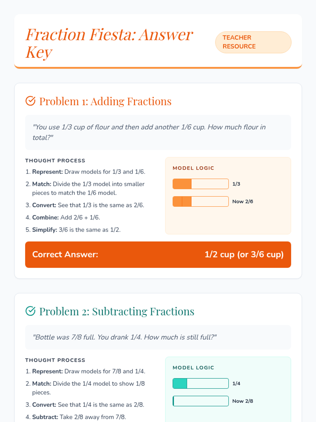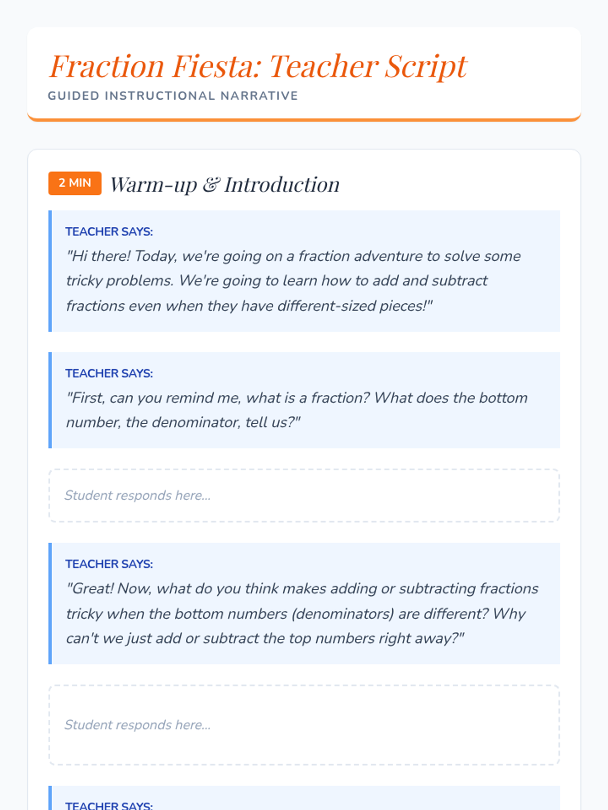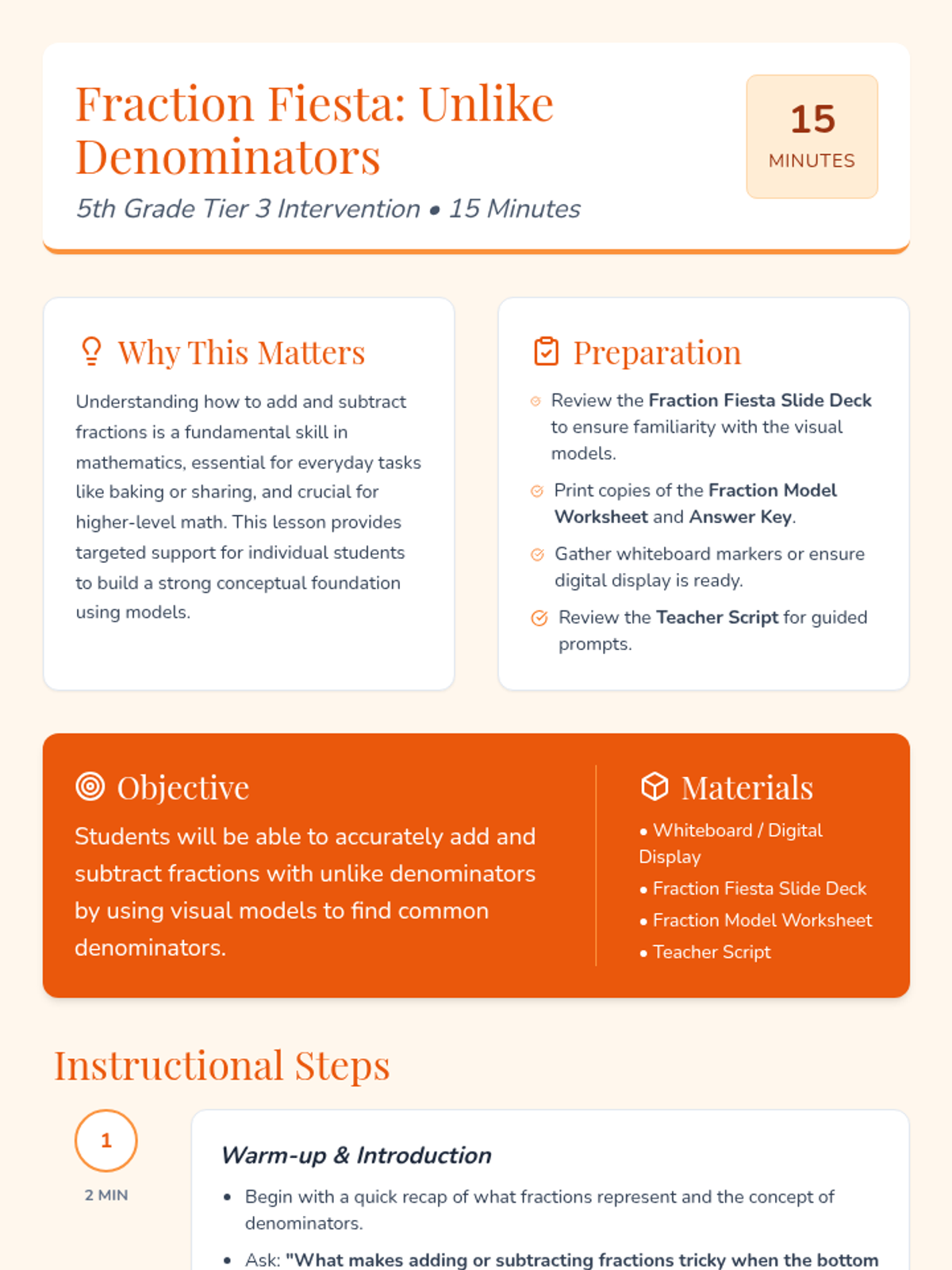 A 15-minute Tier 3 intervention lesson for 5th-grade students focusing on adding and subtracting fractions with unlike denominators using visual models. This lesson provides targeted, hands-on support to build a strong conceptual foundation for future math.