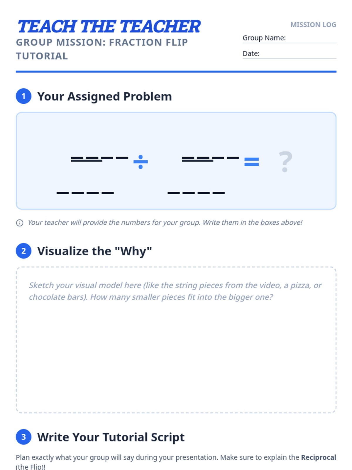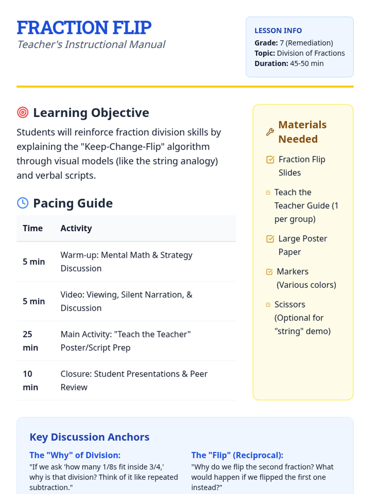 A remediation-focused lesson where 7th-grade students master fraction division by creating peer-to-peer tutorials, moving from concrete string models to abstract algorithms.