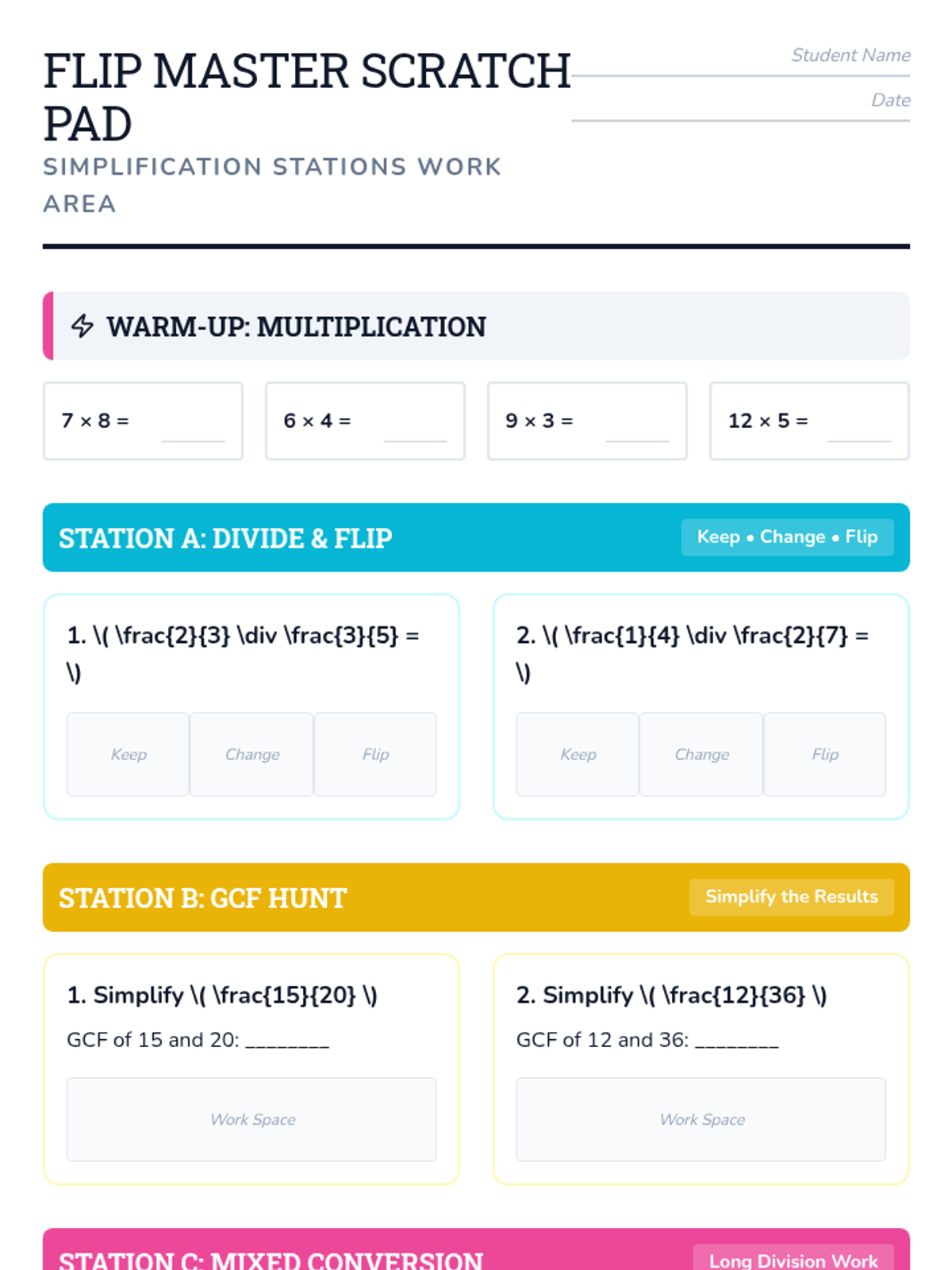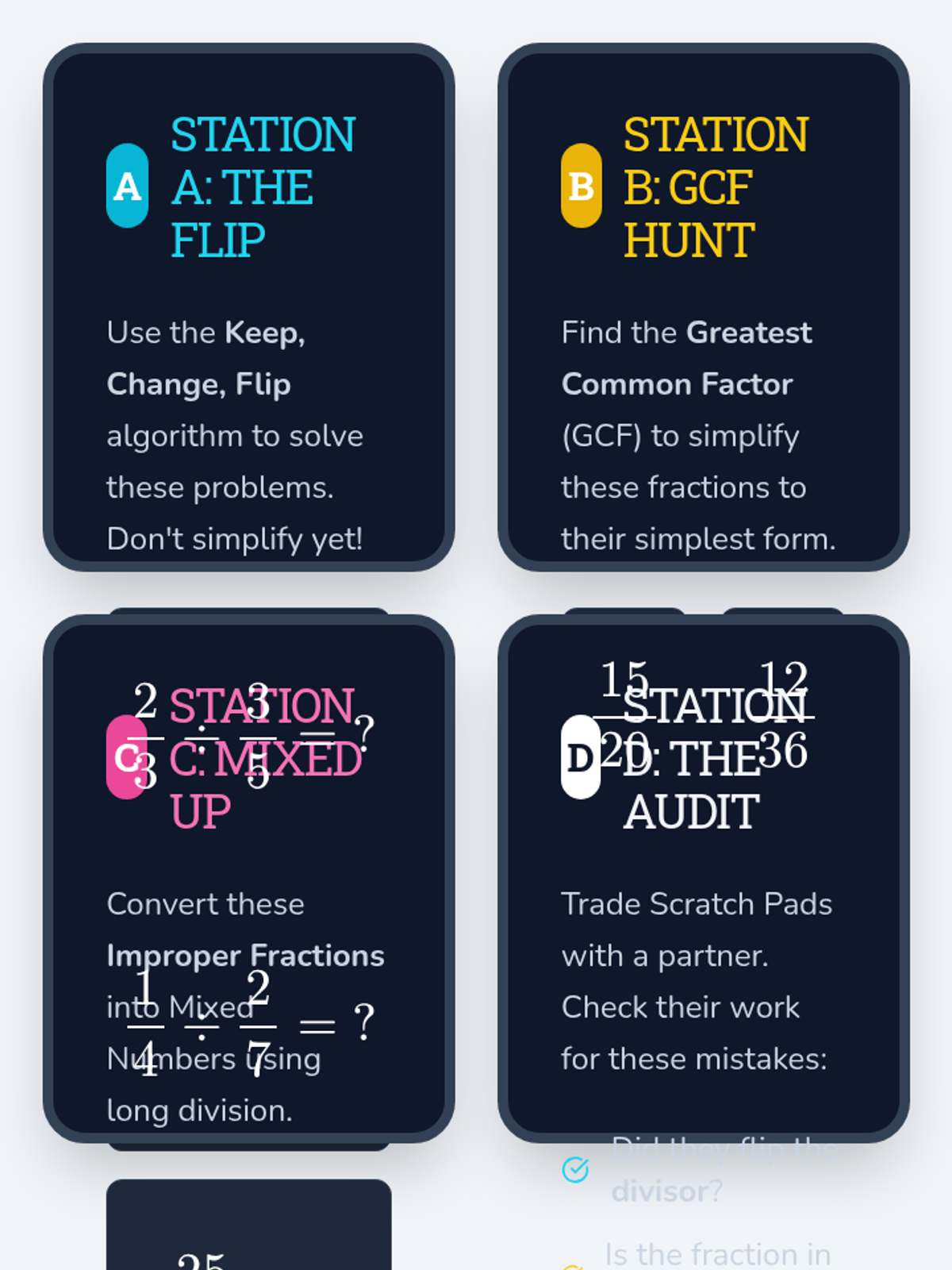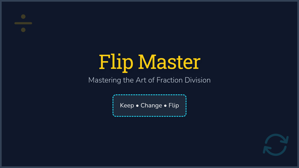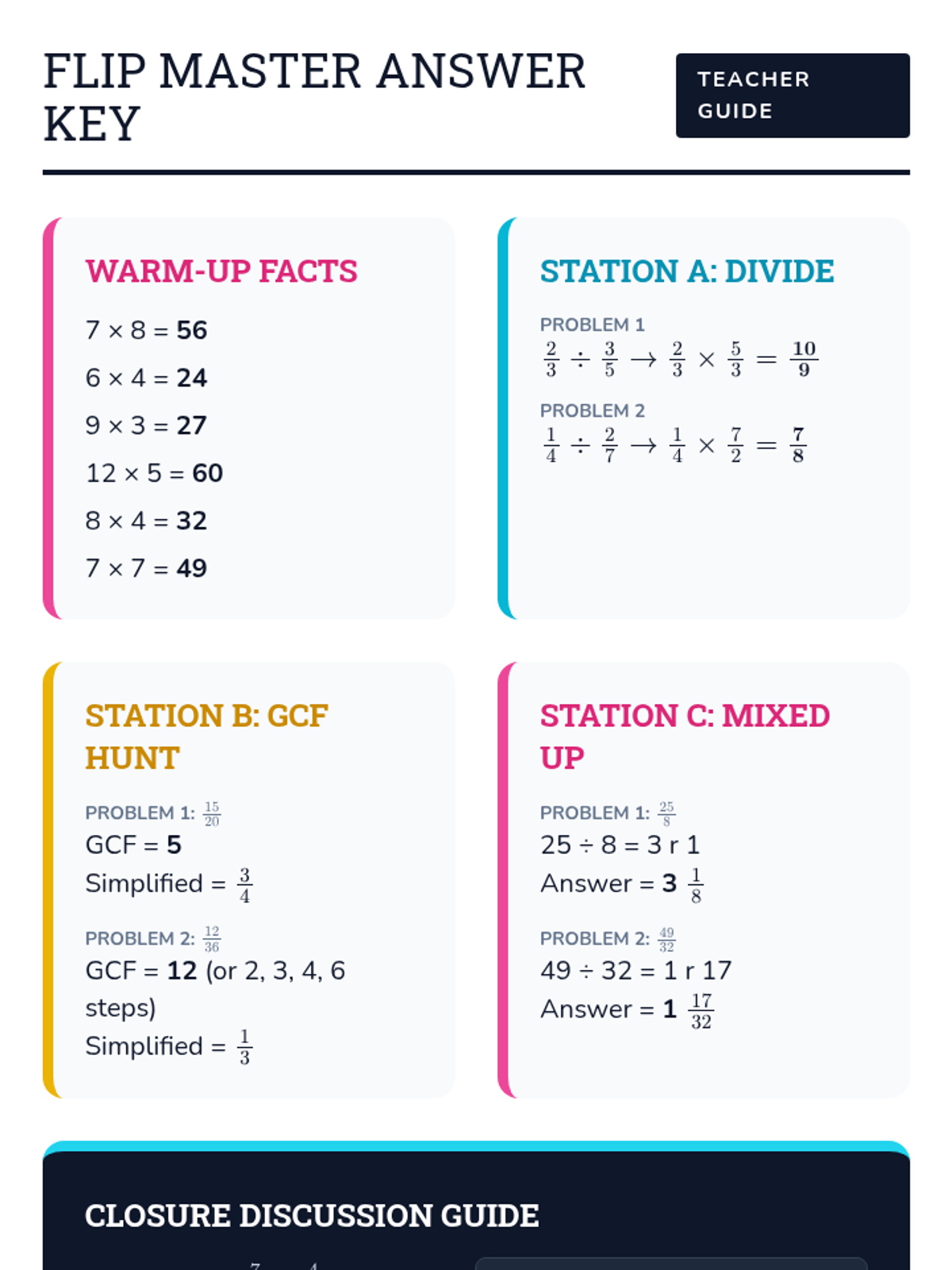 A comprehensive lesson on dividing fractions using the 'Keep, Change, Flip' algorithm, featuring simplification through GCF and improper-to-mixed number conversion. Includes a blackboard-themed slide deck, rotation station cards, a student scratch pad, and a teacher answer key.