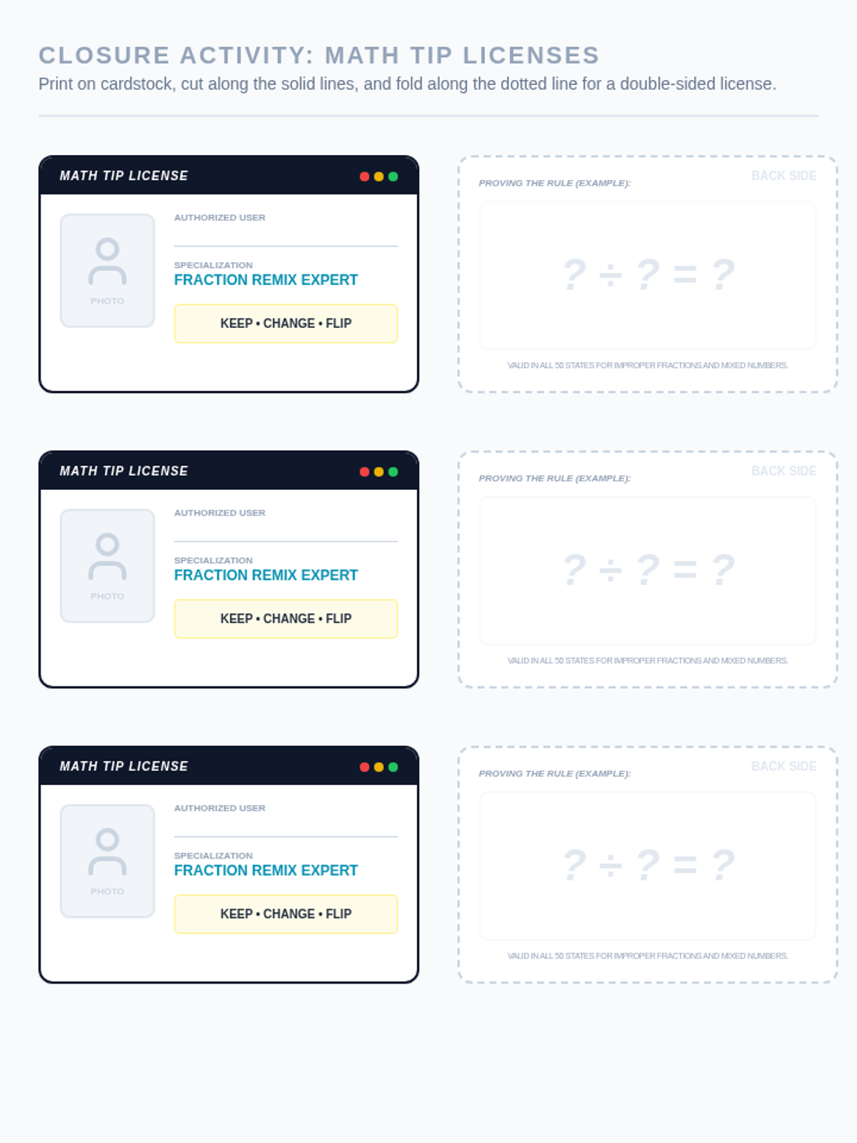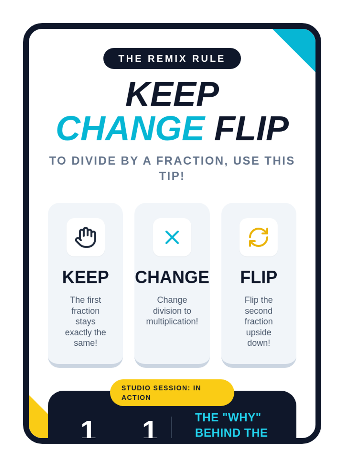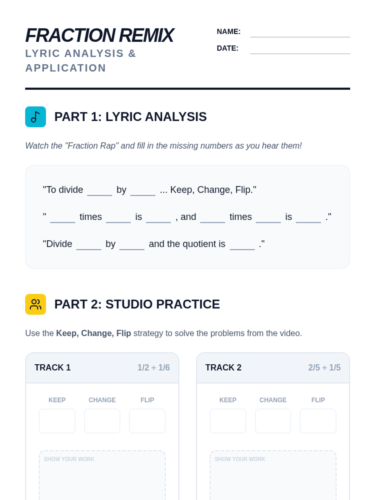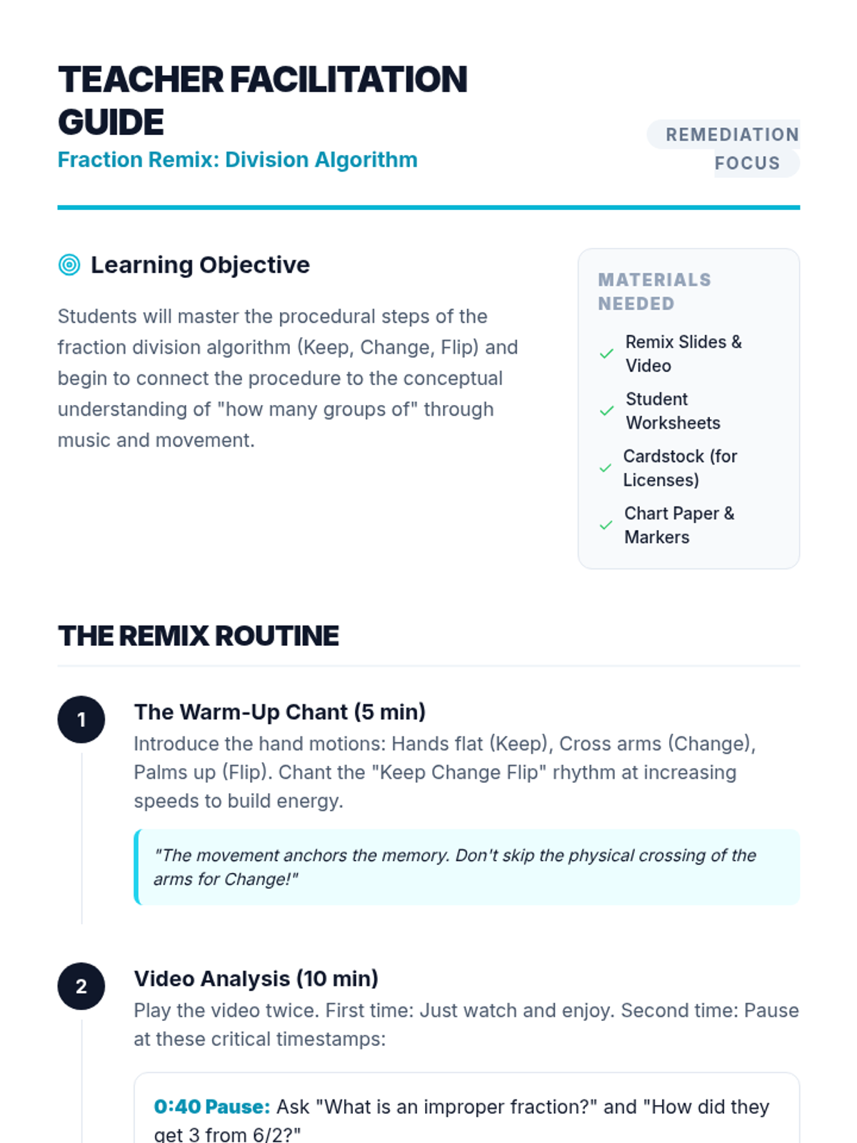 A high-energy remediation lesson using music and movement to master the 'Keep, Change, Flip' algorithm for dividing fractions. Students analyze song lyrics, solve modeled problems, and create personal 'Math Tip Licenses' for retention.