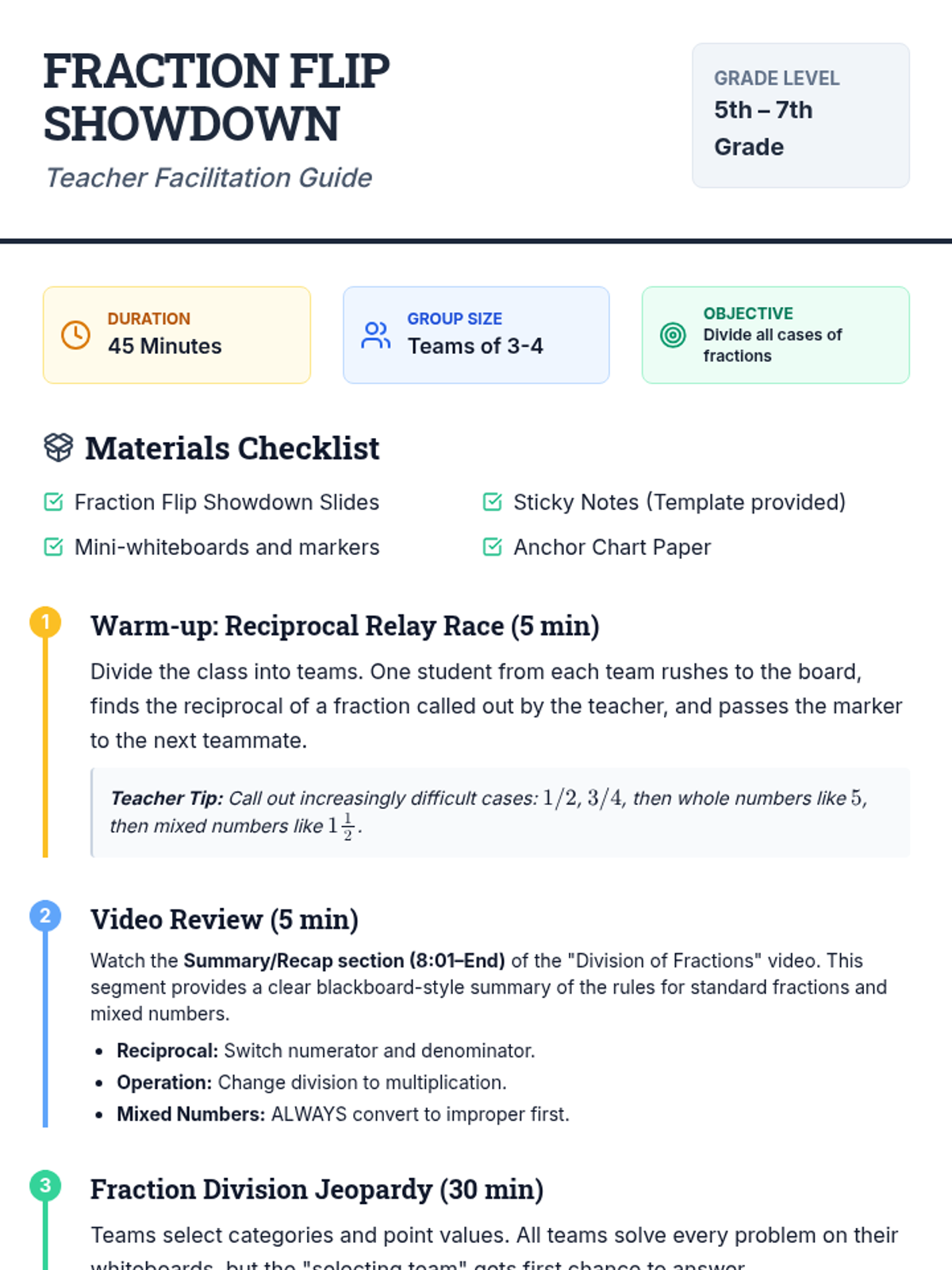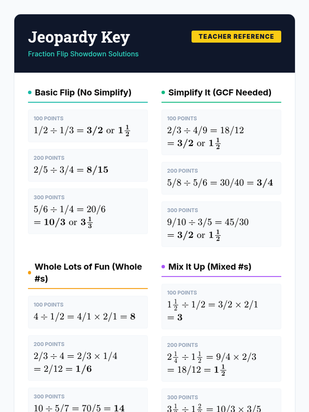 A collaborative lesson covering all cases of fraction division through a fast-paced relay warm-up and a Jeopardy-style game. Students master basic reciprocals, simplification, whole numbers, and mixed numbers.