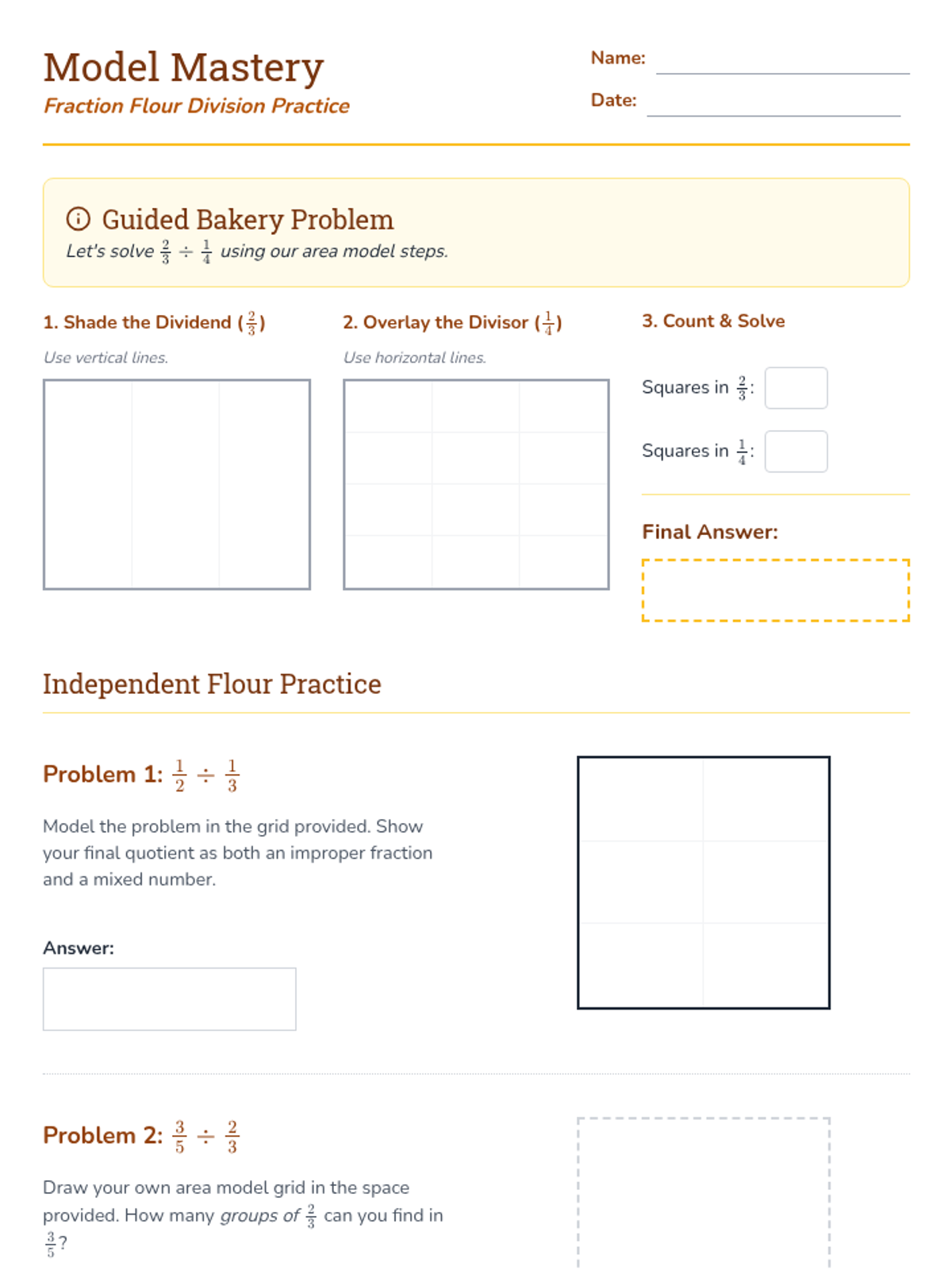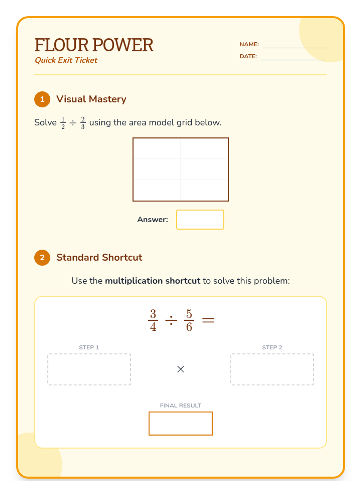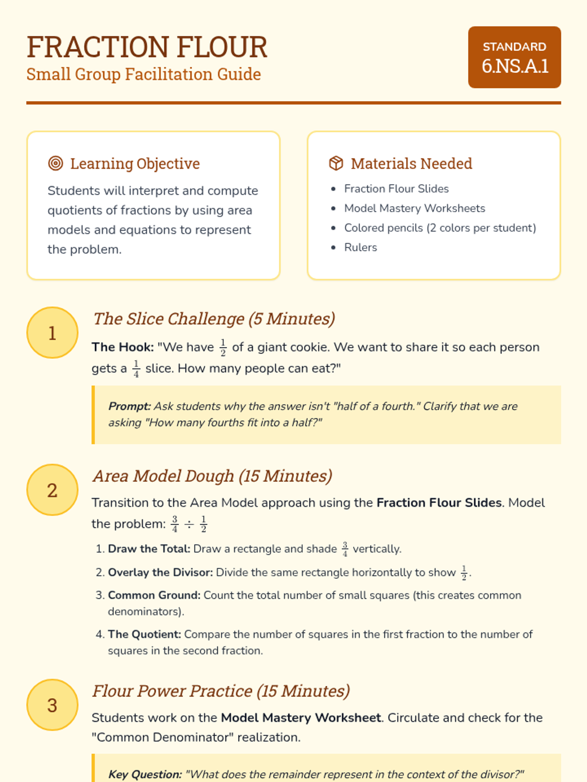 A targeted small group intervention for 6th graders focused on conceptualizing and calculating fraction division using area models. Students will progress from visual representations to the standard algorithm.