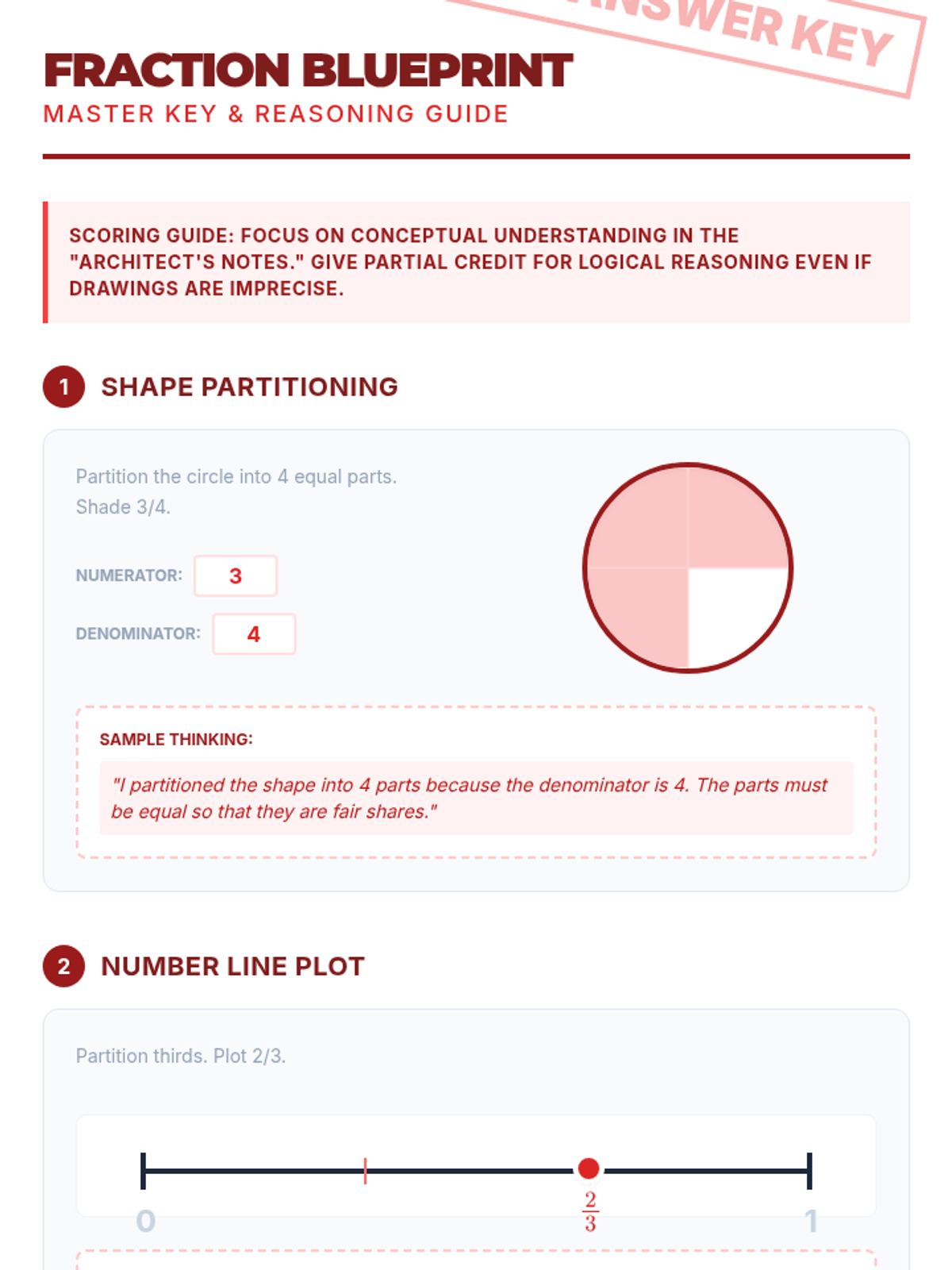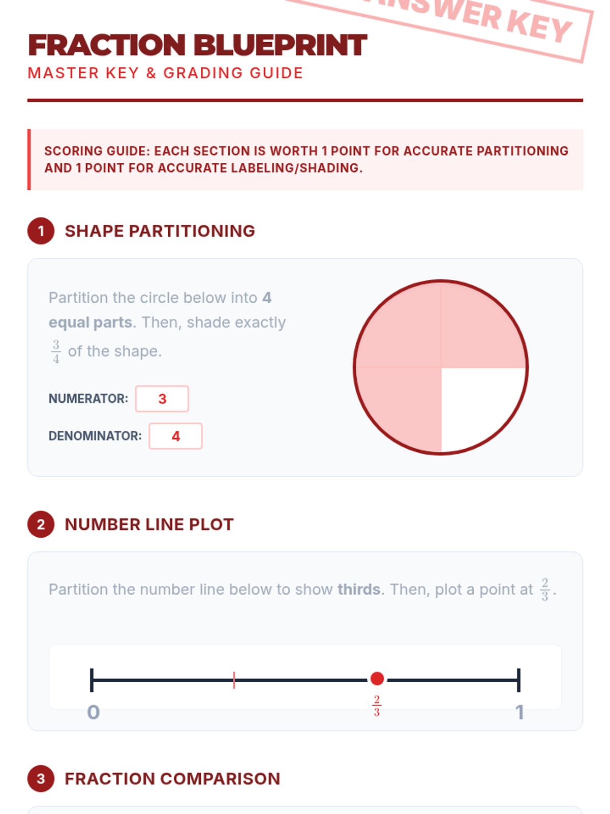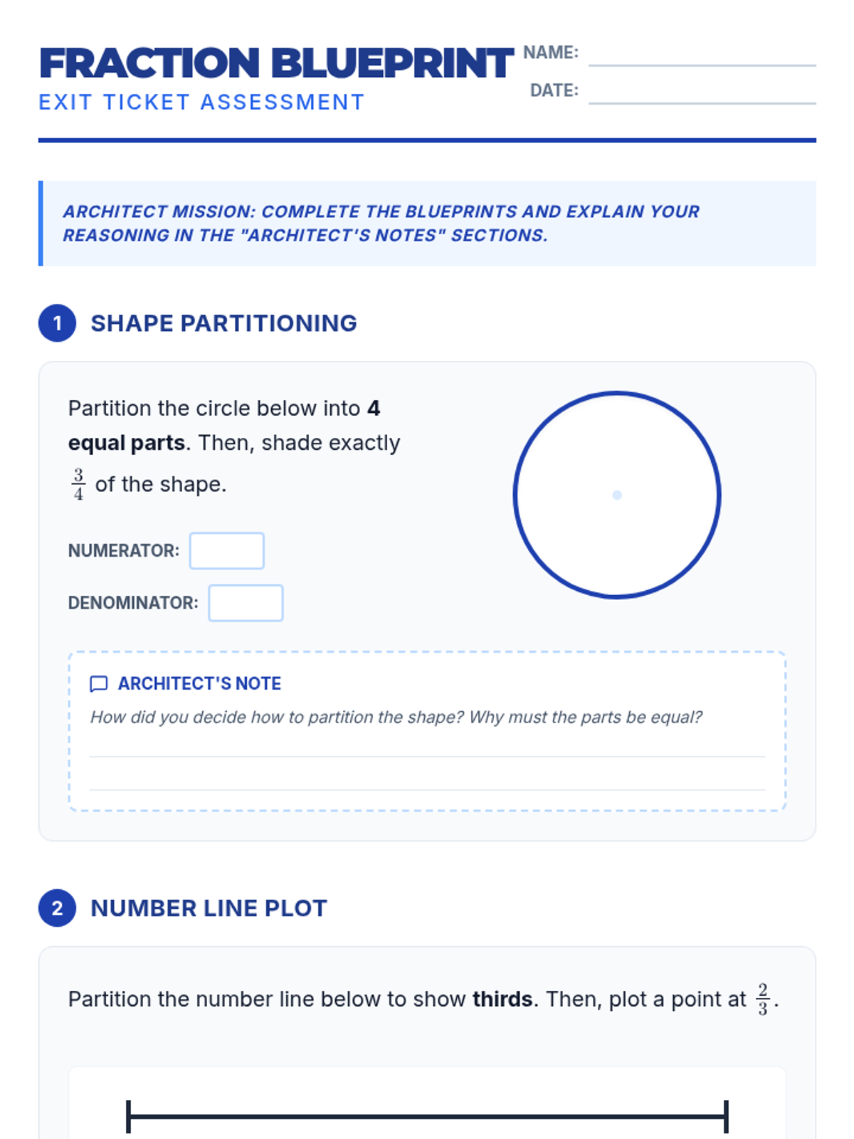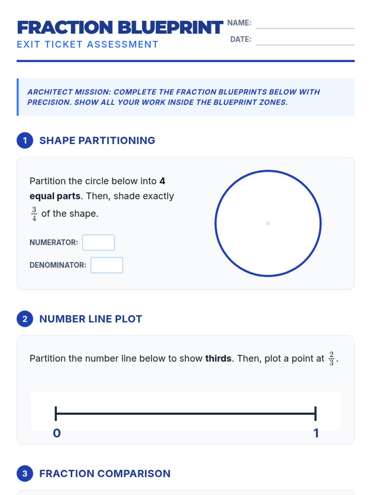 A quick assessment lesson focused on 3rd-grade Common Core fraction standards, including partitioning shapes, number line representation, and basic comparison.