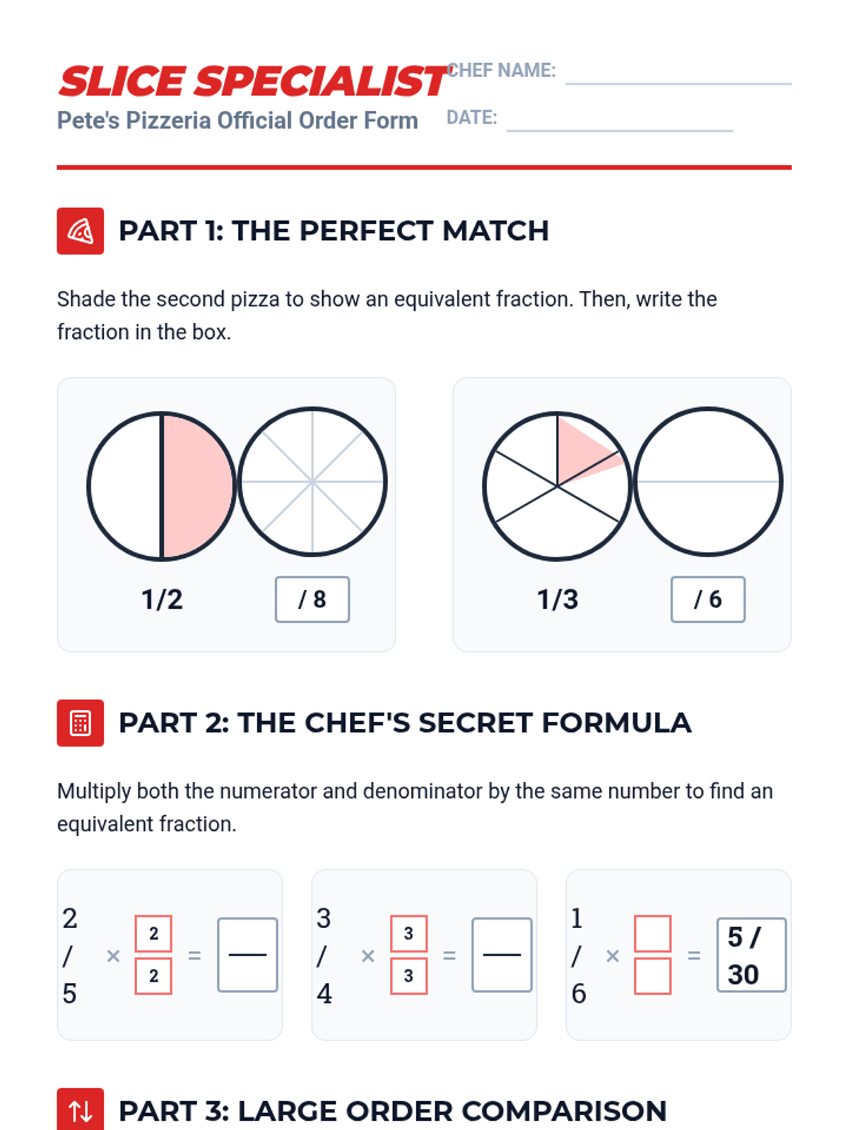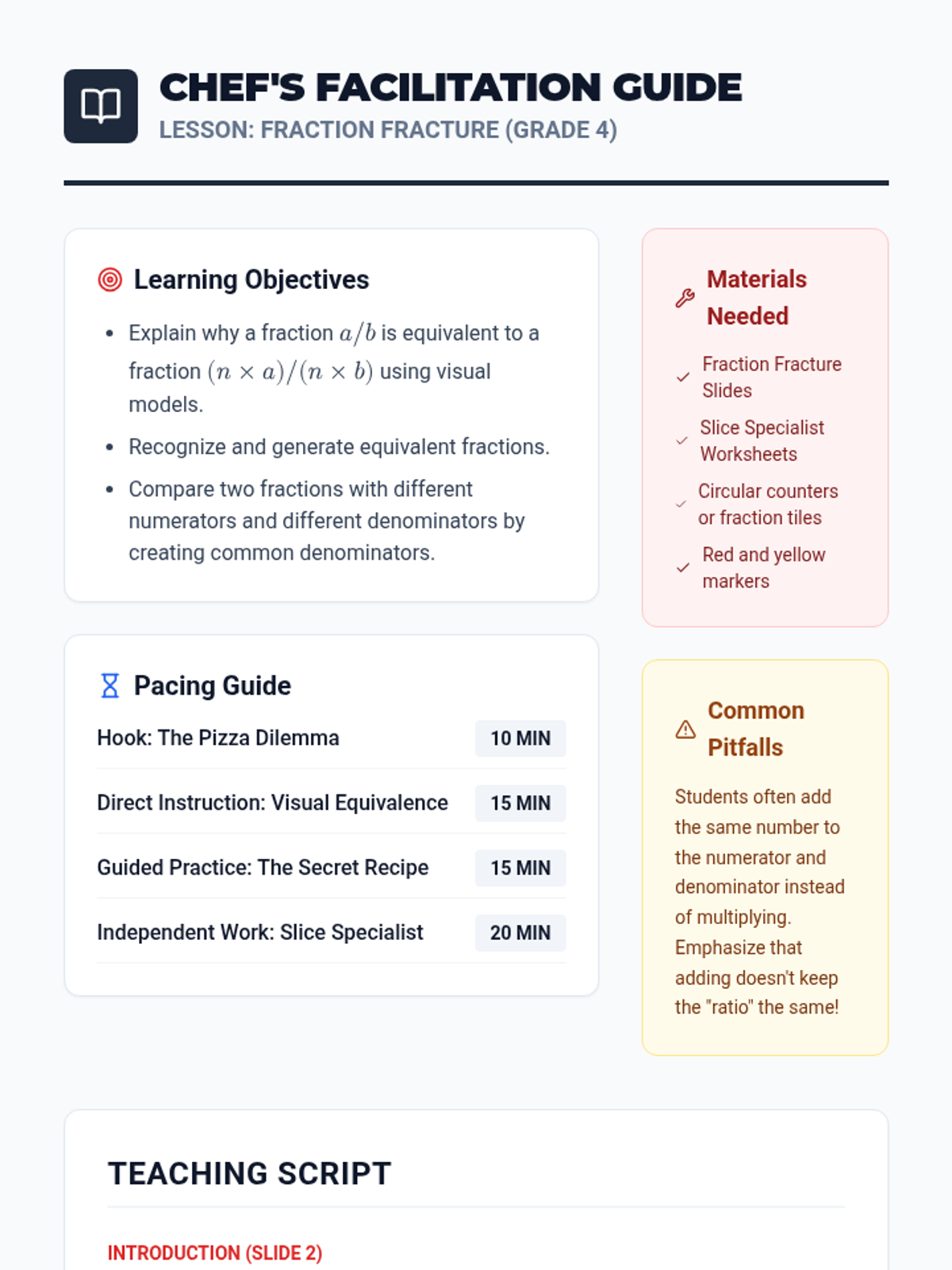 A 4th-grade lesson focusing on identifying equivalent fractions and comparing fractions with different denominators through a pizza-themed lens. Students will use visual models and mathematical strategies to master fraction concepts.