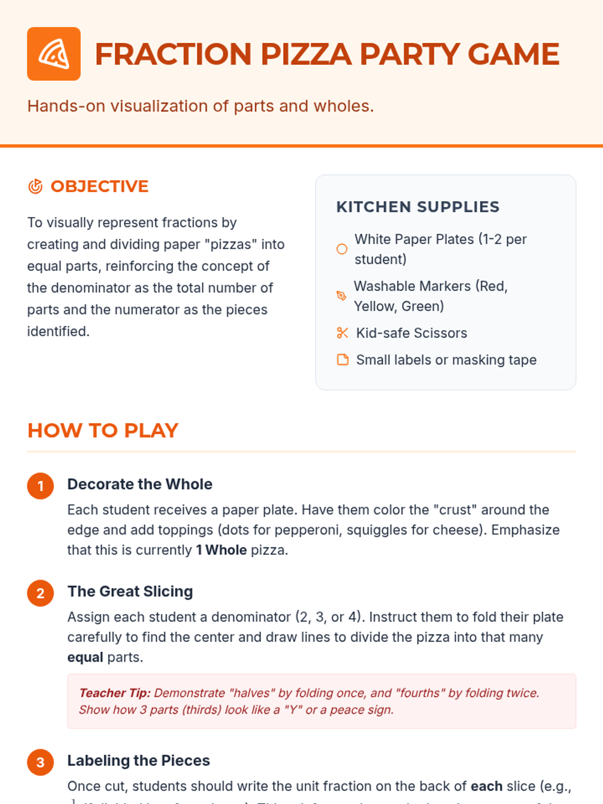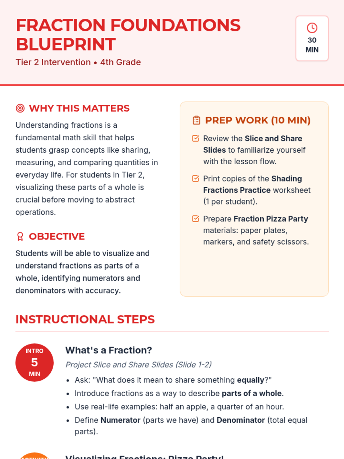 A targeted Tier 2 intervention lesson for 4th graders to visualize fractions using a pizza parlor theme. Students explore numerators and denominators through hands-on pizza slicing and shading practice.
