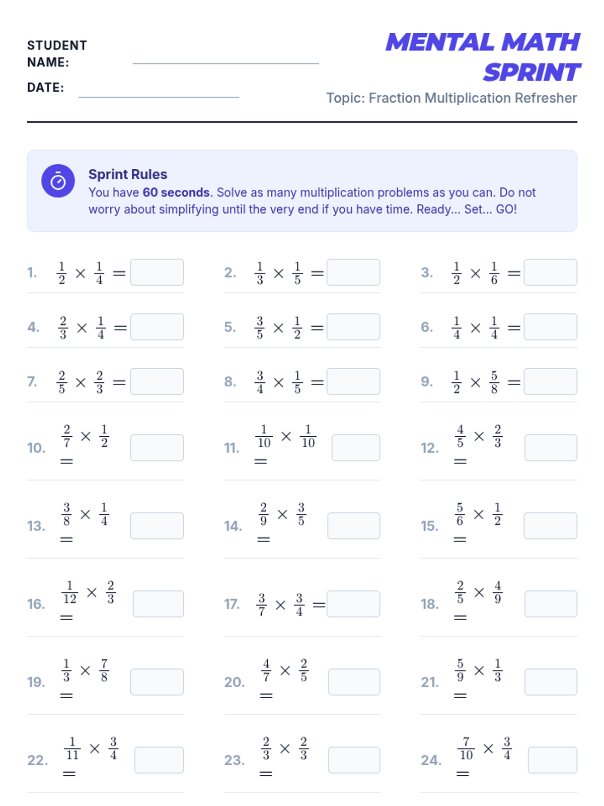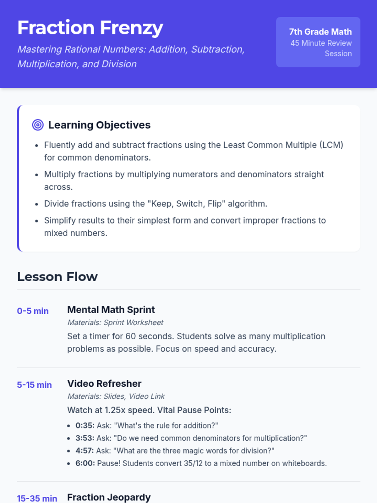 A fast-paced review of fraction operations (addition, subtraction, multiplication, and division) featuring a mental math sprint, a rapid-refresher video, and a high-energy Jeopardy-style game. Students will master finding common denominators, the 'Keep-Switch-Flip' method, and simplifying results.