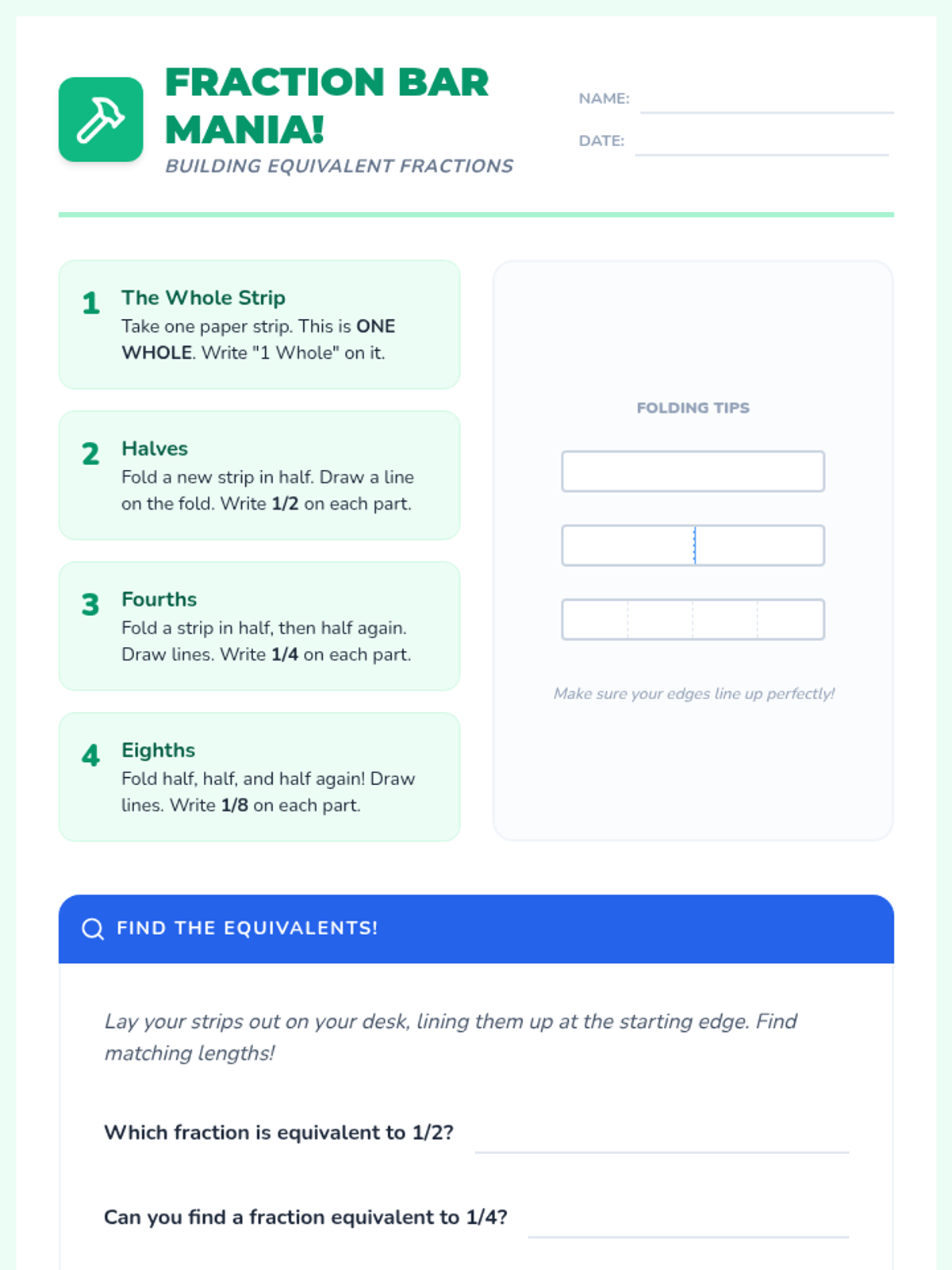 Focuses on thirds and sixths using length models (number lines) to find equivalent fractions.