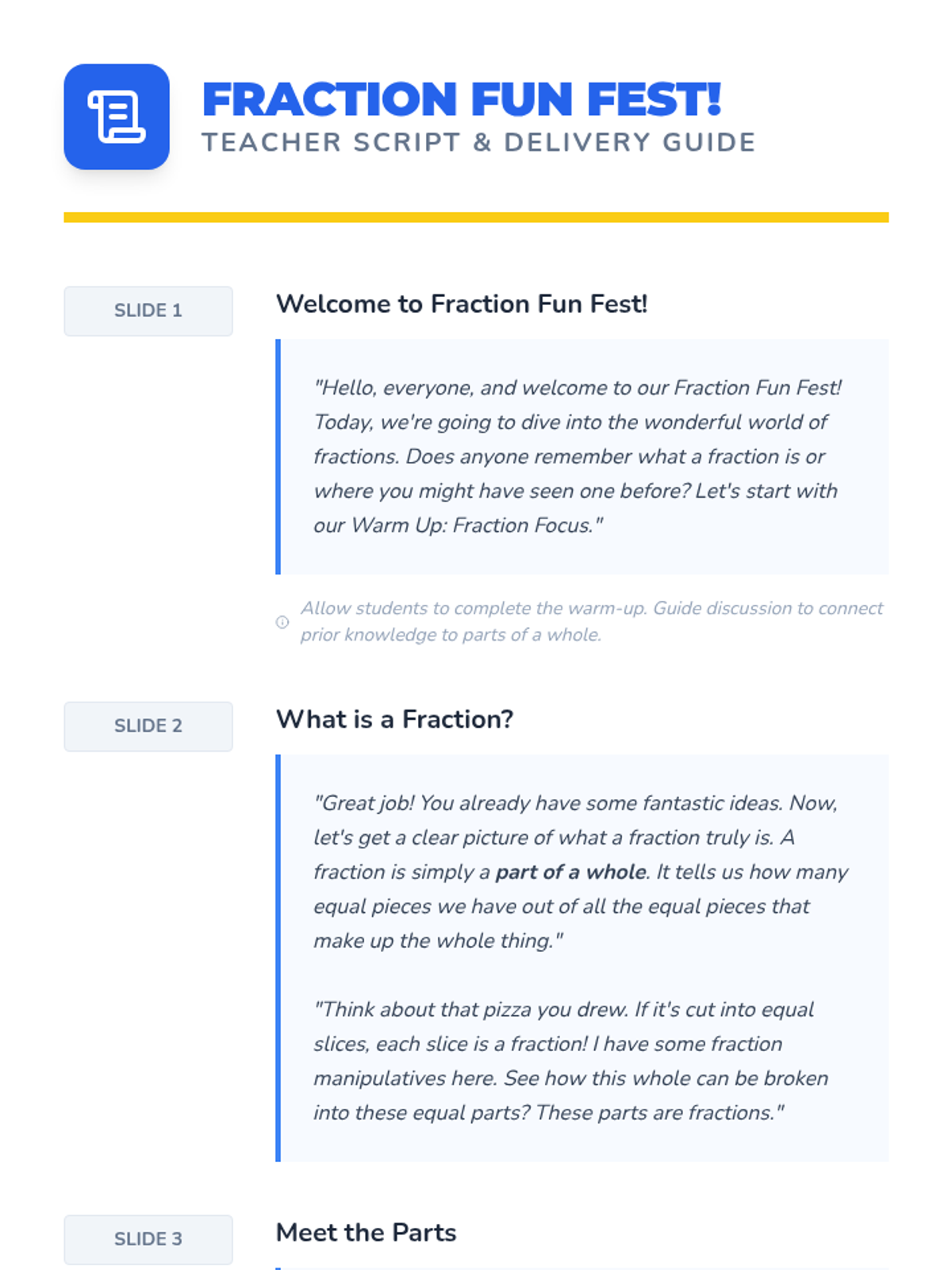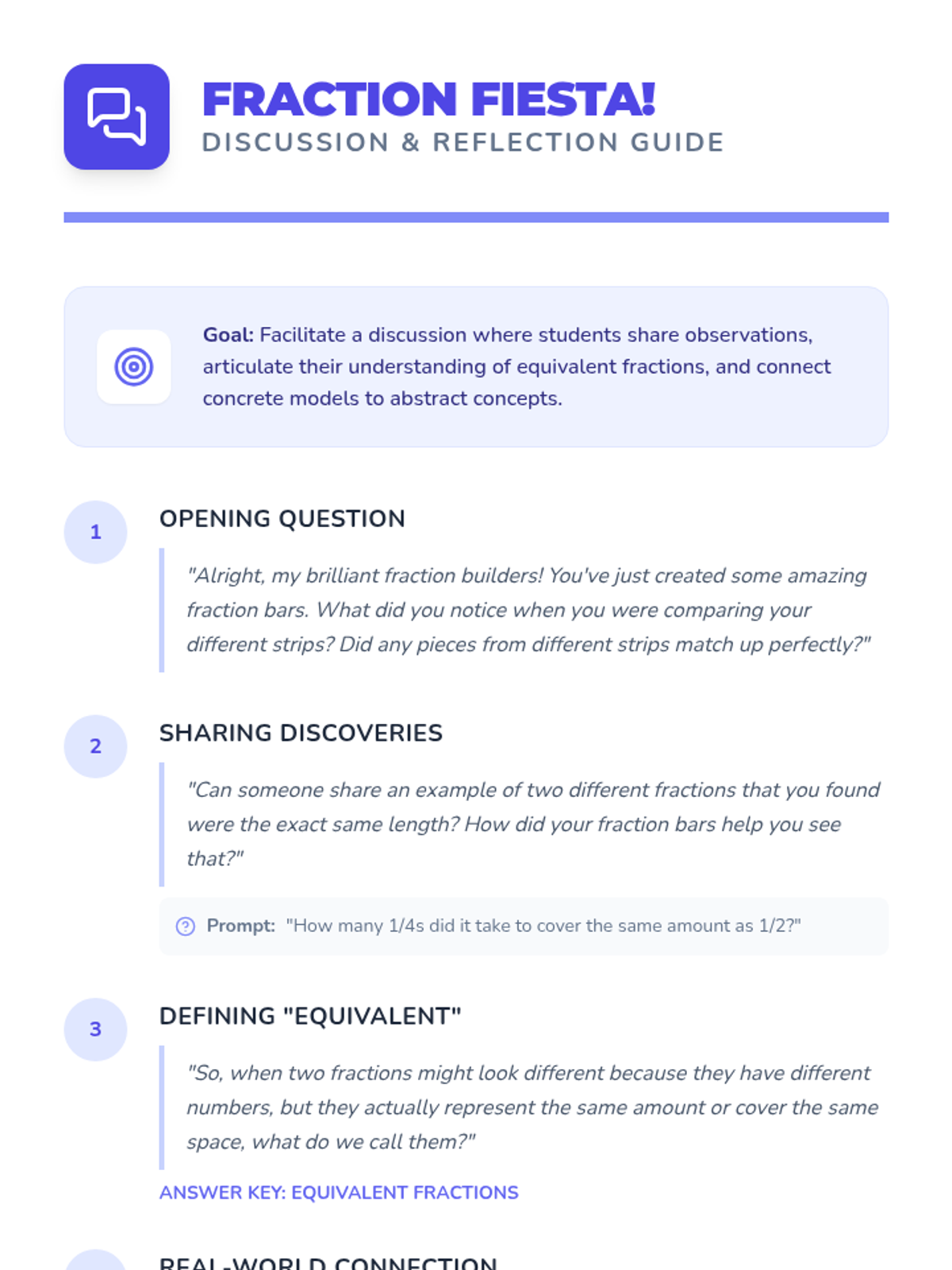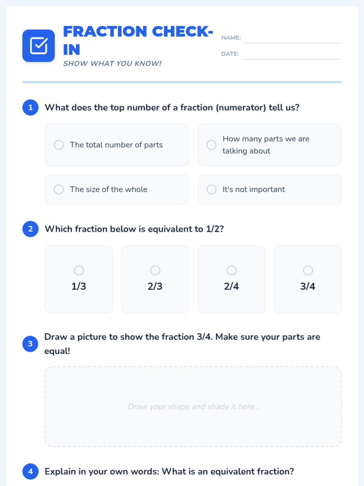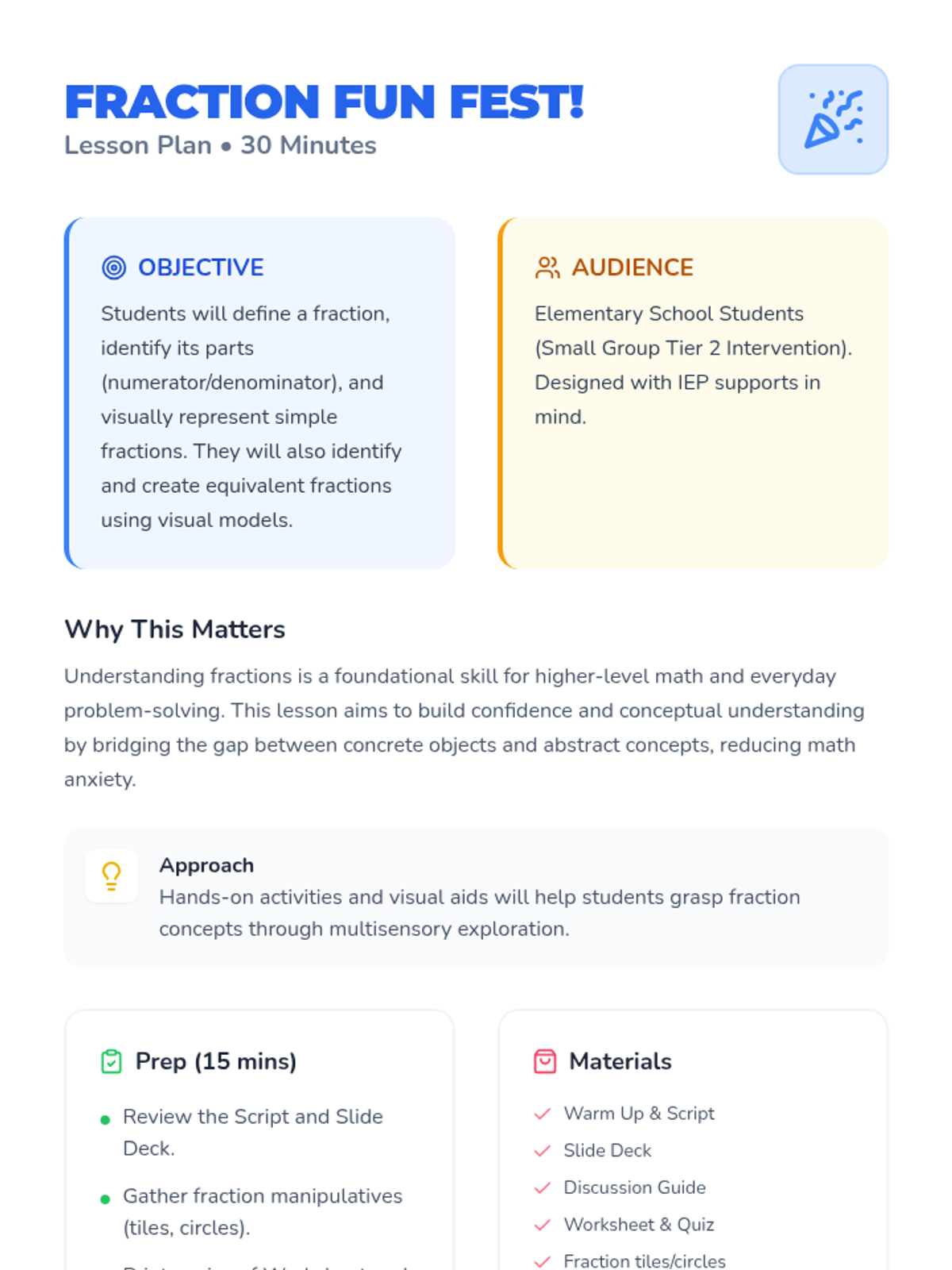 A 30-minute small-group intervention lesson focused on defining fractions and identifying equivalent fractions through visual and hands-on activities. Designed for elementary students with IEPs to build confidence and conceptual understanding.