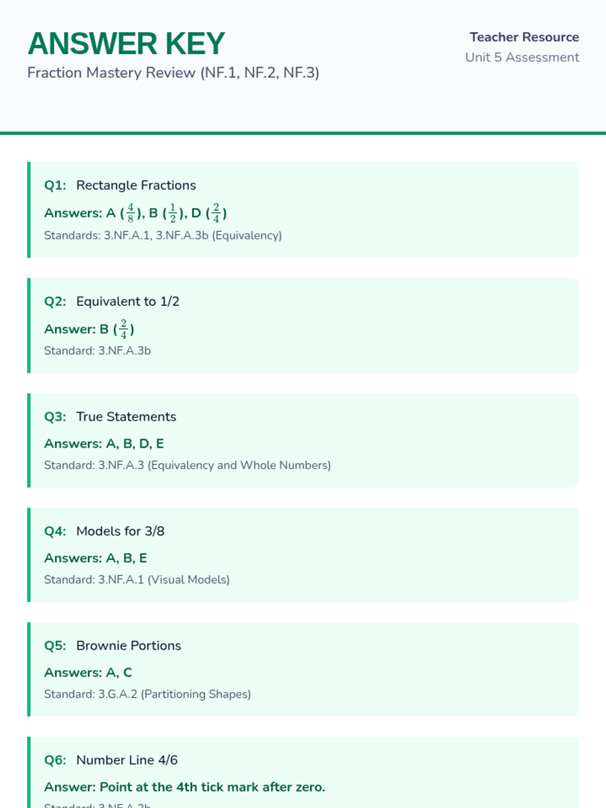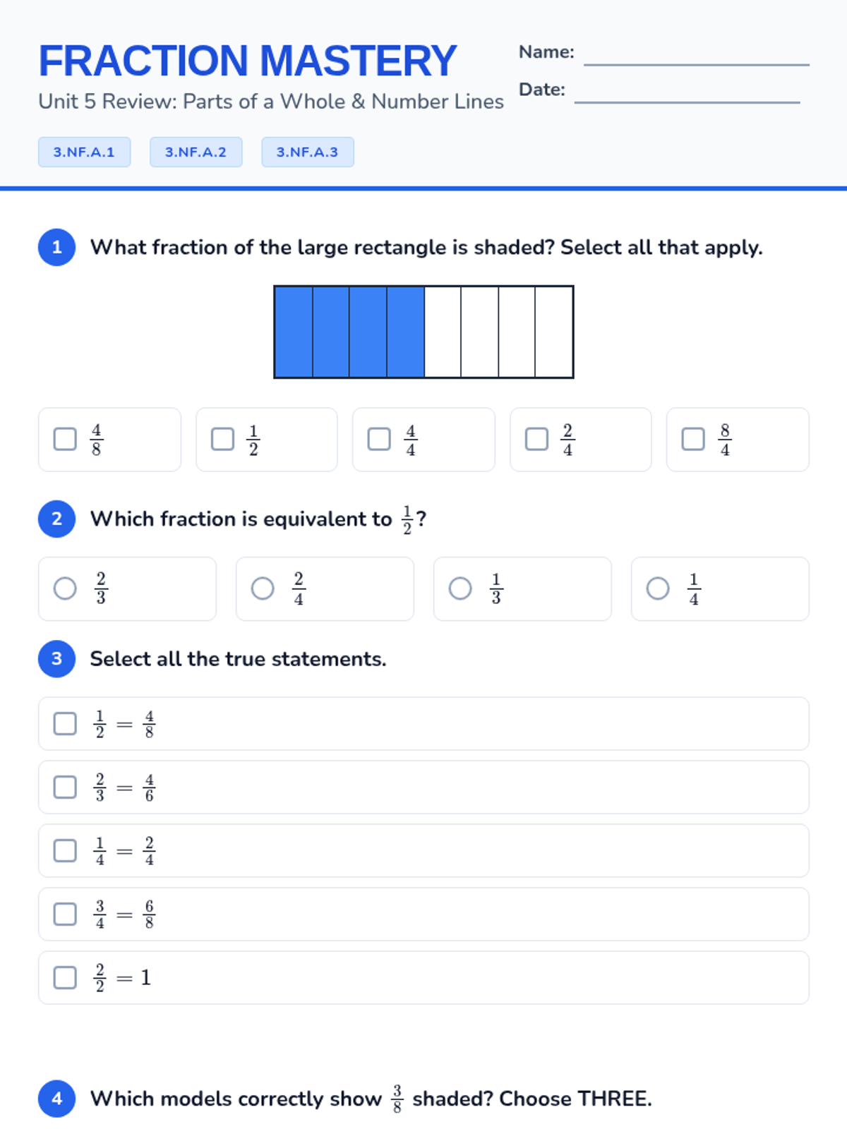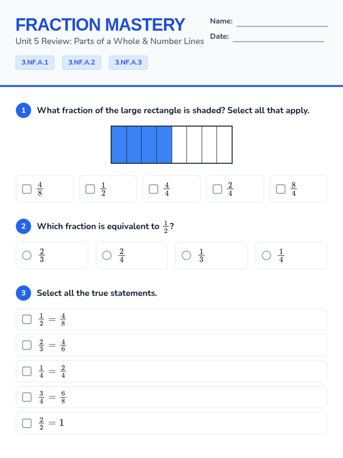 A comprehensive review of 3rd-grade fraction standards (3.NF.A.1, 3.NF.A.2, 3.NF.A.3), covering unit fractions, number lines, and equivalency.