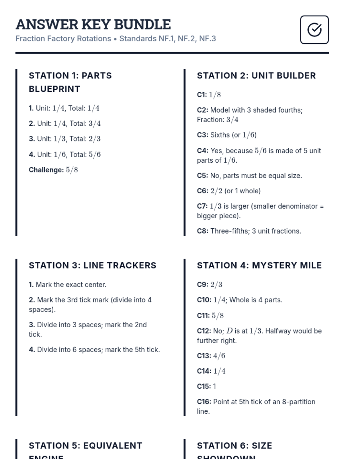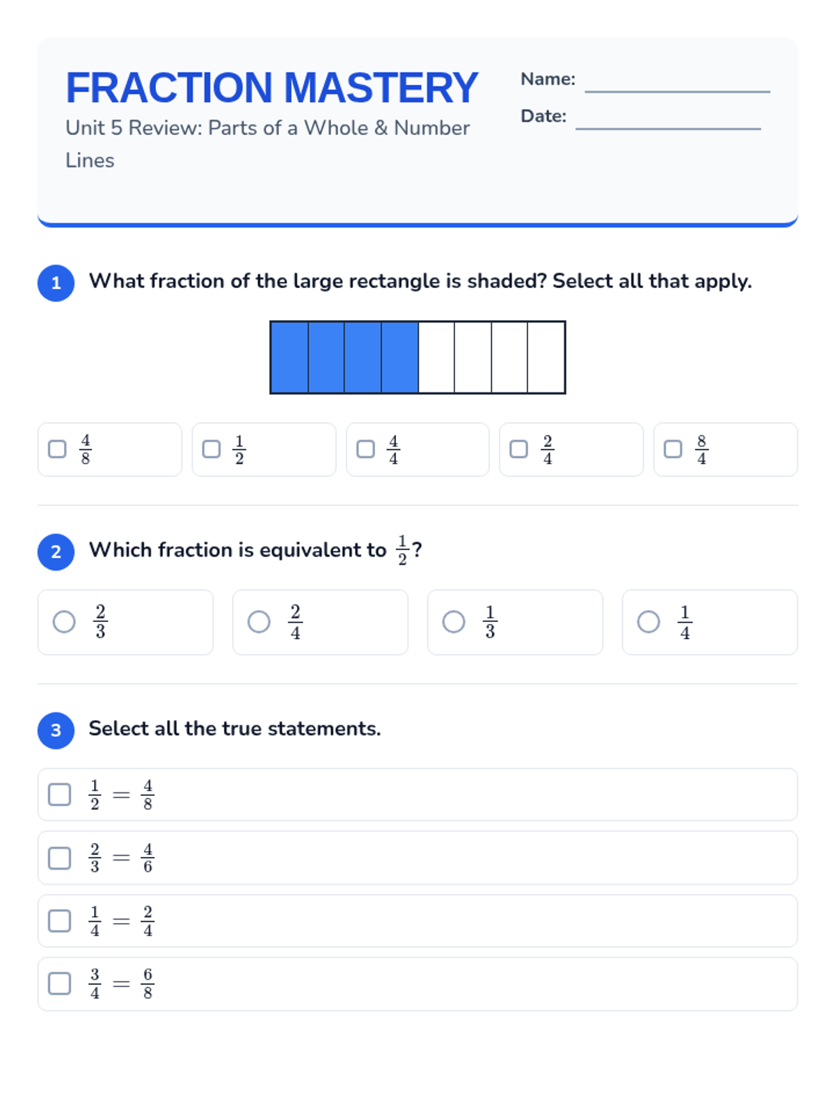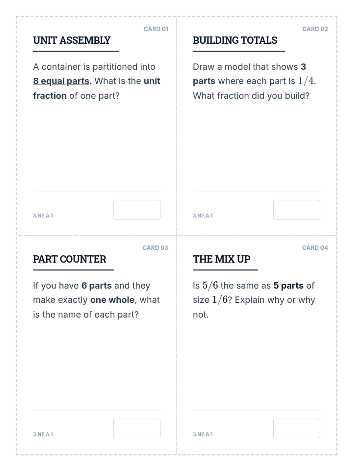 A comprehensive review of 3rd-grade fraction standards (3.NF.A.1, 3.NF.A.2, 3.NF.A.3), covering unit fractions, number lines, and equivalency.