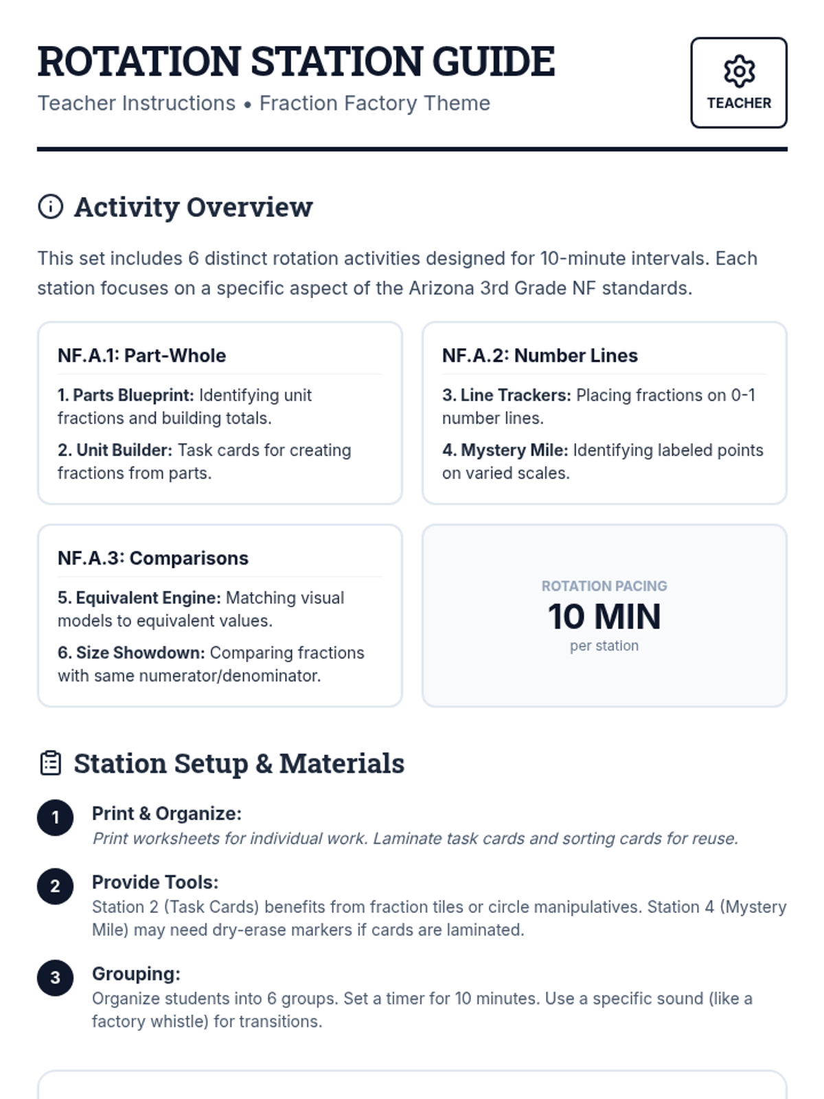 A collection of six high-energy rotation activities covering 3rd-grade Arizona math standards for fractions (NF.1, NF.2, and NF.3). Students engage with partitioning, number lines, equivalence, and comparison through worksheets, task cards, and hands-on sorting.