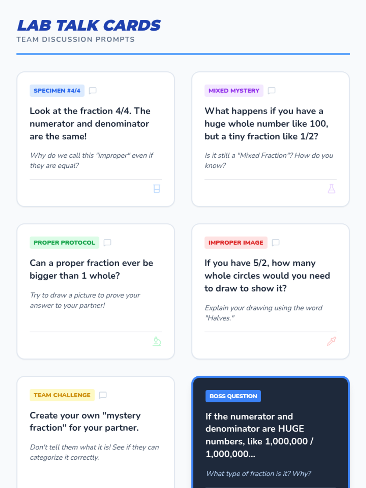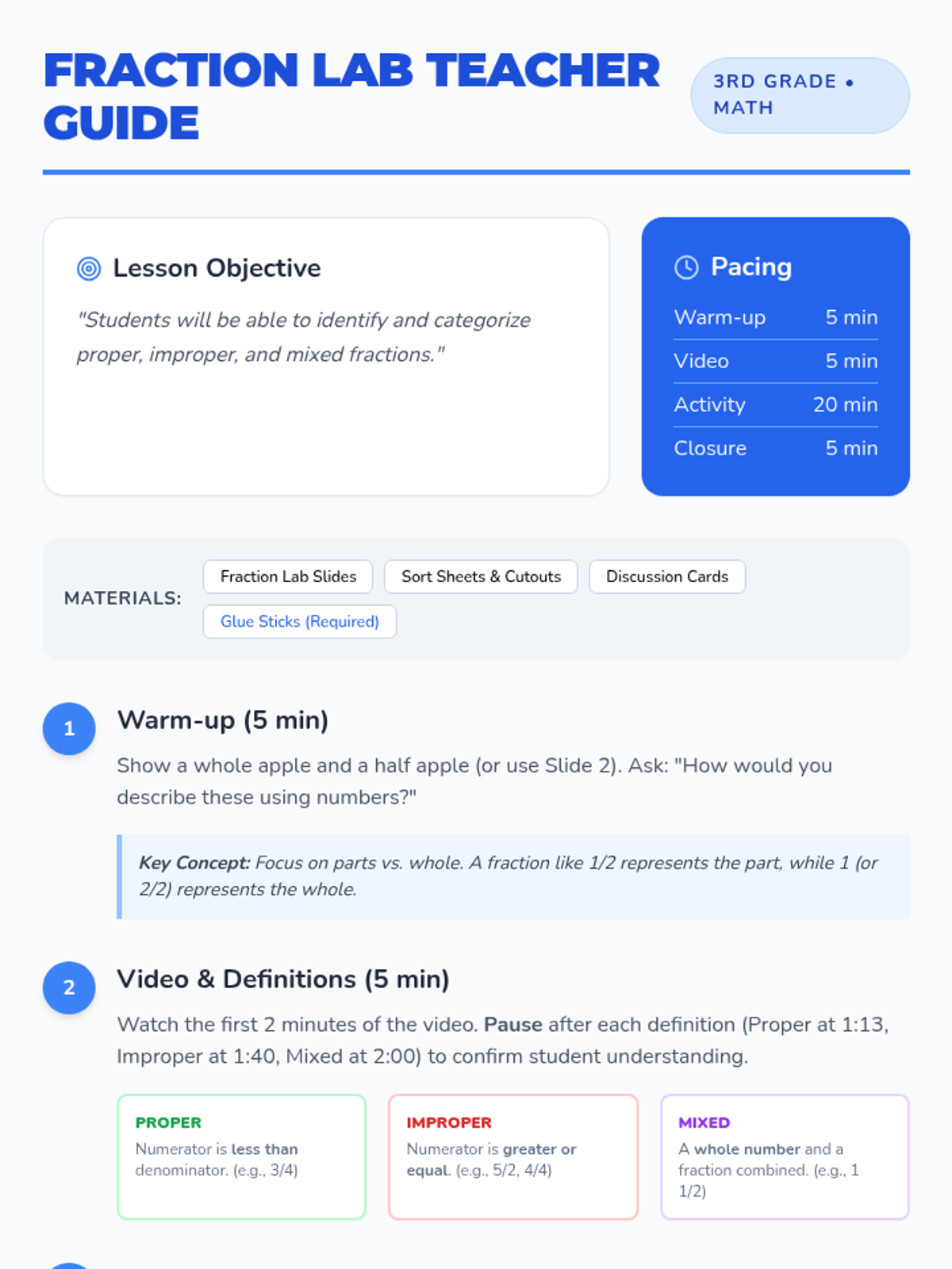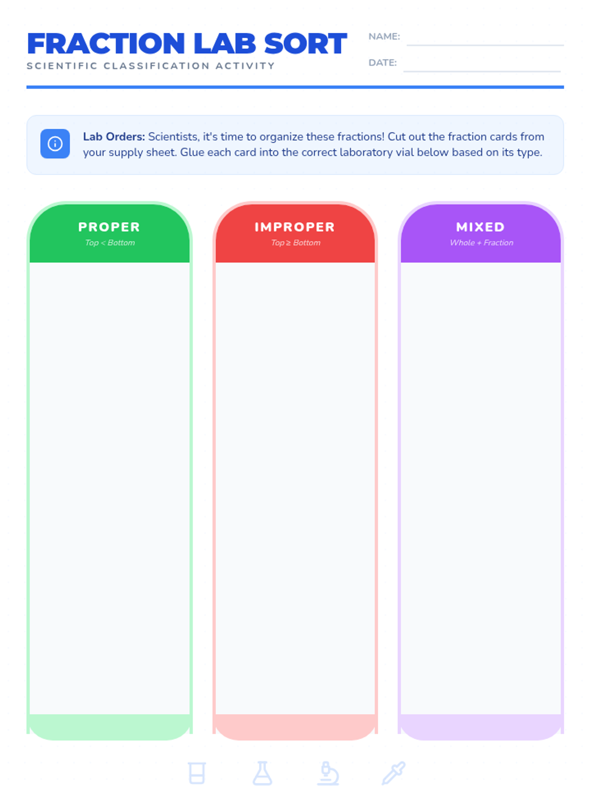 Students will learn to differentiate between proper, improper, and mixed fractions using visual models and a hands-on sorting activity. The lesson utilizes a 'Fraction Lab' theme to make categorization engaging and scientific.