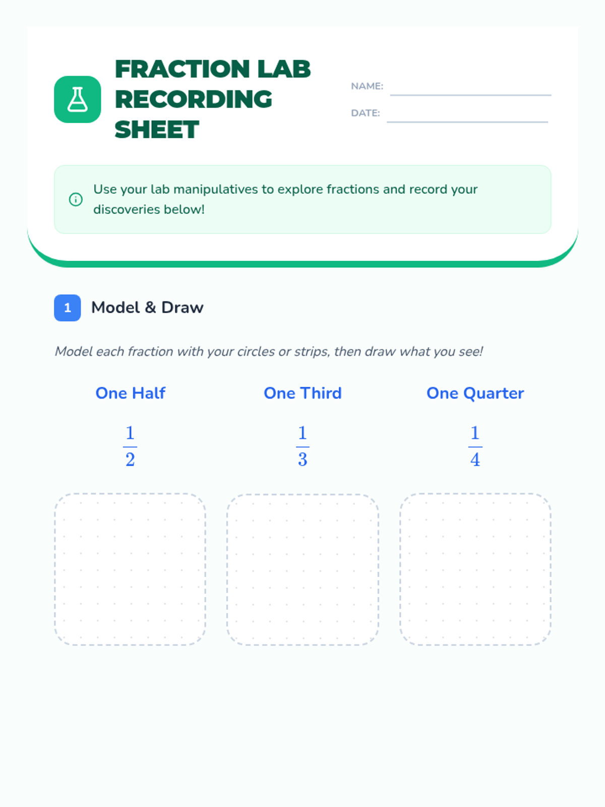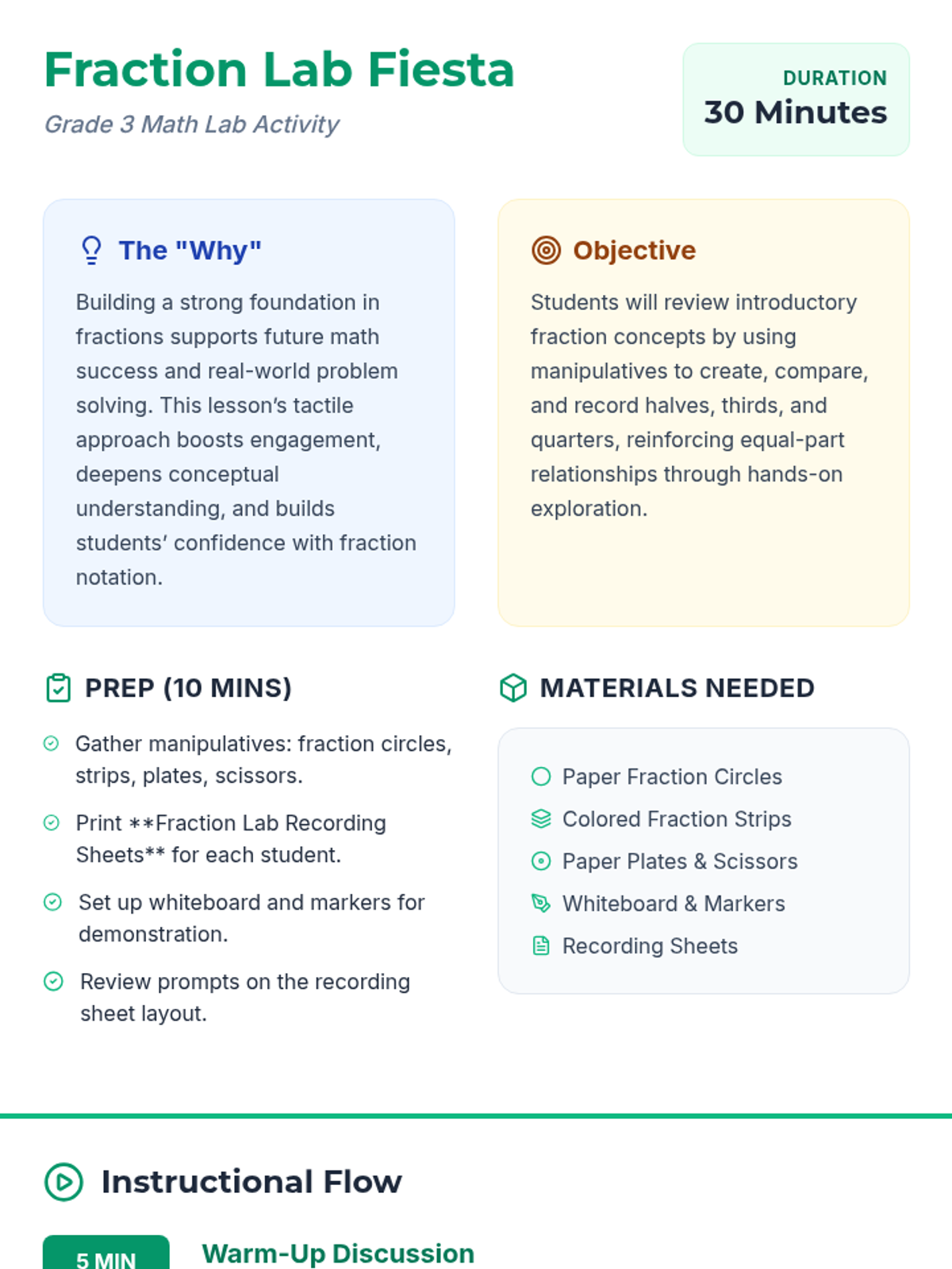 A hands-on Grade 3 math lab activity exploring halves, thirds, and quarters using manipulatives like fraction circles and strips. Students will model, compare, and record their findings in a collaborative 'lab' environment.