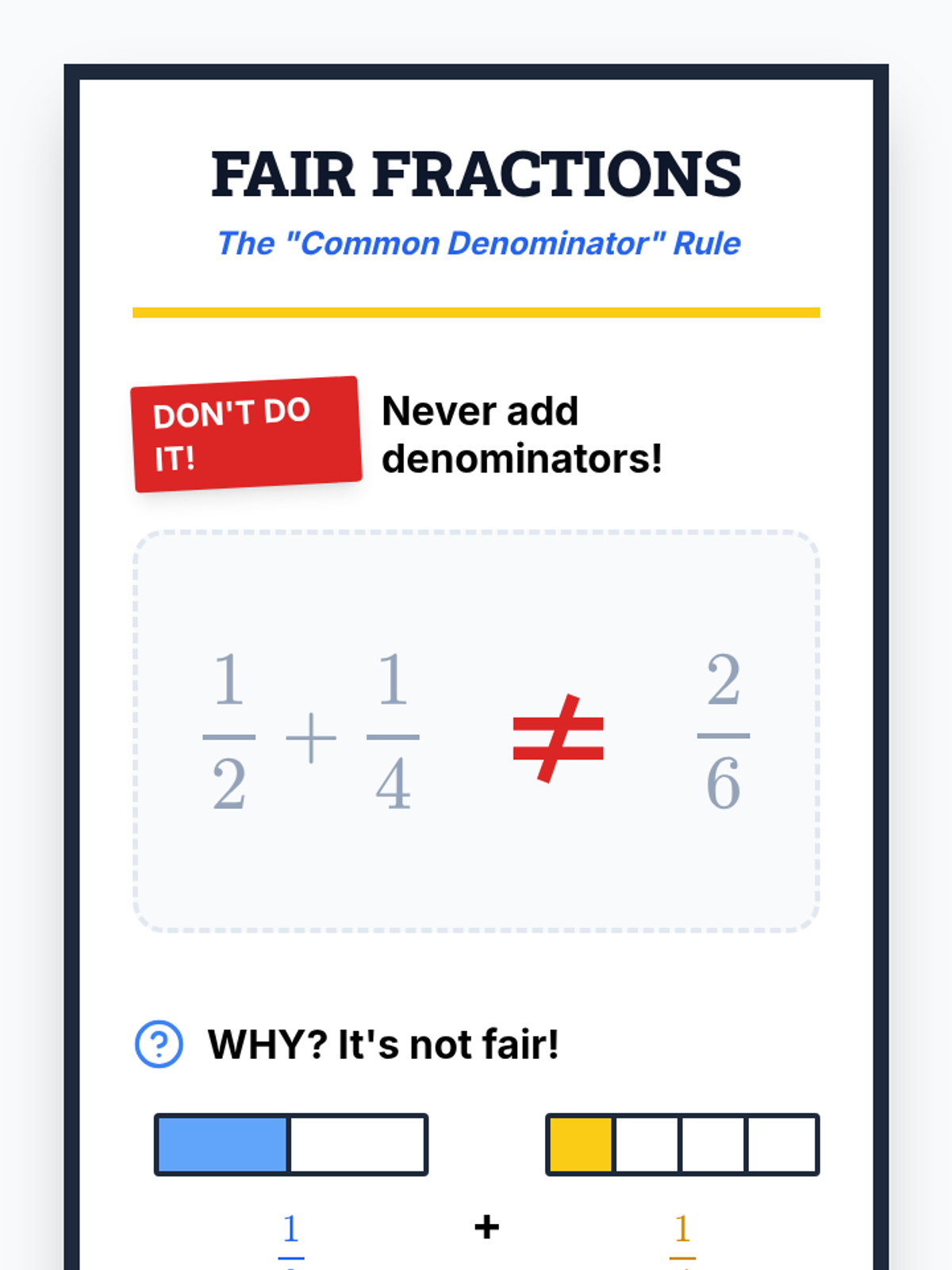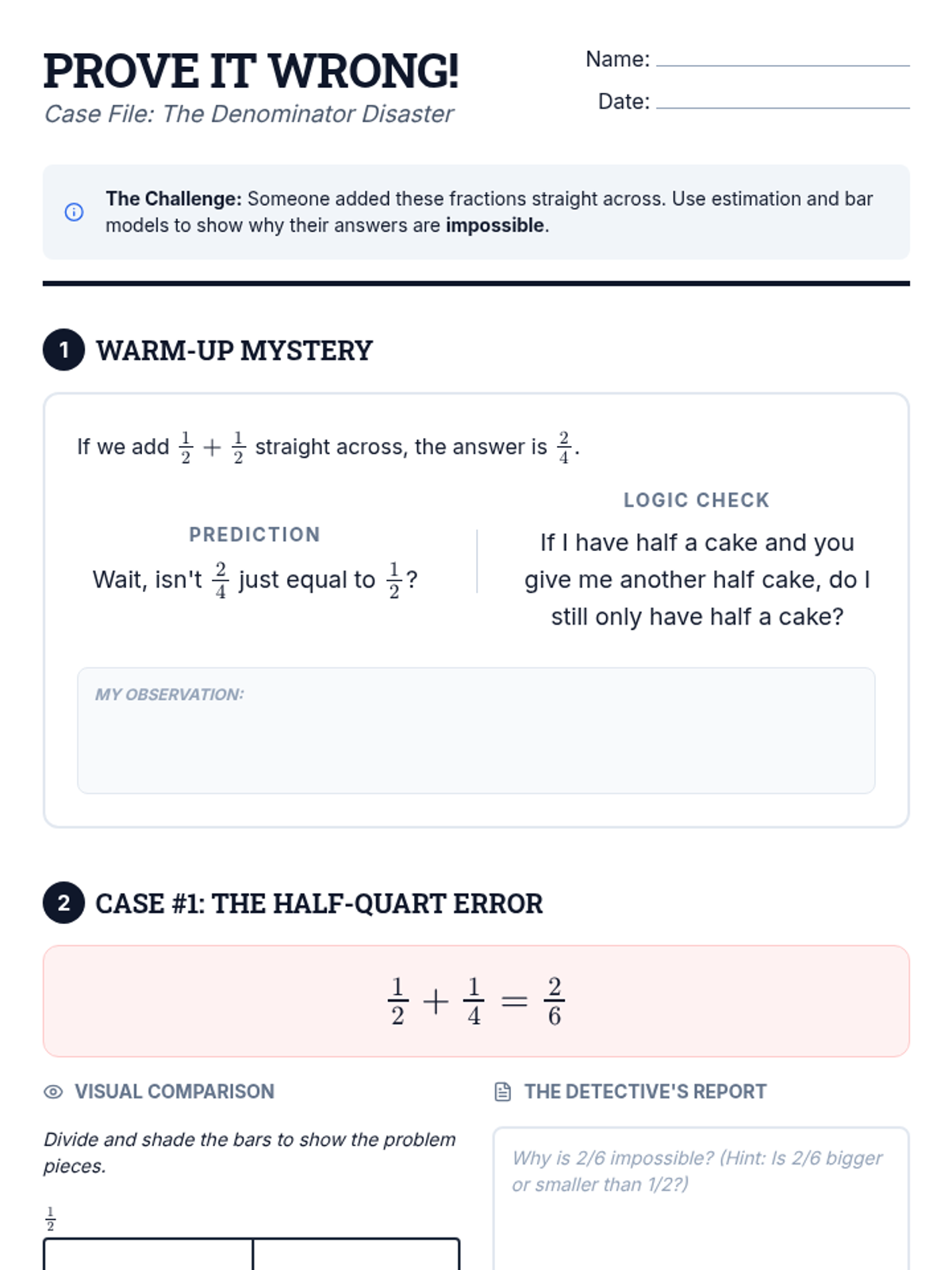 Students investigate the common misconception of adding numerators and denominators straight across, using visual models and estimation to prove why a common denominator is necessary for 'fair' addition.