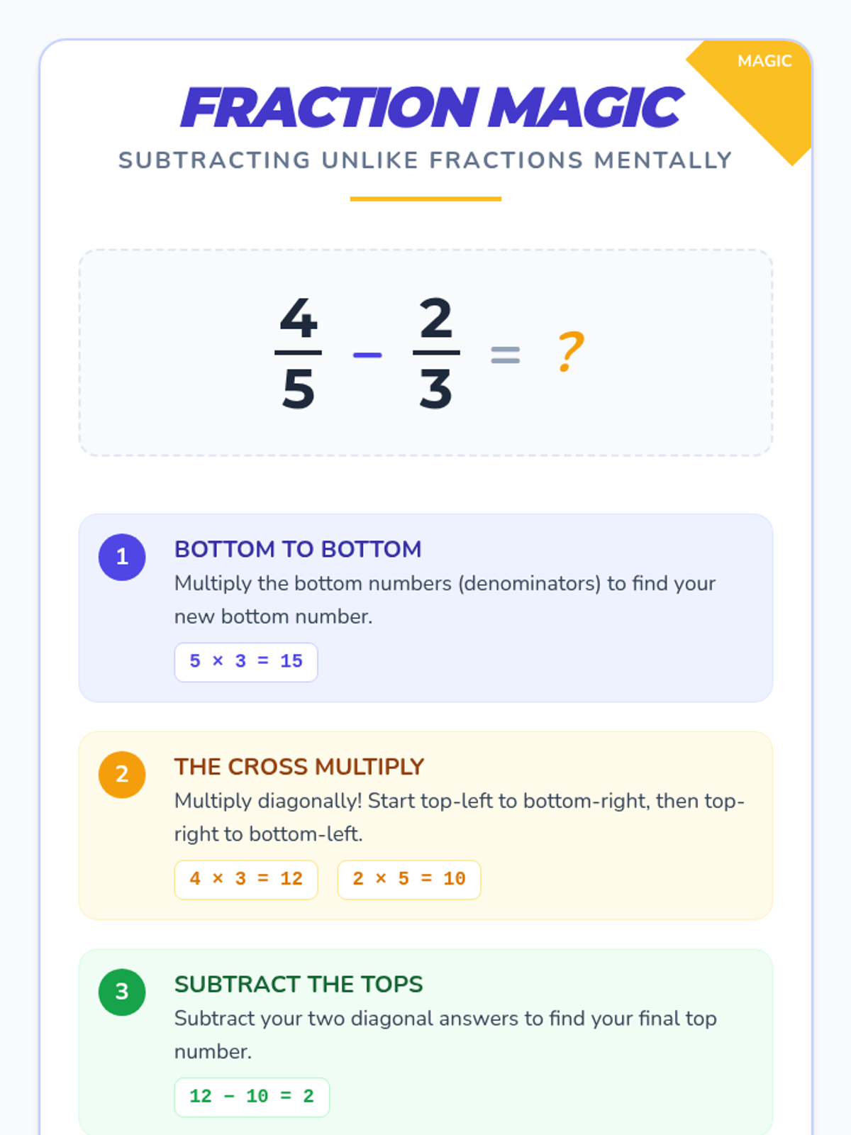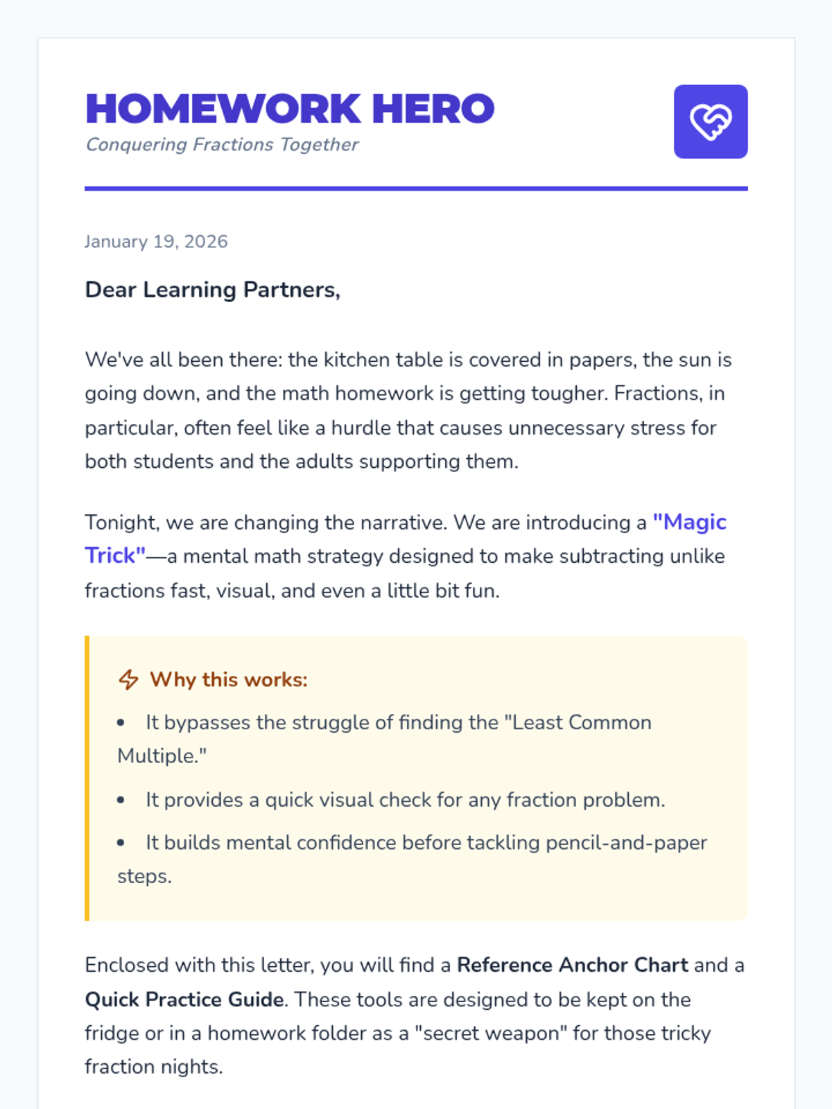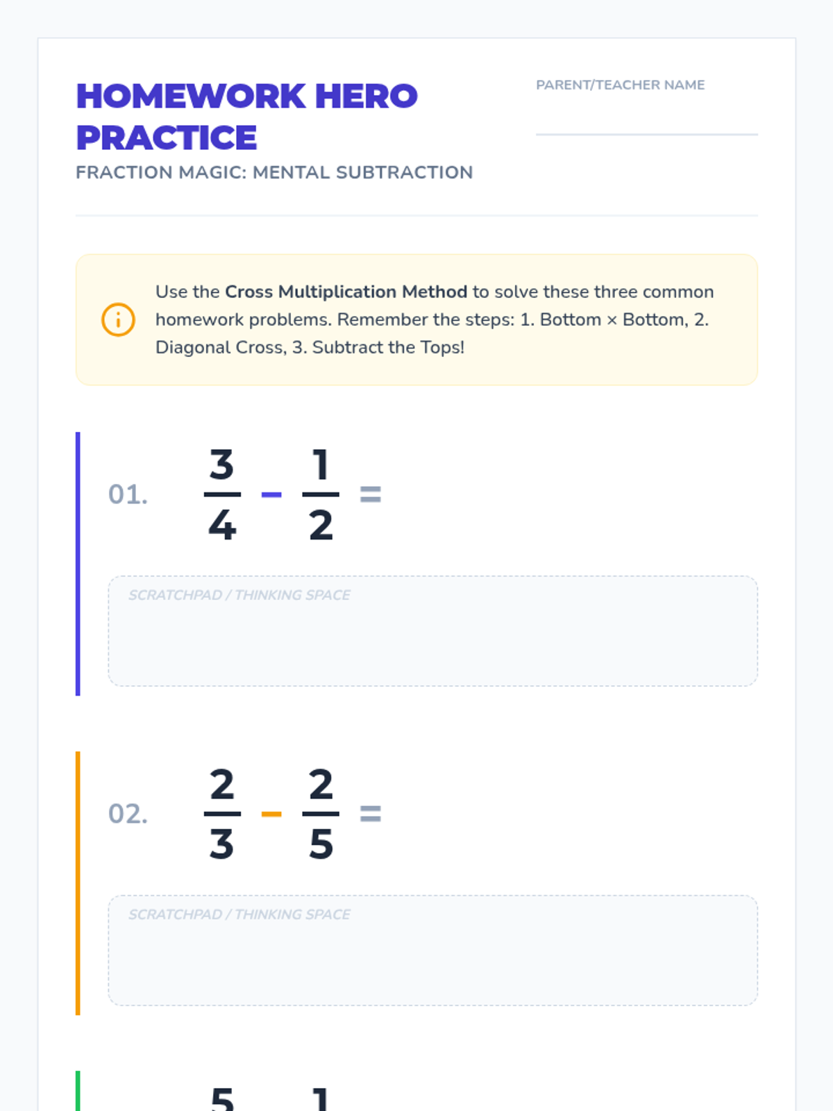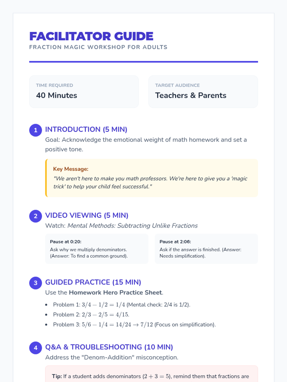 A workshop designed for parents and teachers to master a simple 'cross-multiplication' mental math strategy for subtracting unlike fractions, reducing homework frustration and building confidence.