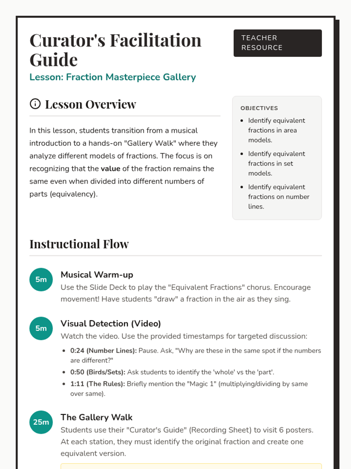 Students explore equivalent fractions using area, set, and linear models through a musical introduction and an interactive classroom 'Gallery Walk' activity.
