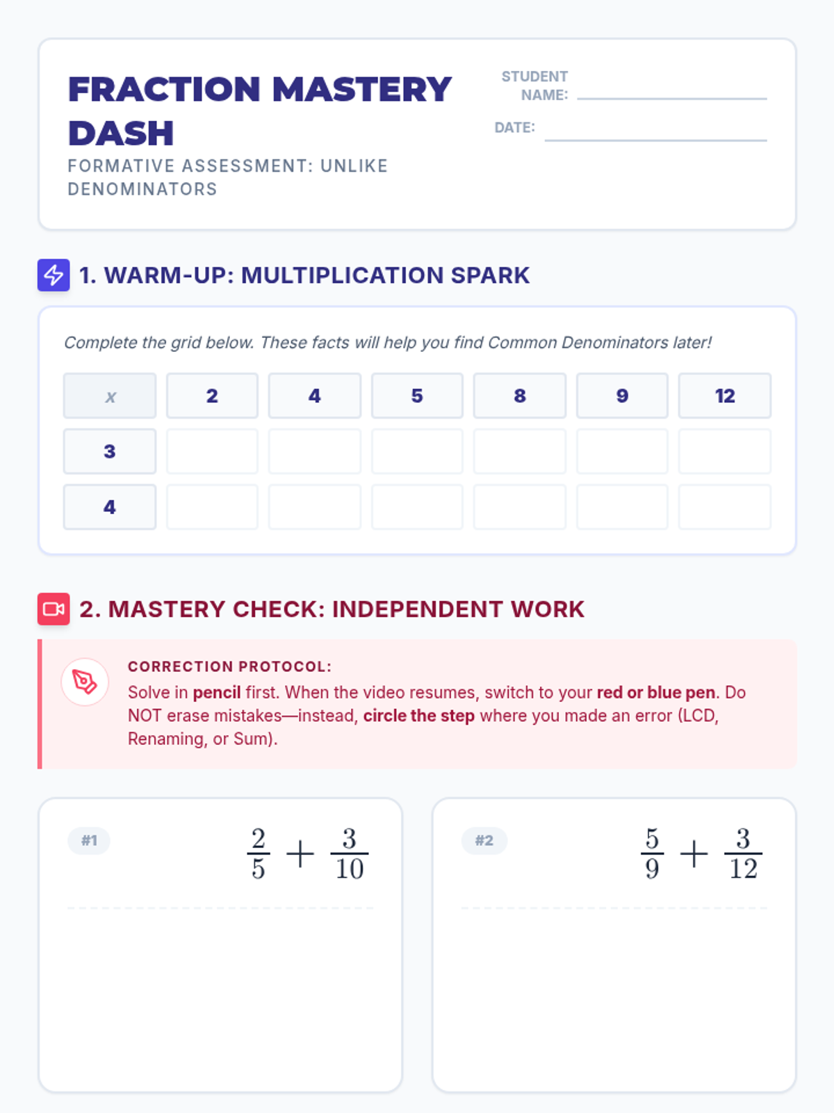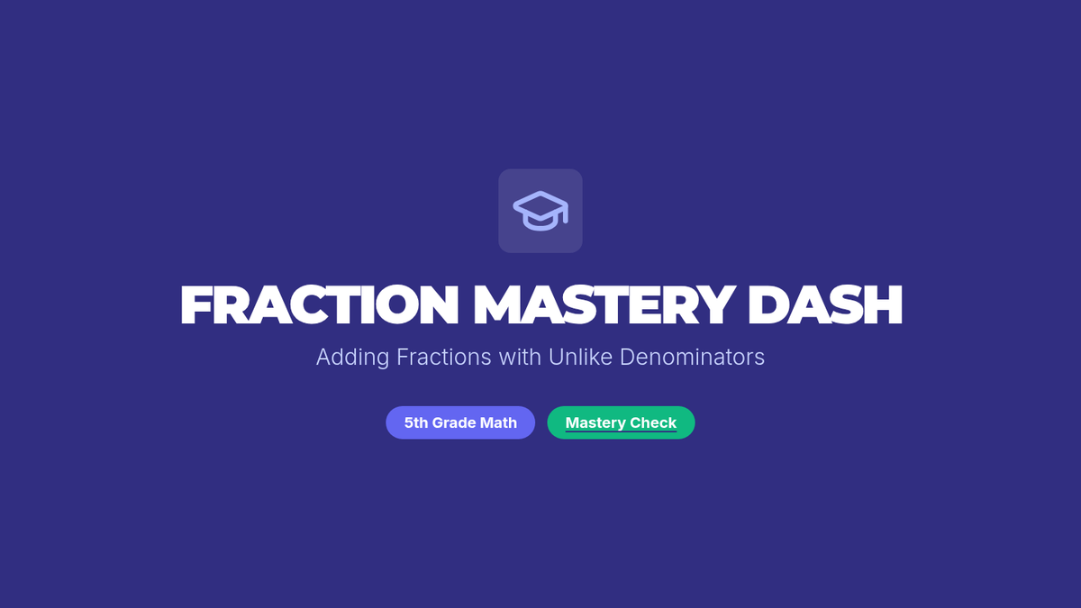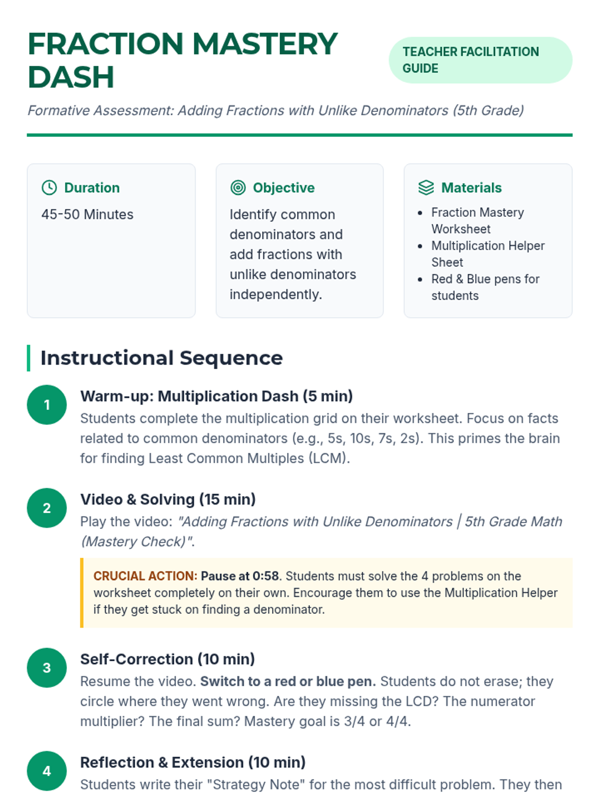A formative assessment lesson to gauge 5th-grade student readiness on adding fractions with unlike denominators, featuring a video-based mastery check, self-correction, and strategy reflection.