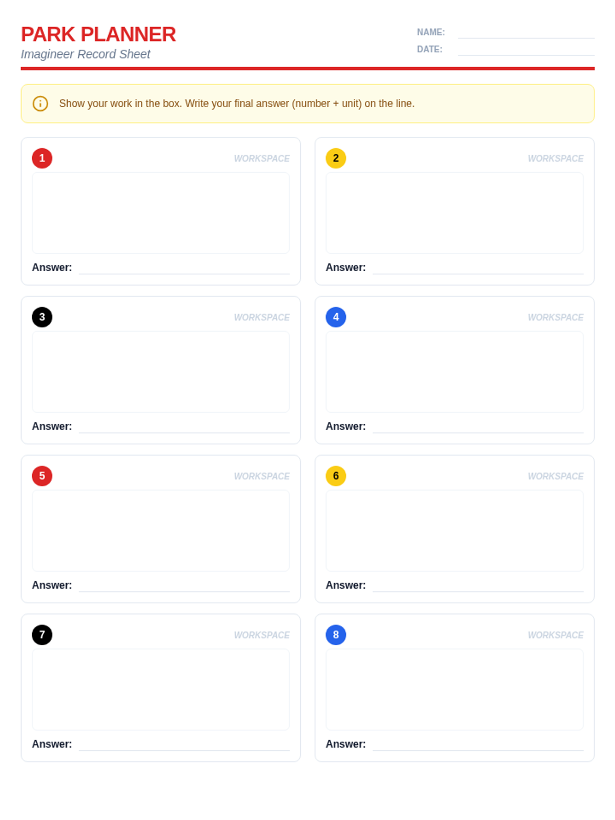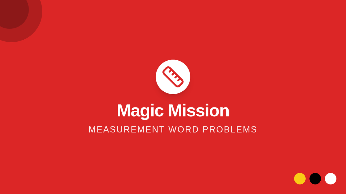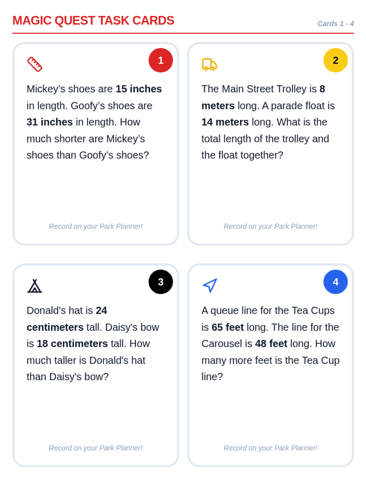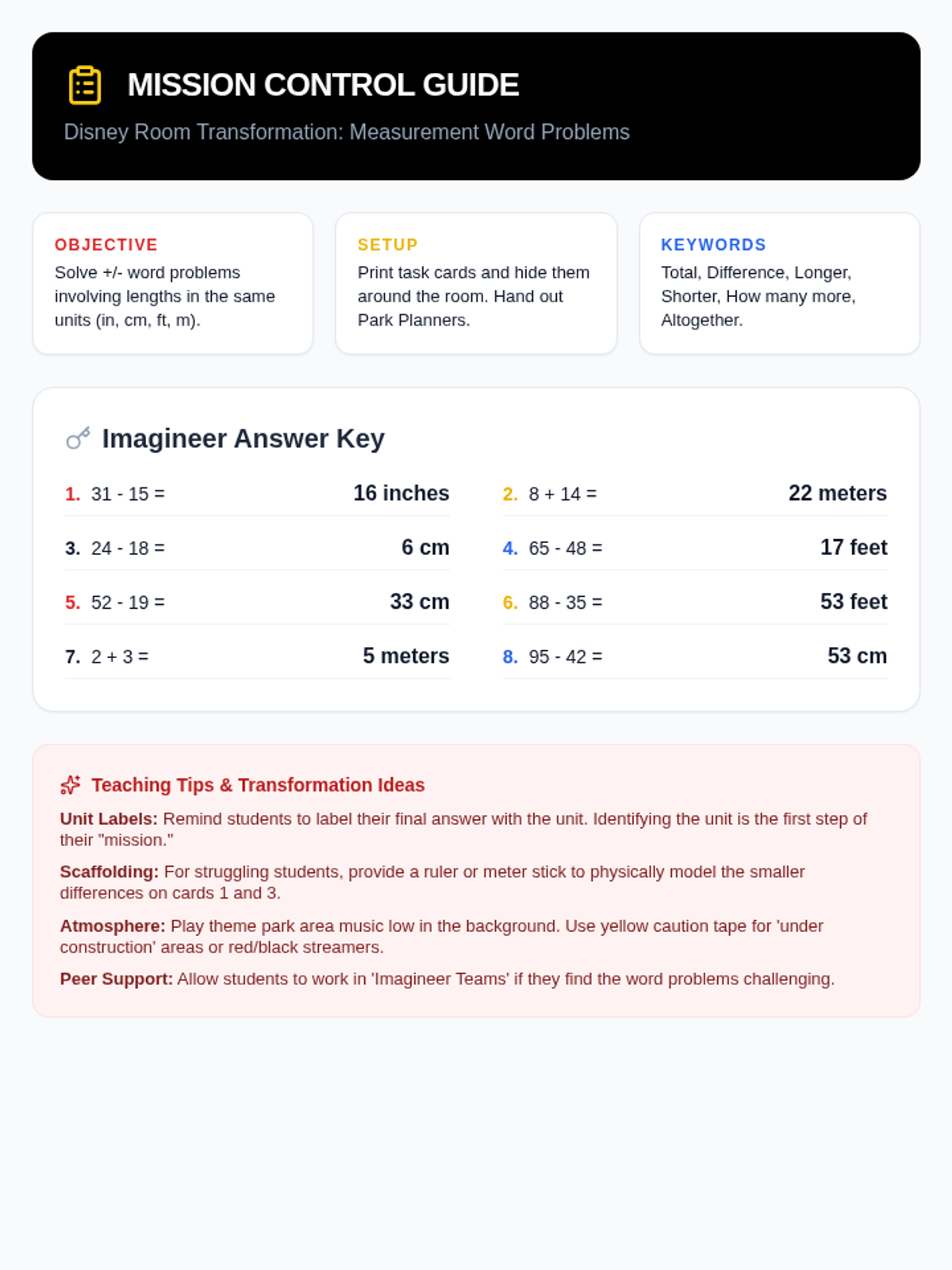 A high-energy measurement word problem lesson set in a magical theme park, designed for a room transformation experience. Students solve length comparison and addition problems using inches, centimeters, feet, and meters.