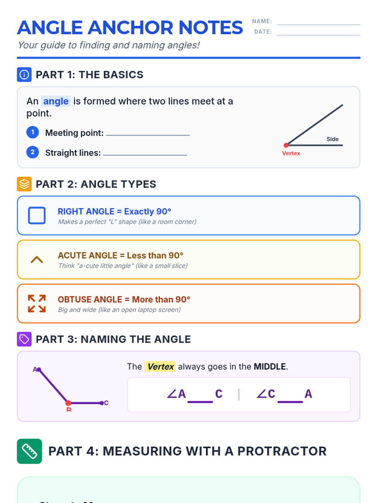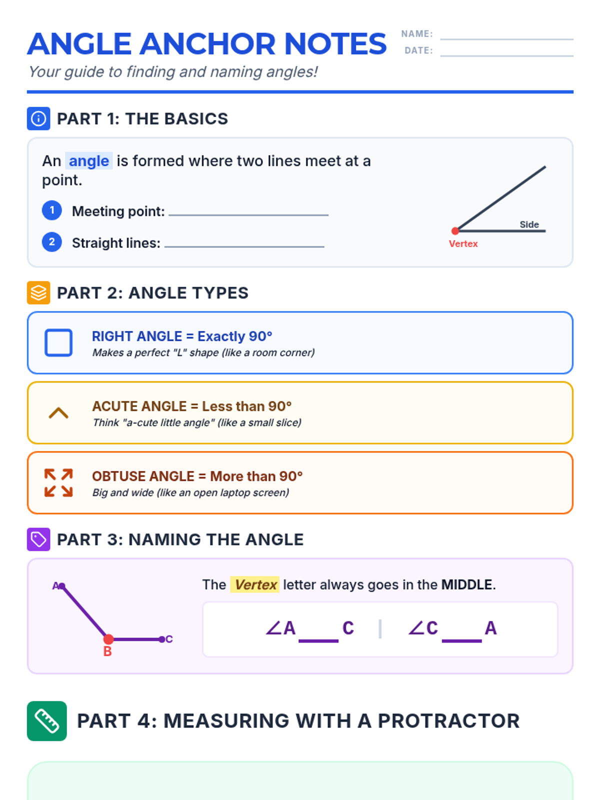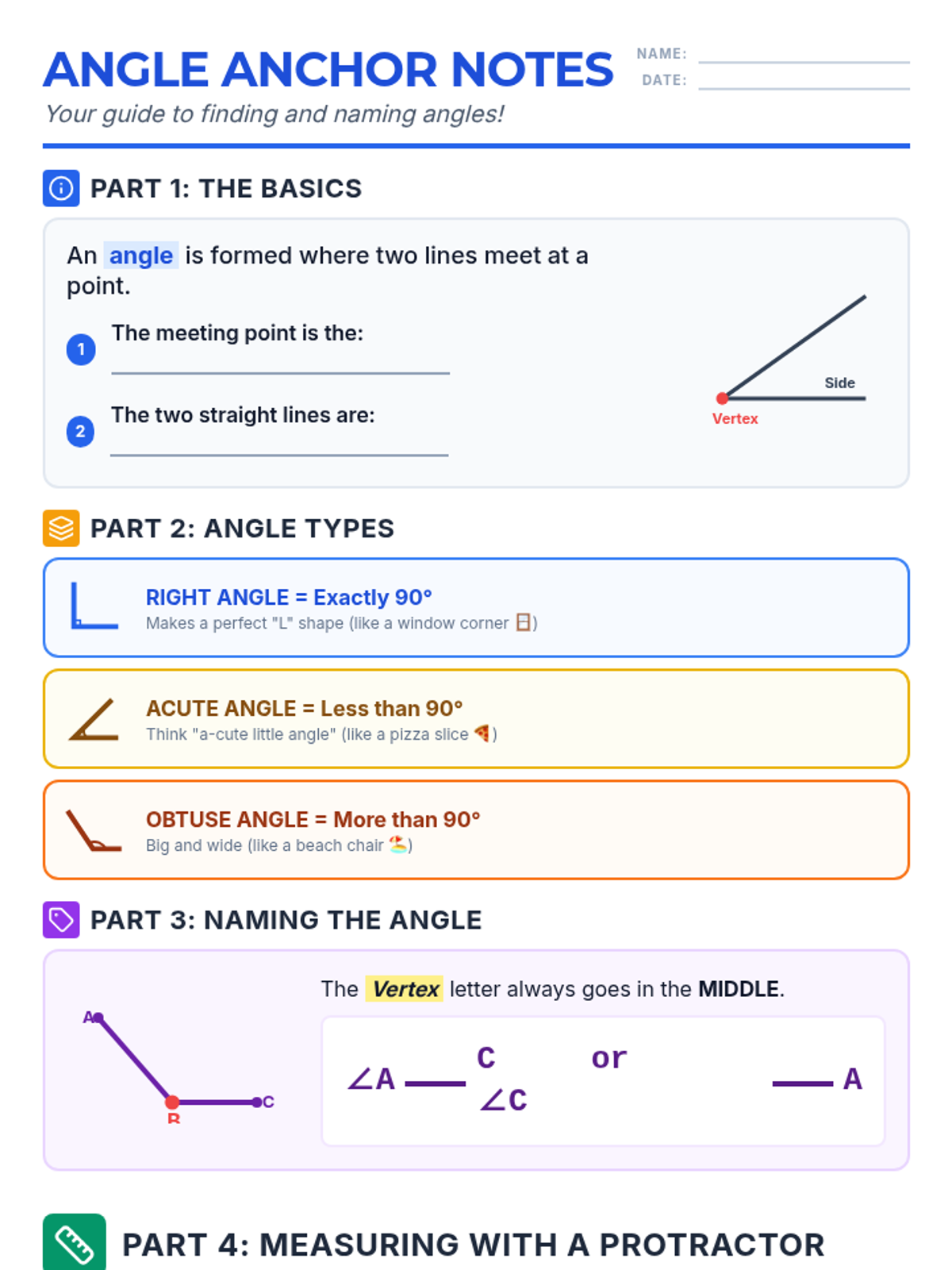 A foundational lesson on identifying, naming, and measuring angles, specifically designed with high-visual support and modified layouts for IEP students.
