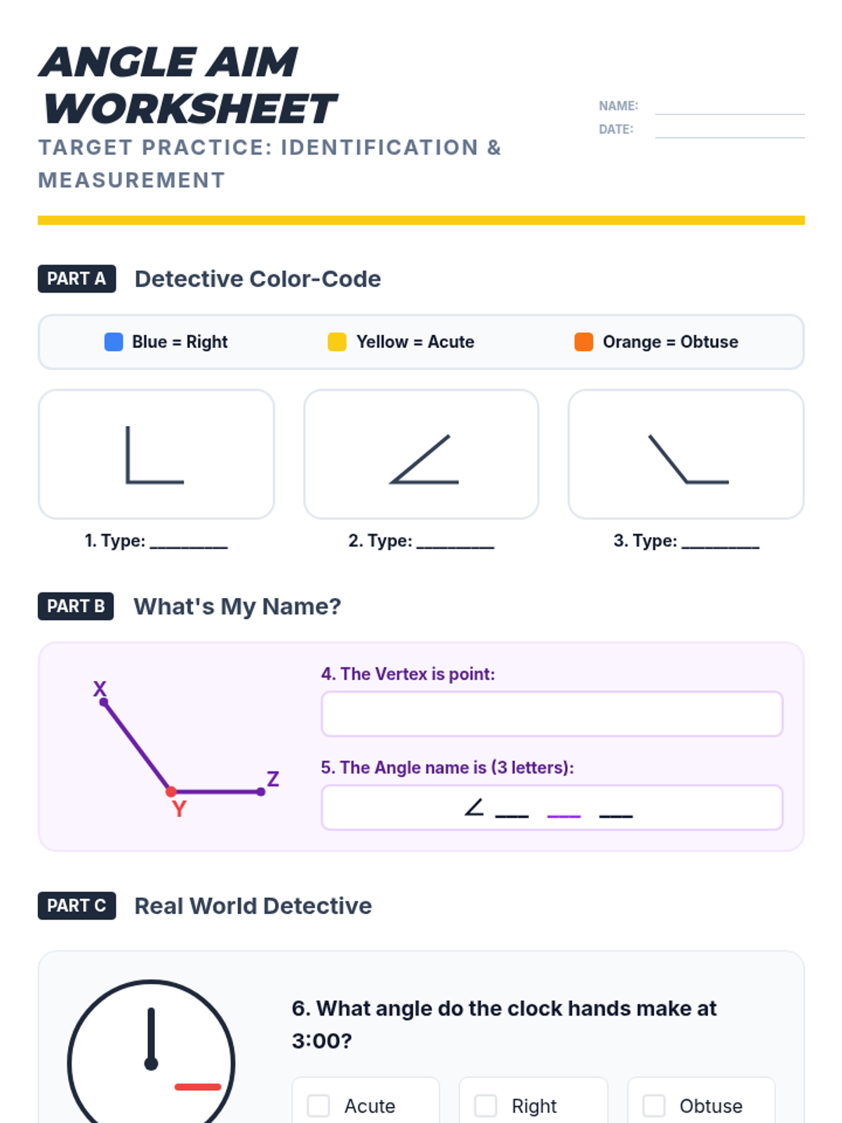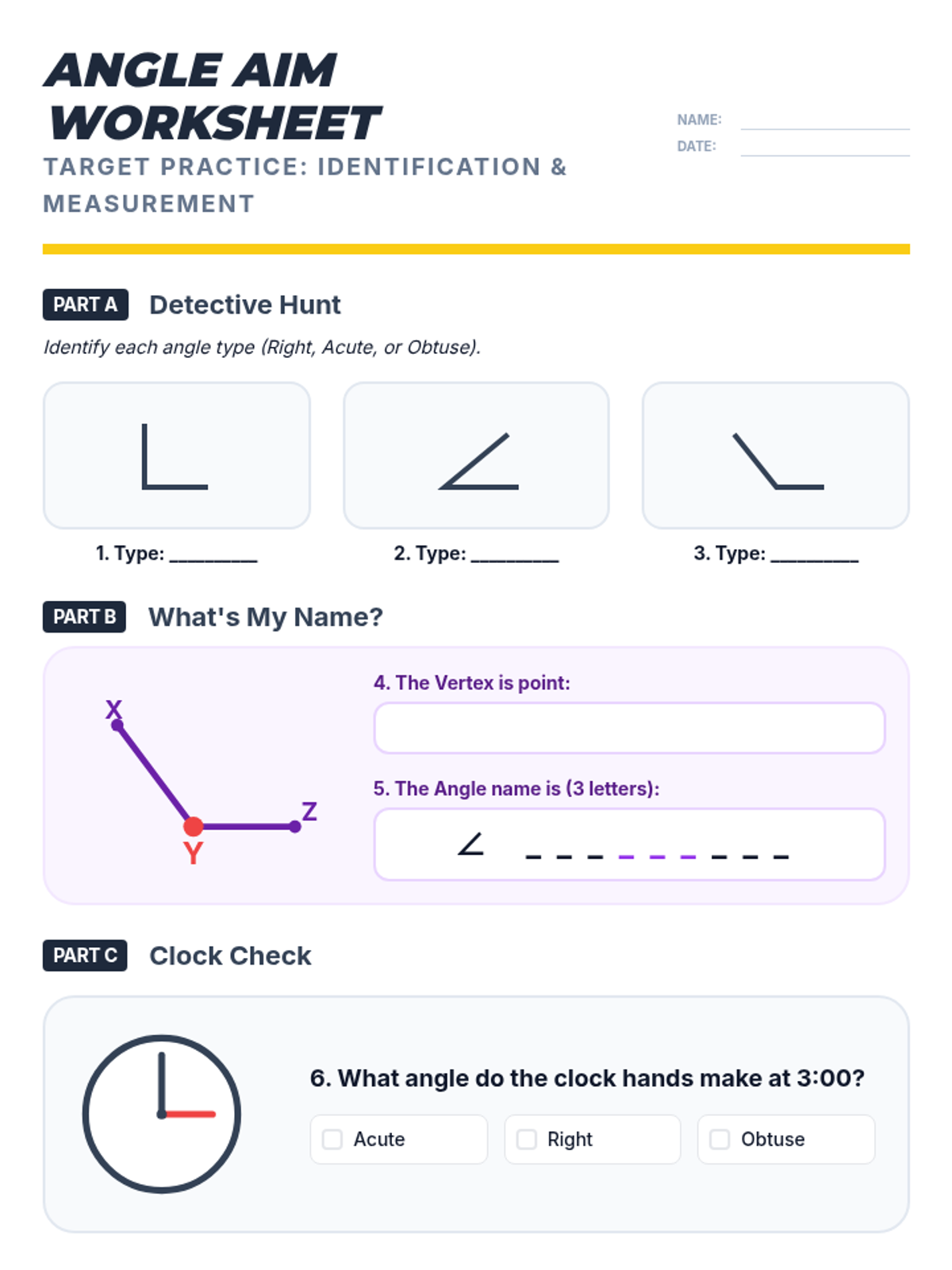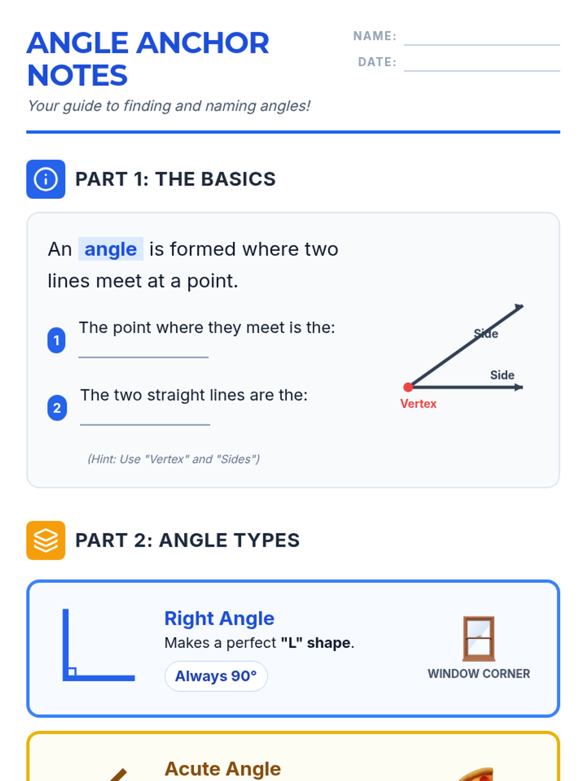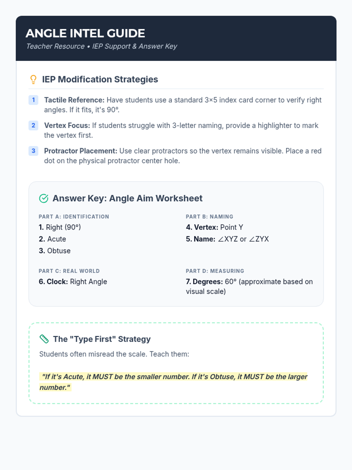 A foundational lesson on identifying, naming, and measuring angles, specifically designed with high-visual support and modified layouts for IEP students.