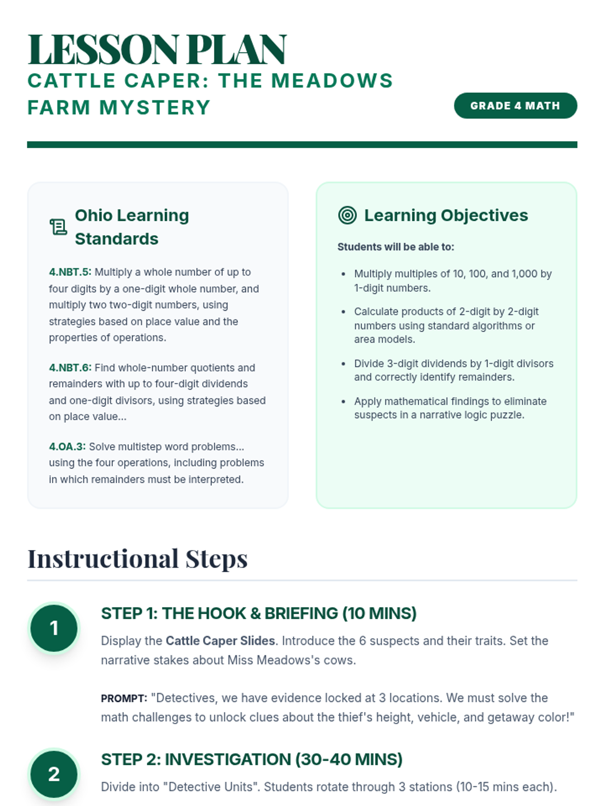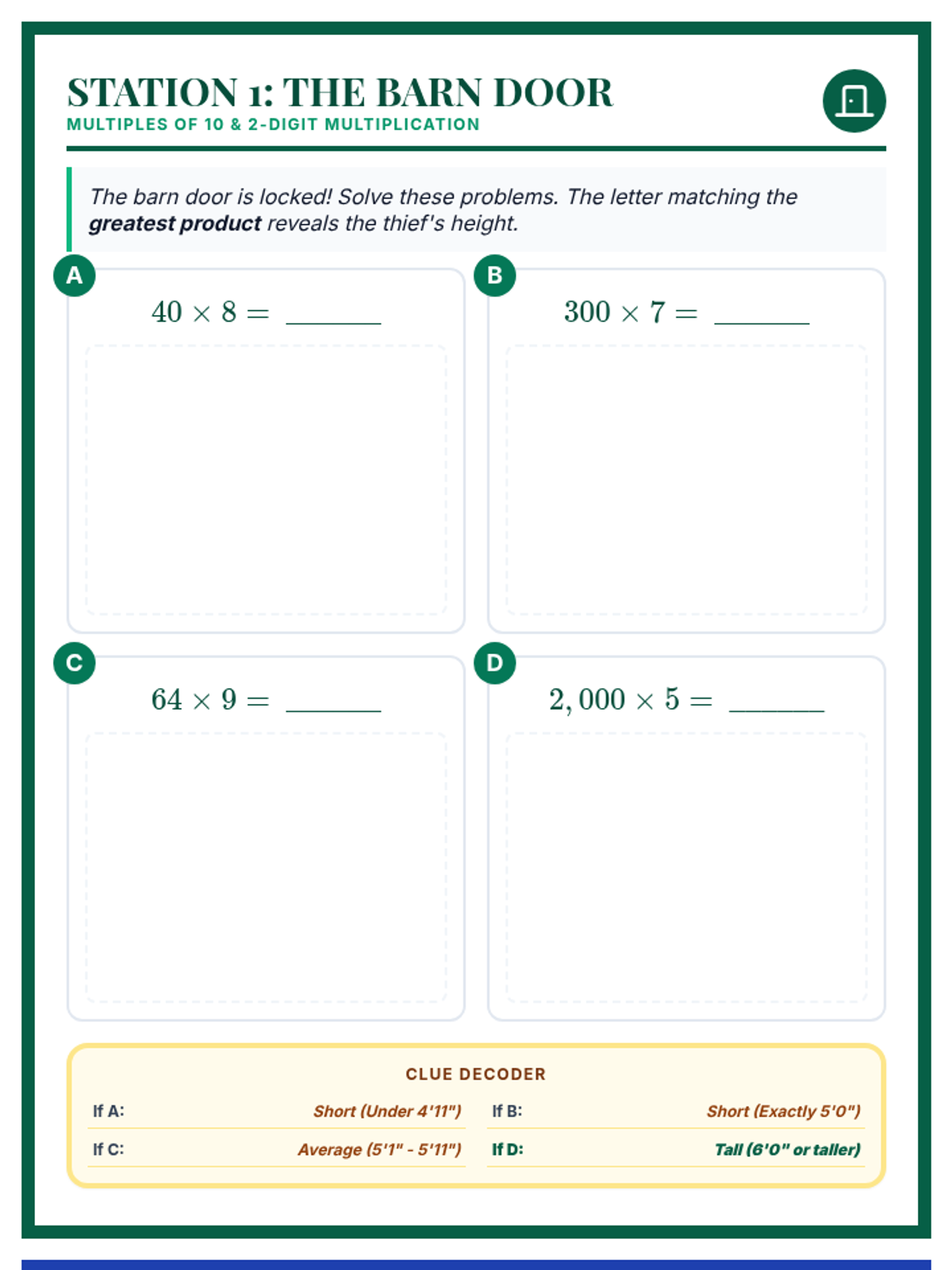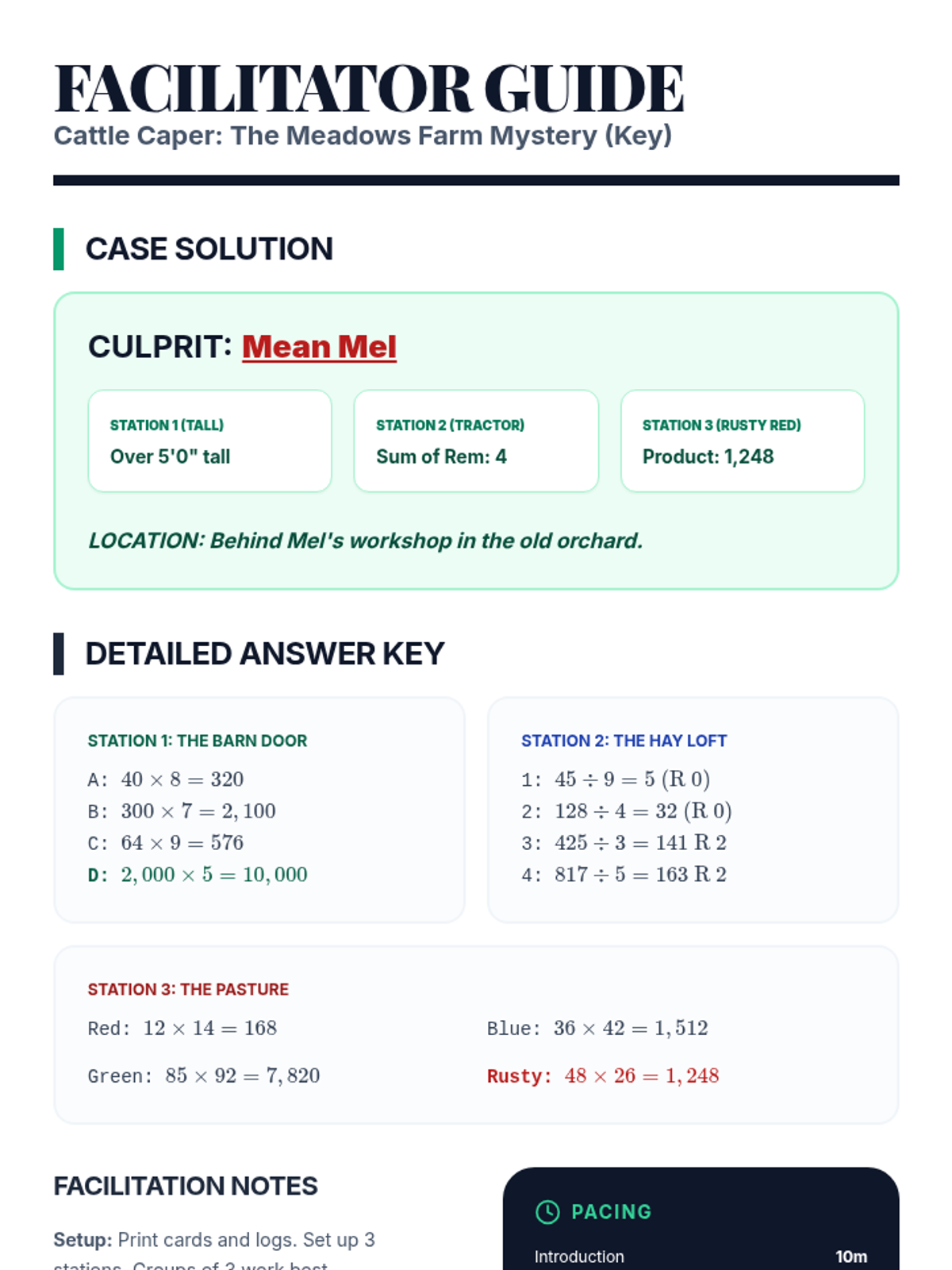 The core escape room lesson where students solve multiplication and division challenges to identify the thief of Miss Meadows's cows. includes 2-digit multiplication and 3-digit division with remainders.