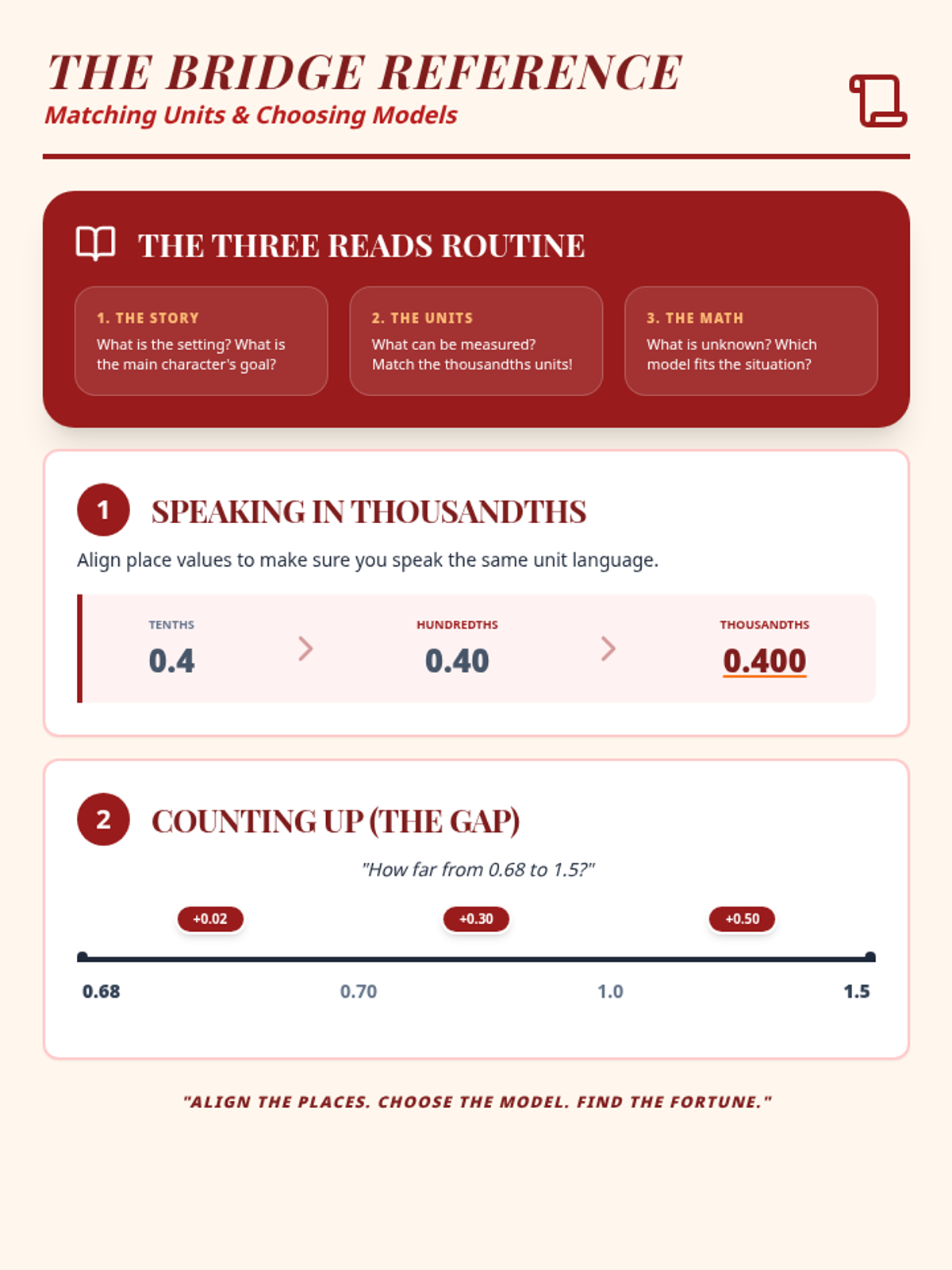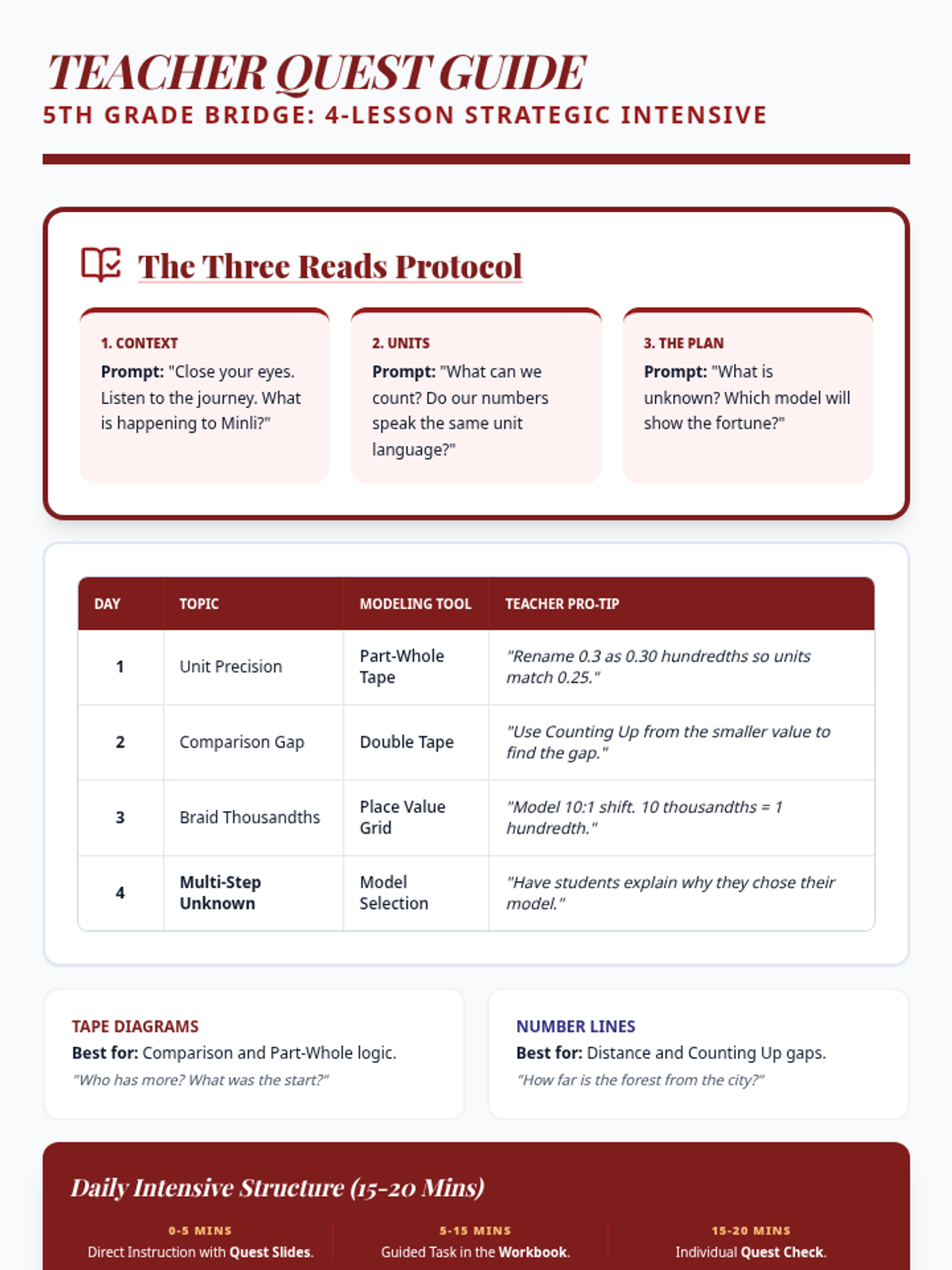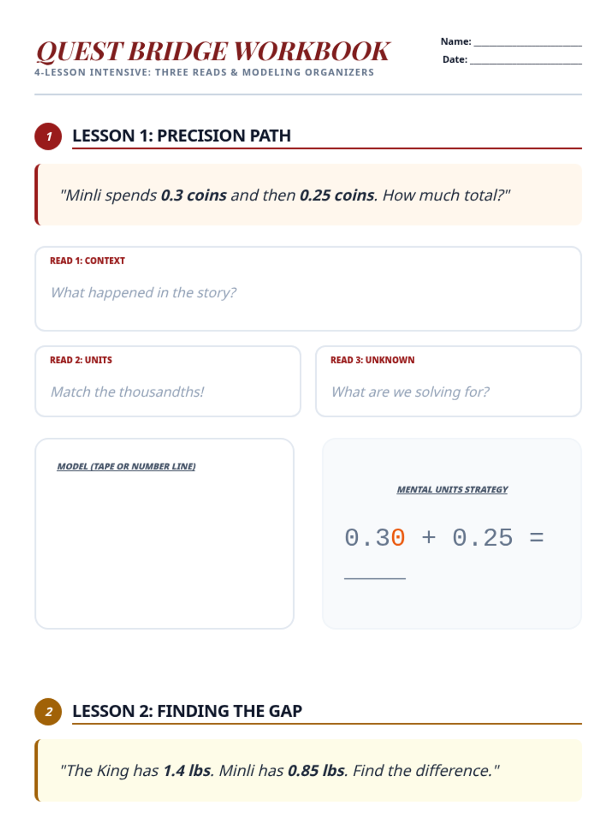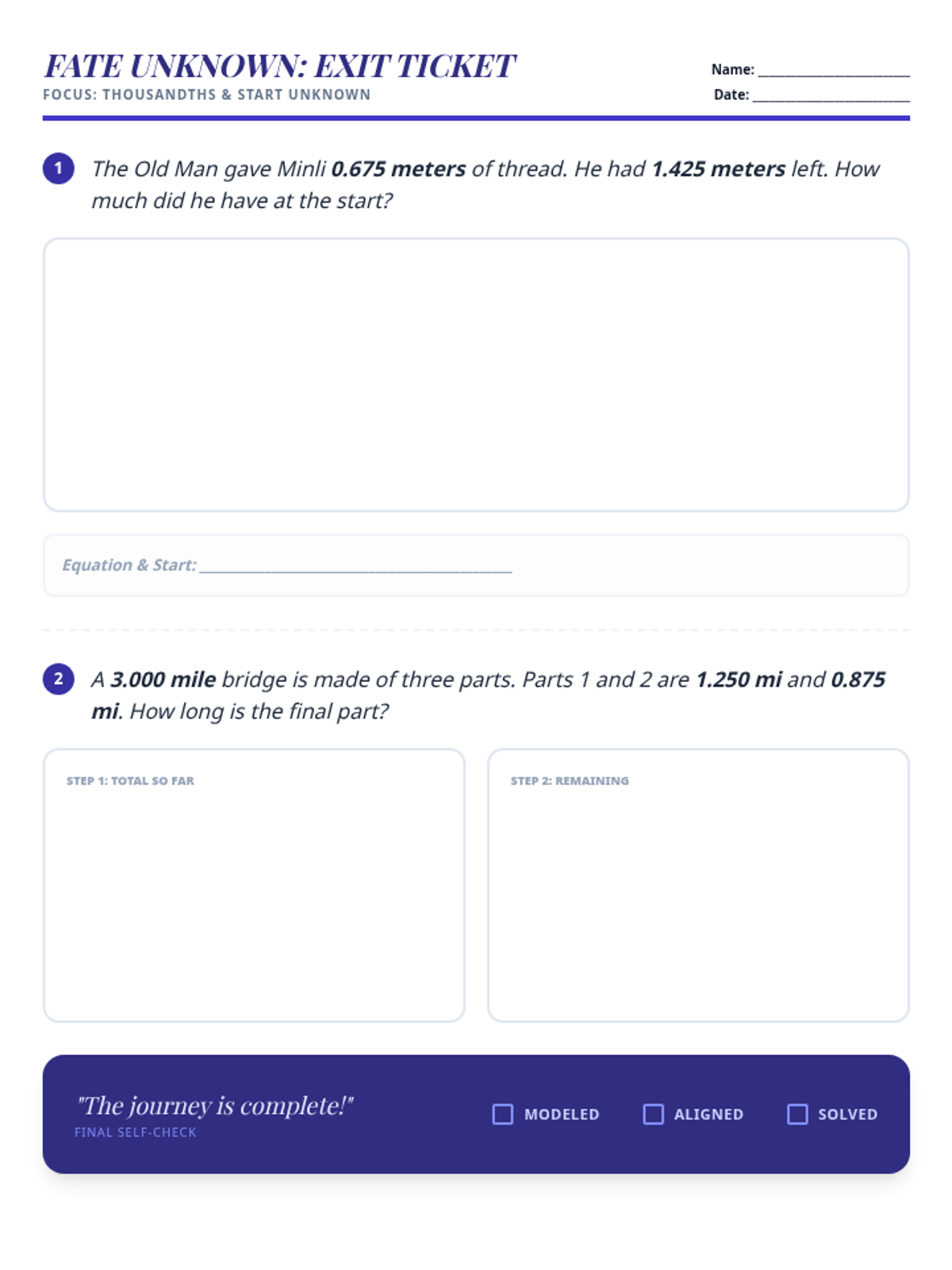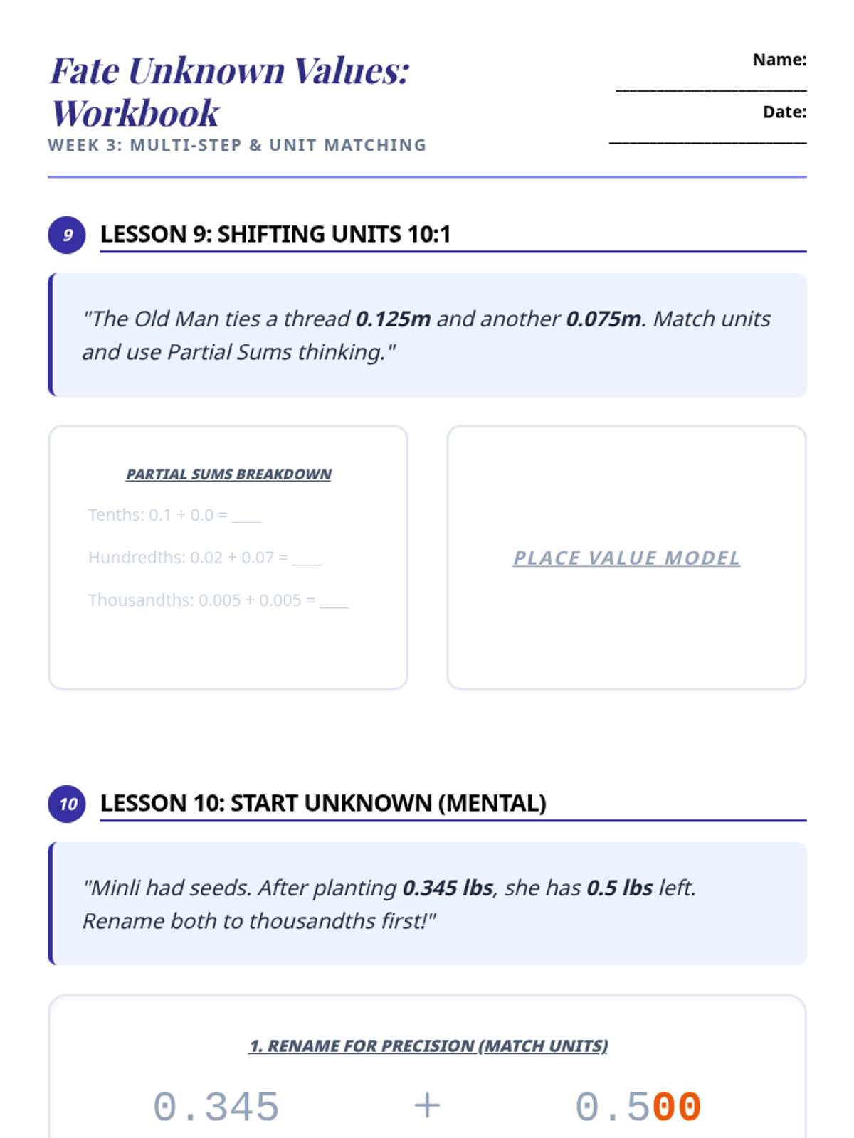 Introduces thousandths and focuses on 'start unknown' problem types, requiring students to work backward using modeling strategies.