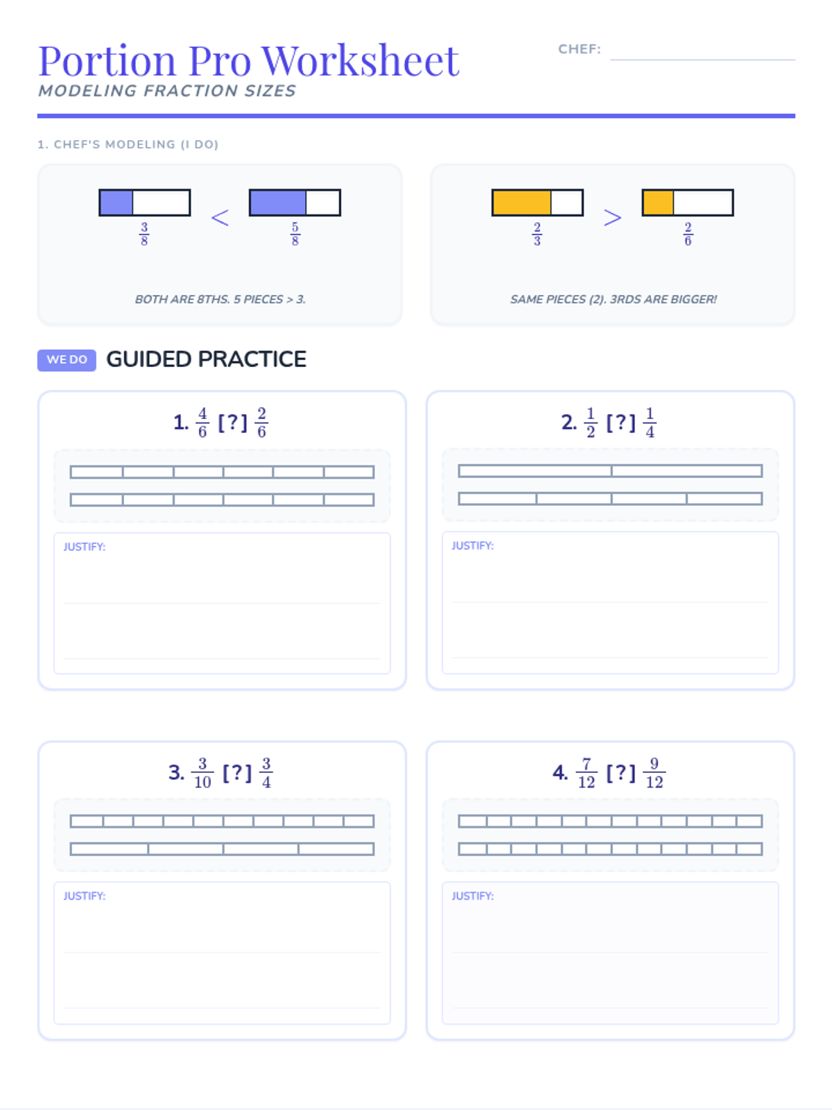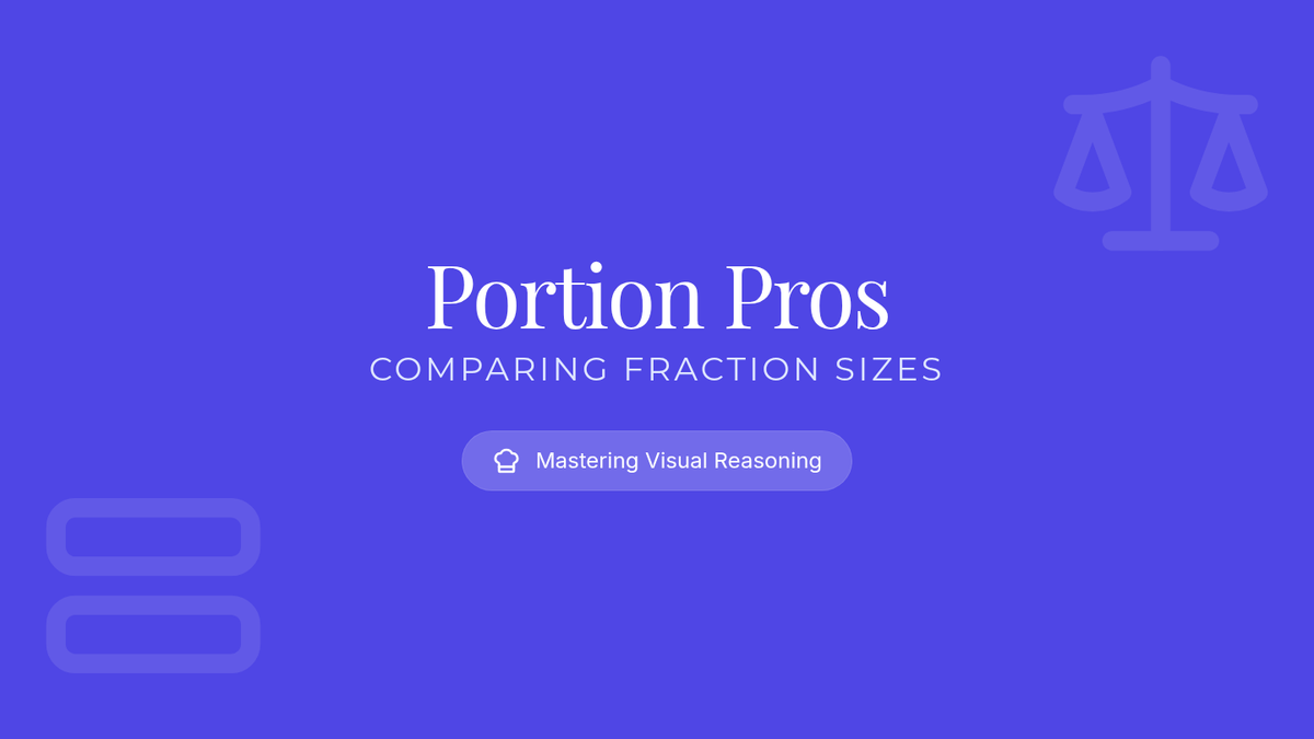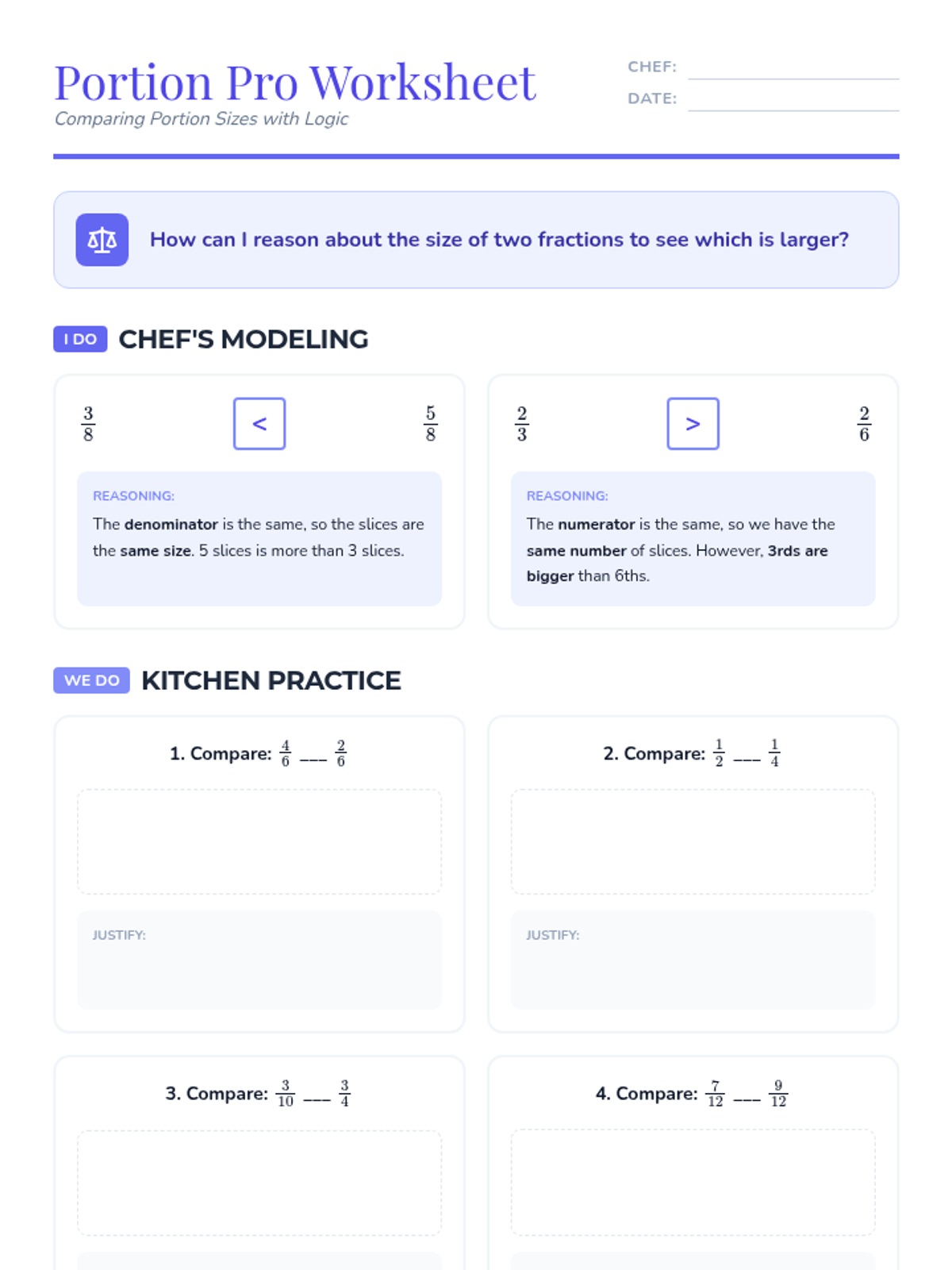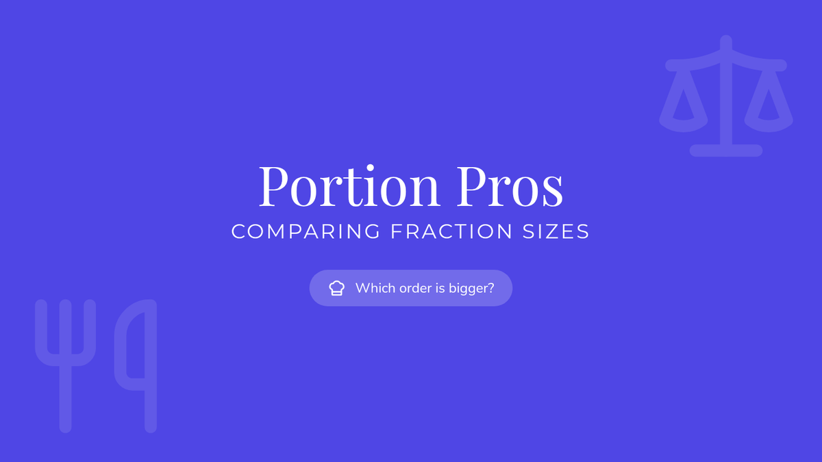 A 16:9 slide deck for teaching fraction comparison. Covers comparing fractions with common numerators and denominators using the Portion Pros bakery theme and visual bar models.