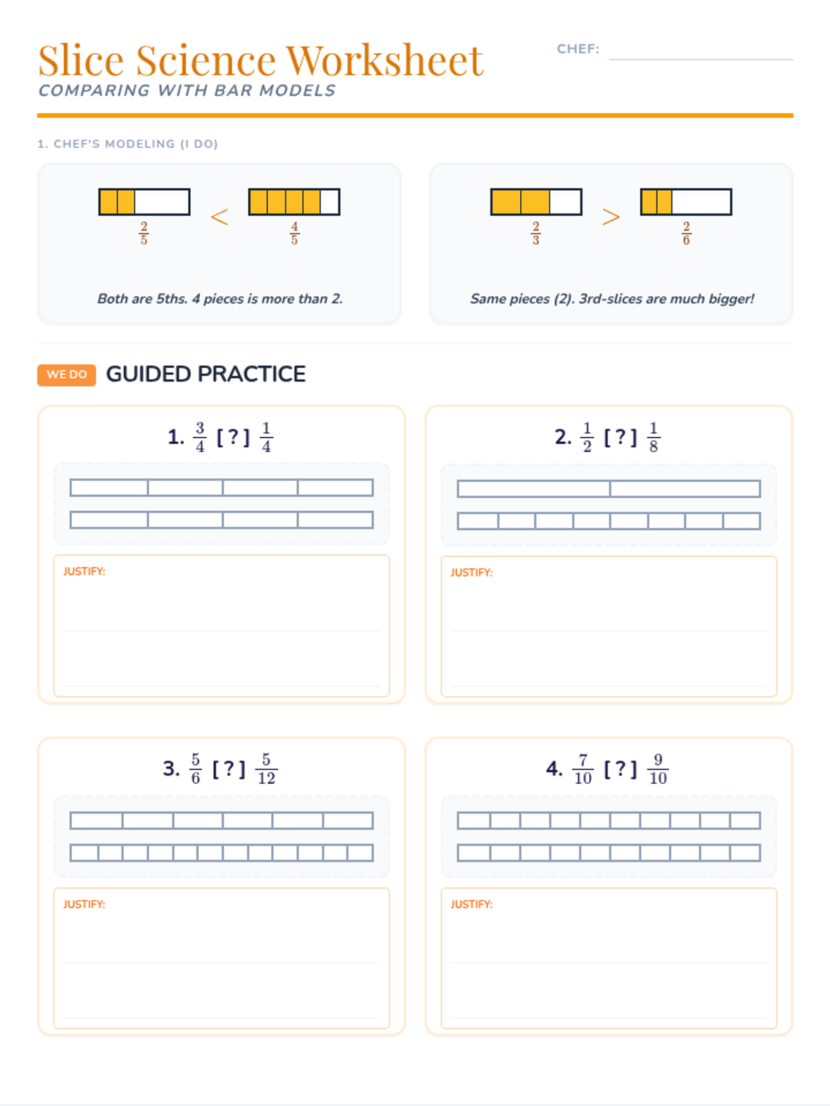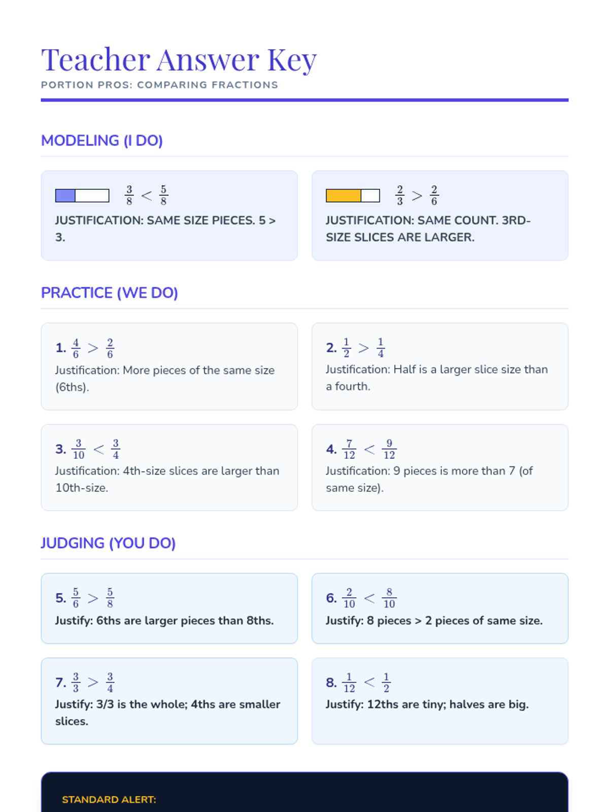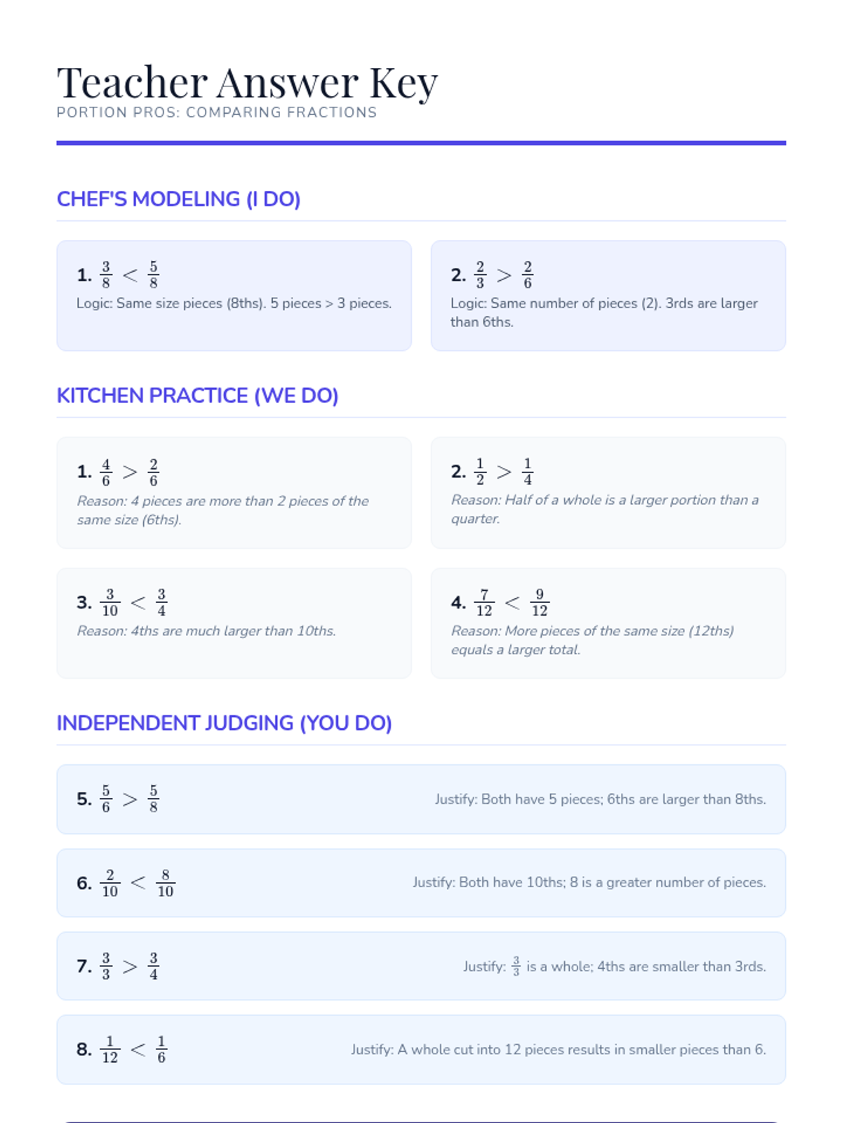 A 16:9 slide deck for teaching fraction comparison. Covers comparing fractions with common numerators and denominators using the Portion Pros bakery theme and visual bar models.