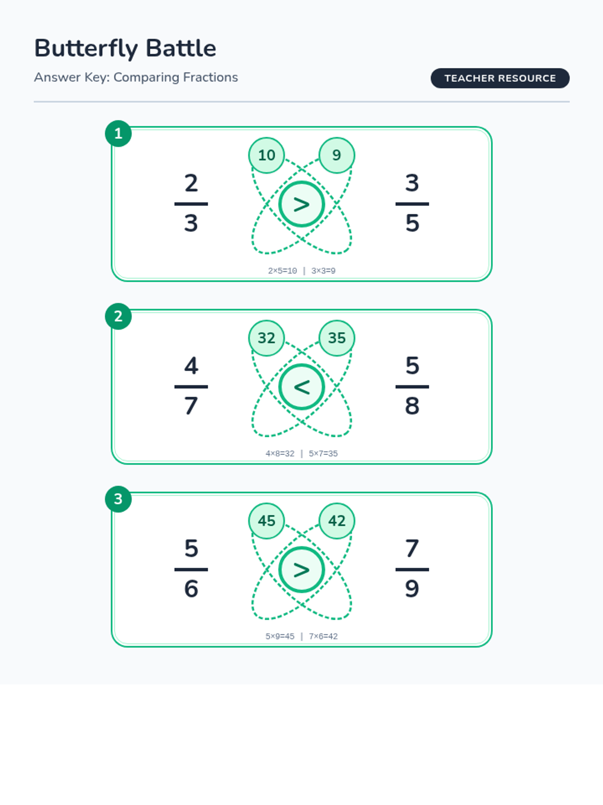 A lesson focused on comparing fractions with unlike denominators and numerators using the cross-multiplication (butterfly) strategy. Students will learn to visualize the process and use comparison symbols accurately.
