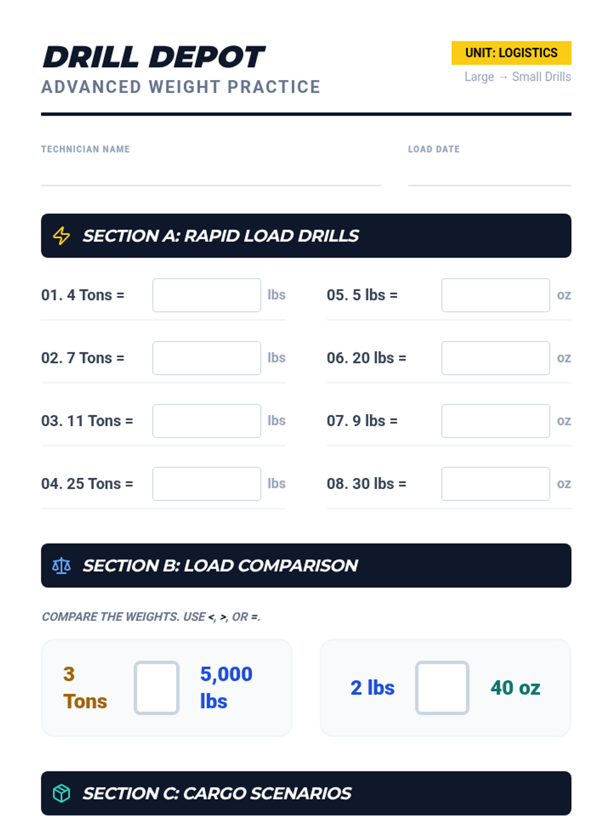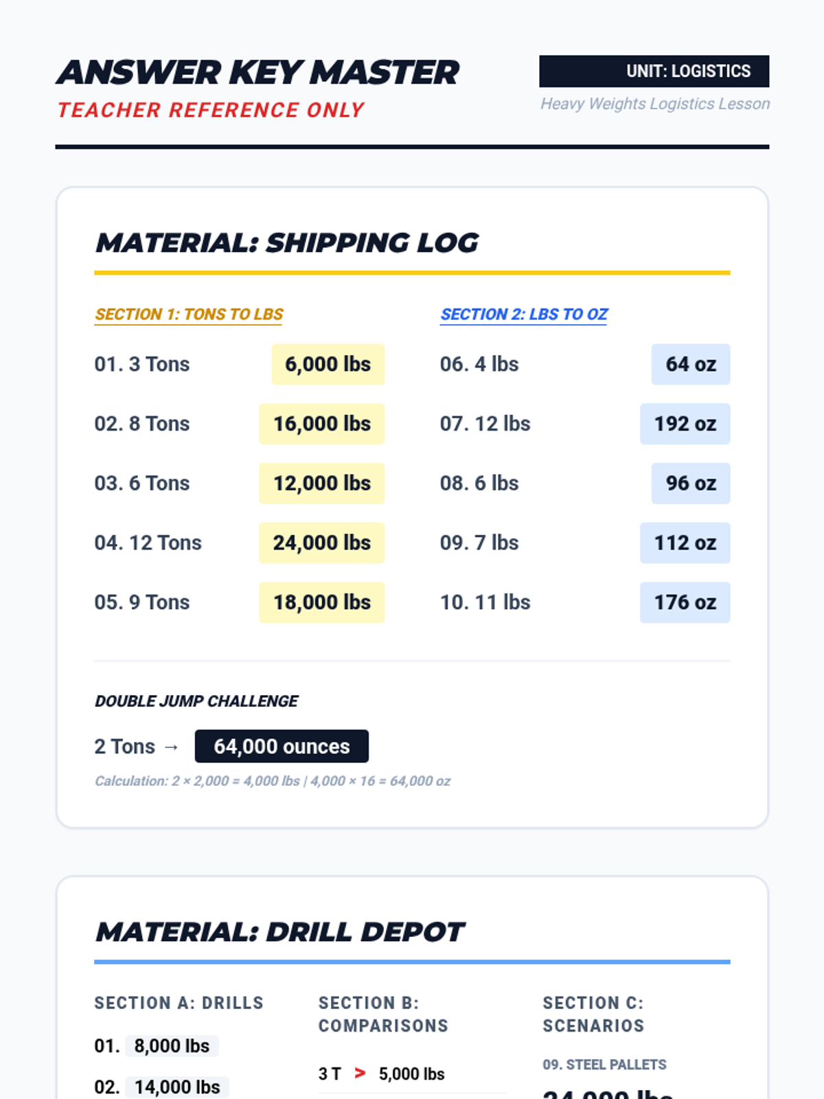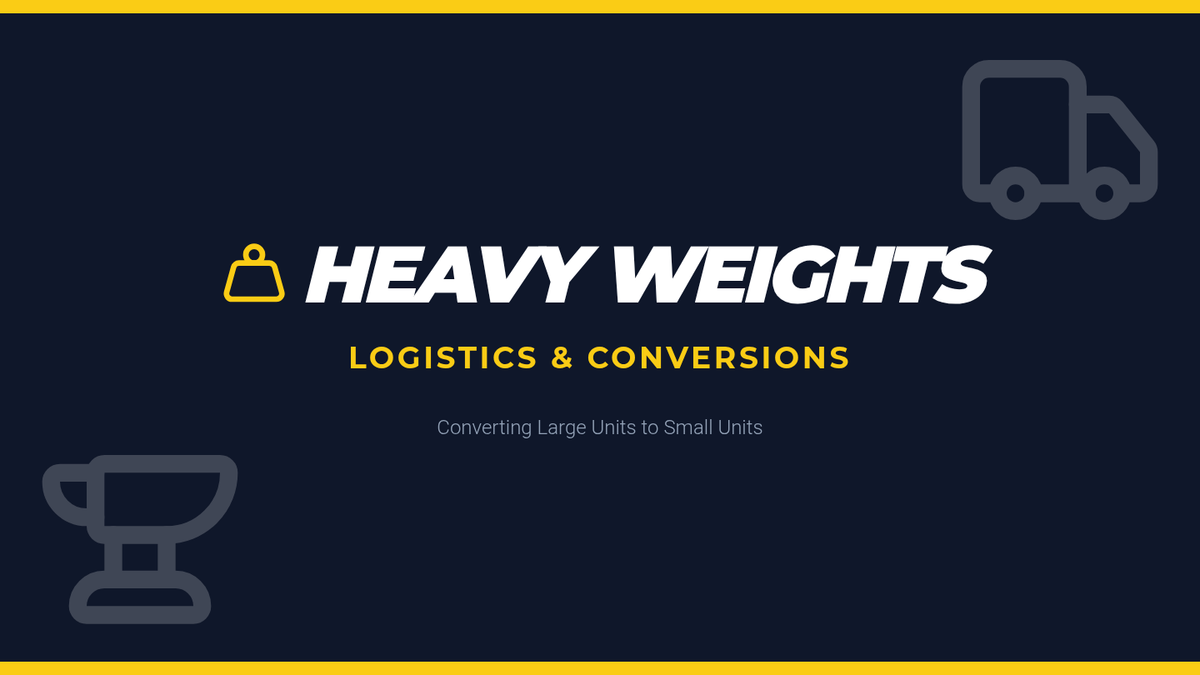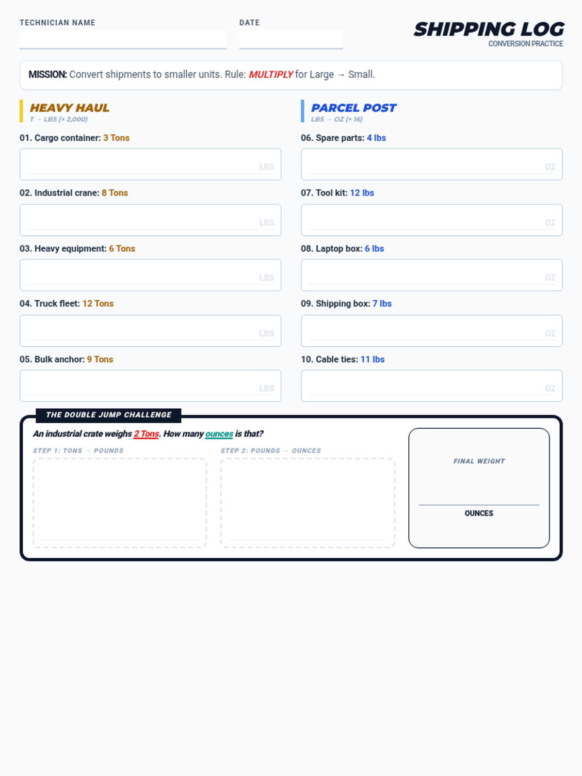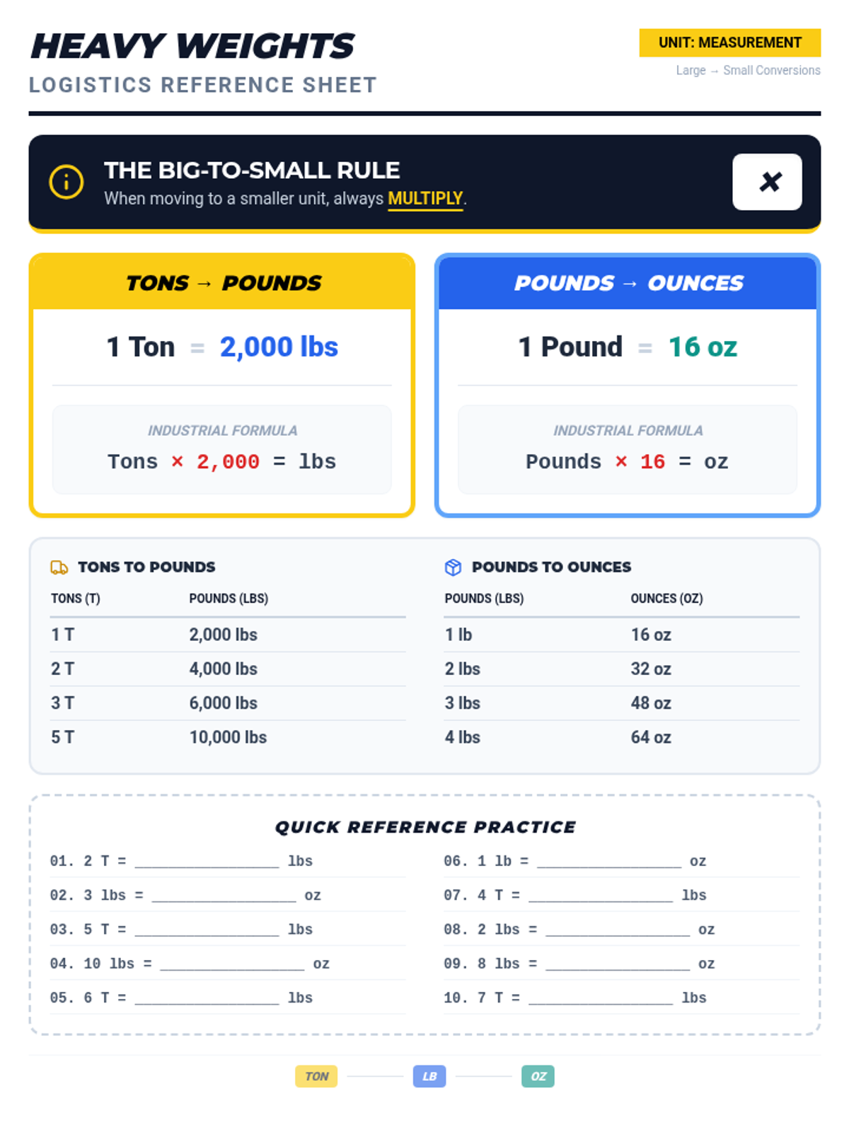 A focused lesson on converting weight units (tons, pounds, and ounces) from larger to smaller units using multiplication, featuring industrial-themed visuals and color-coded conversion guides.