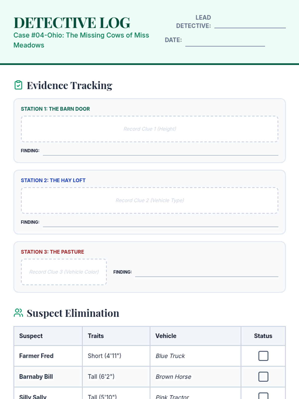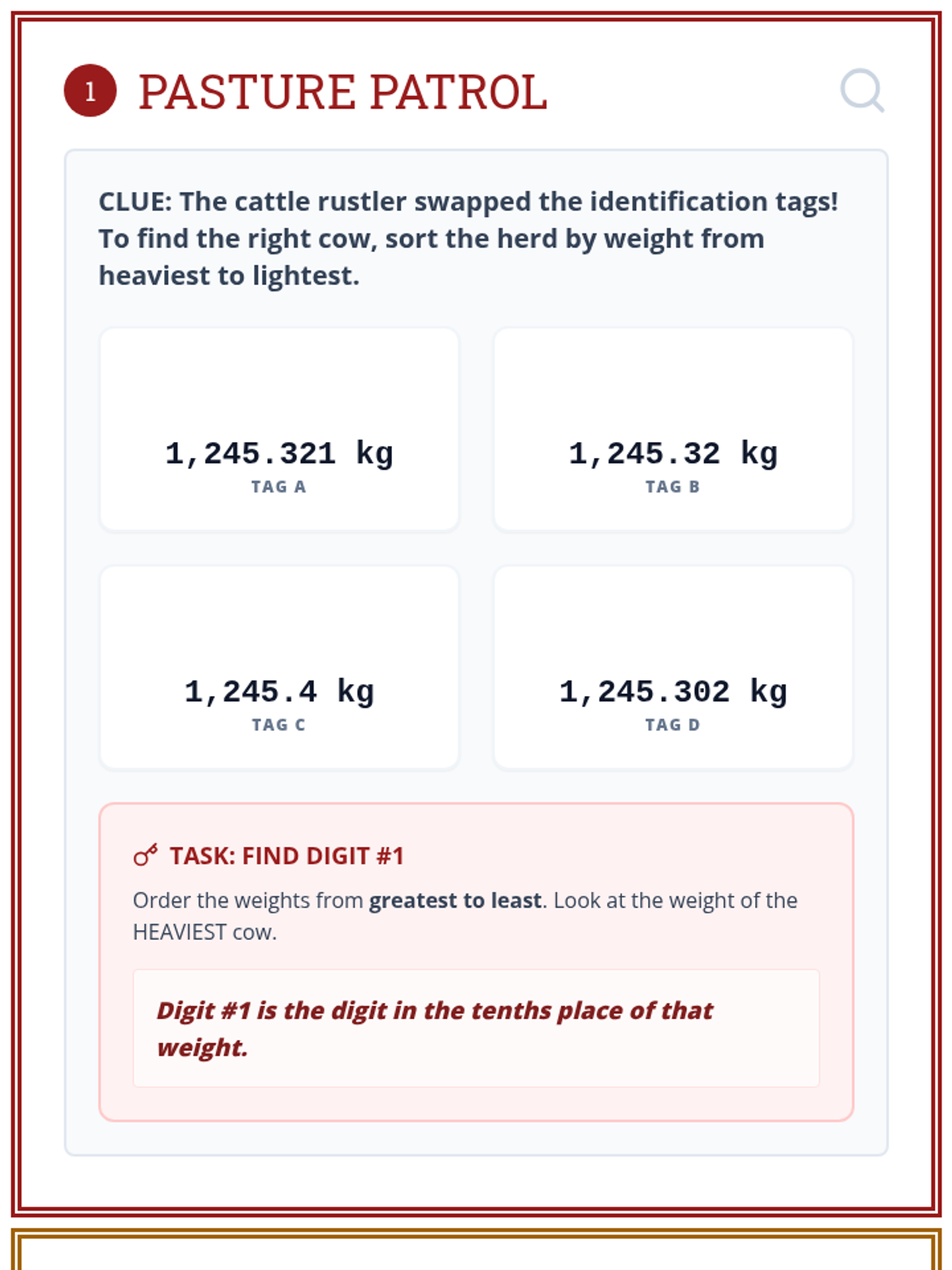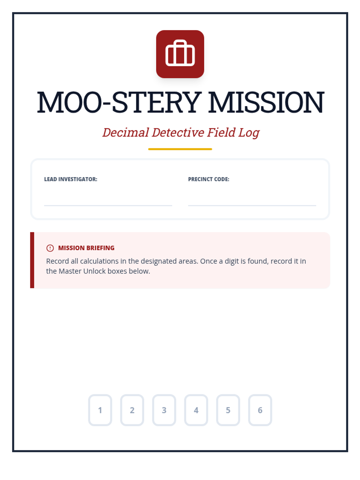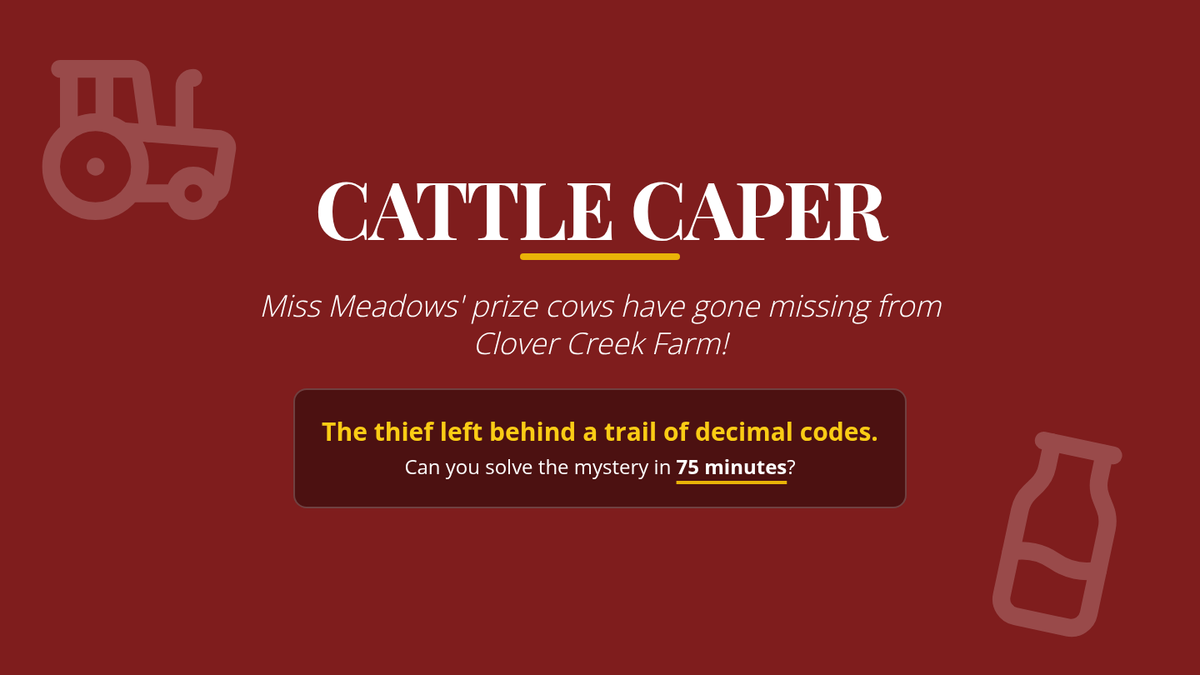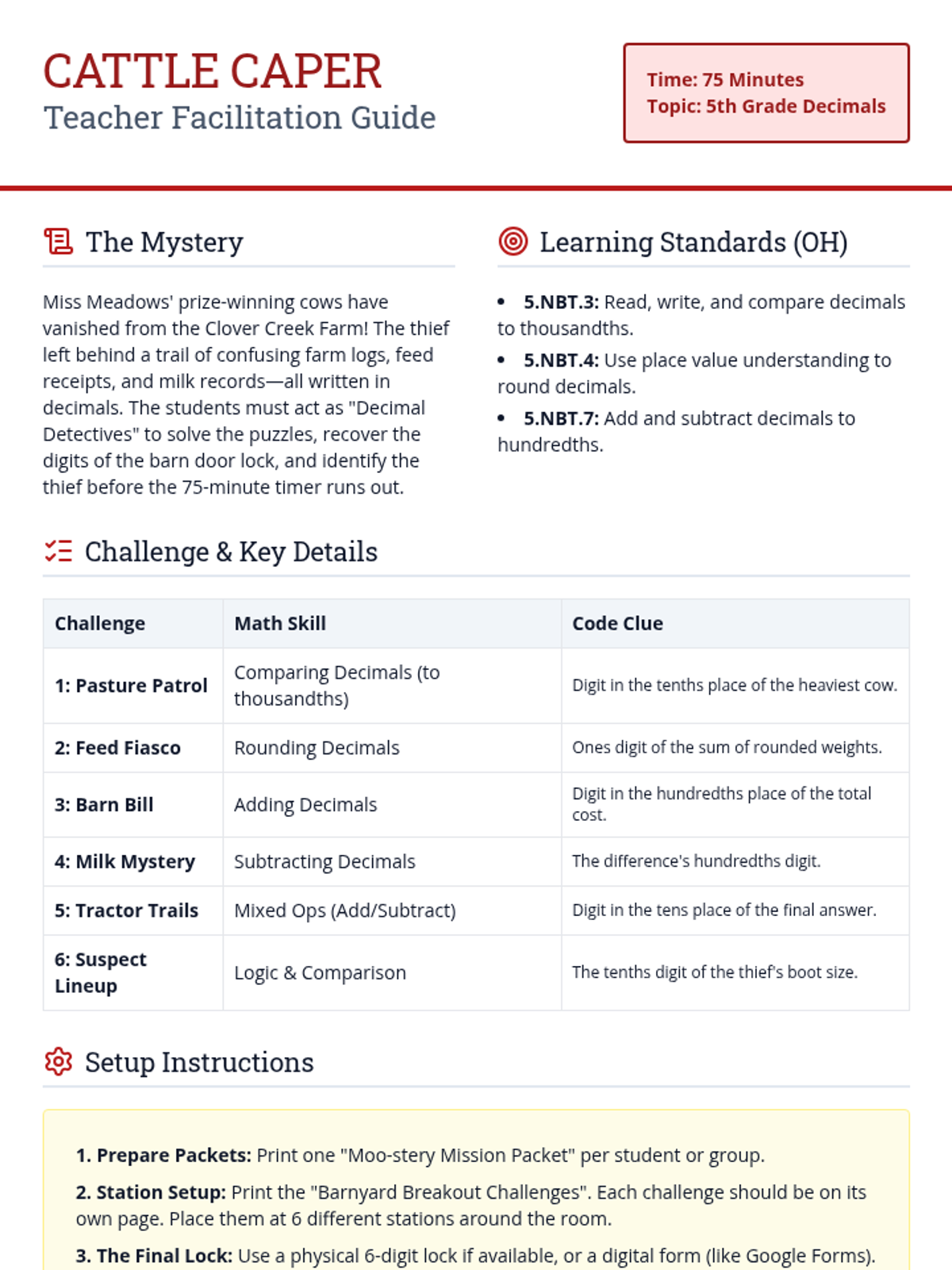 A high-stakes 5th-grade math escape room where students solve decimal-based puzzles to find Miss Meadows' missing cows. Students will round, compare, add, and subtract decimals to unlock the barn and catch the cattle rustler.
