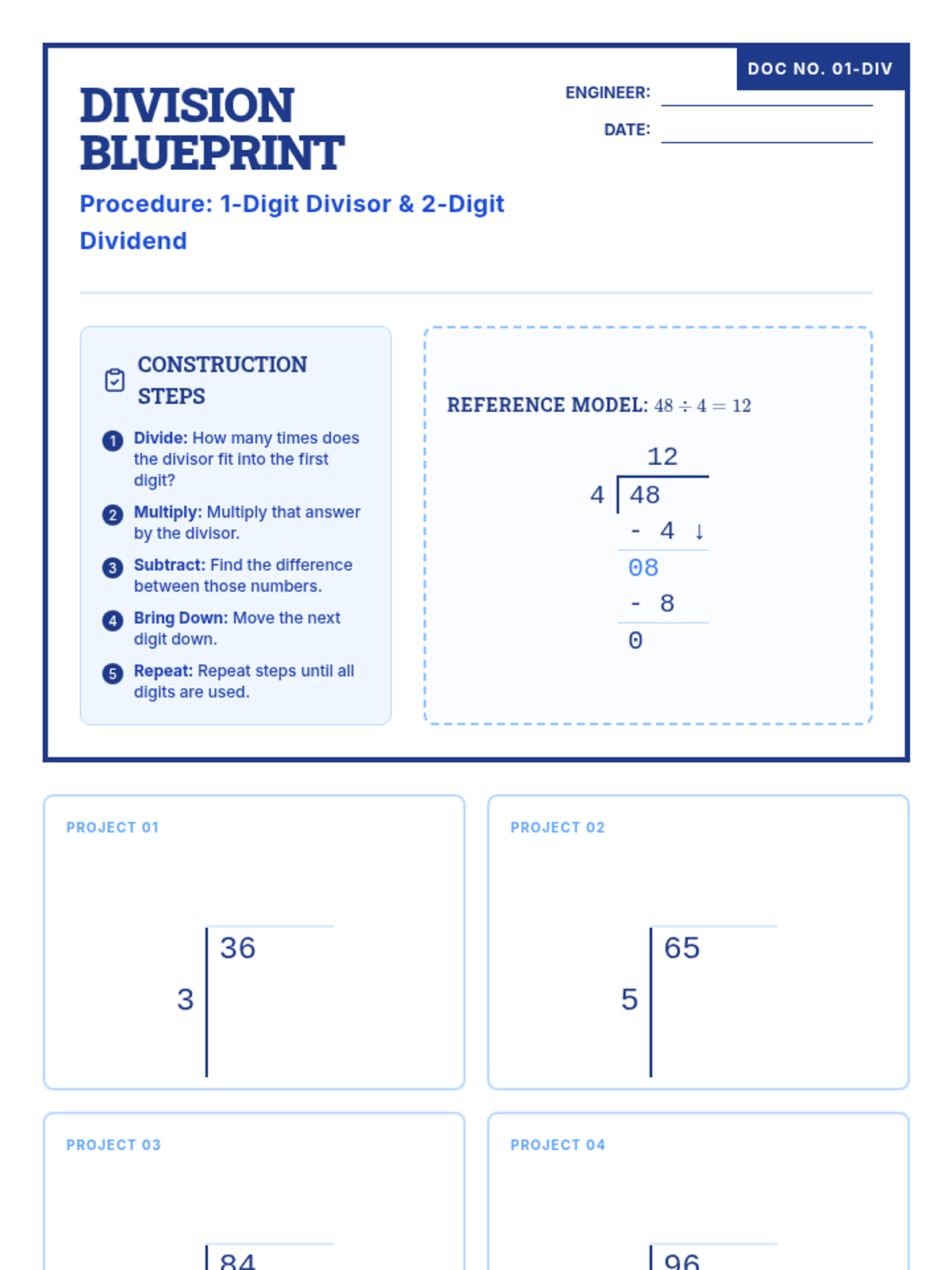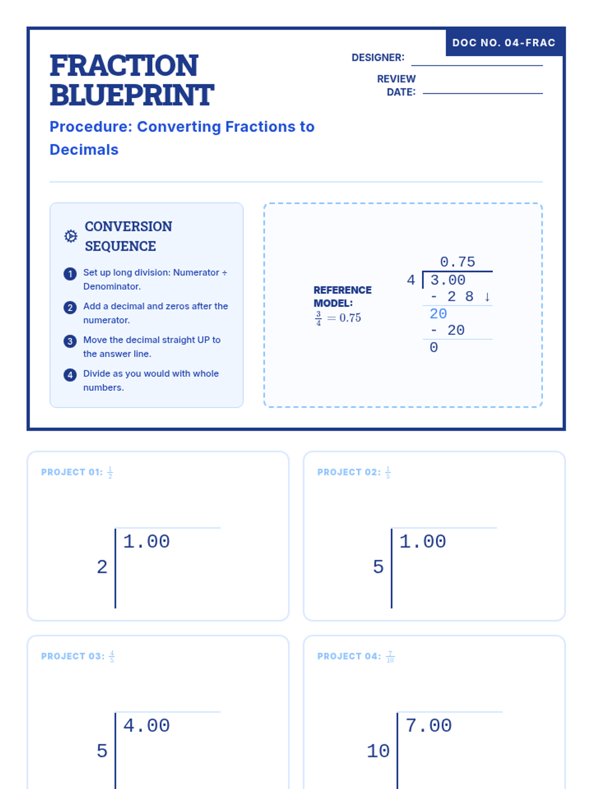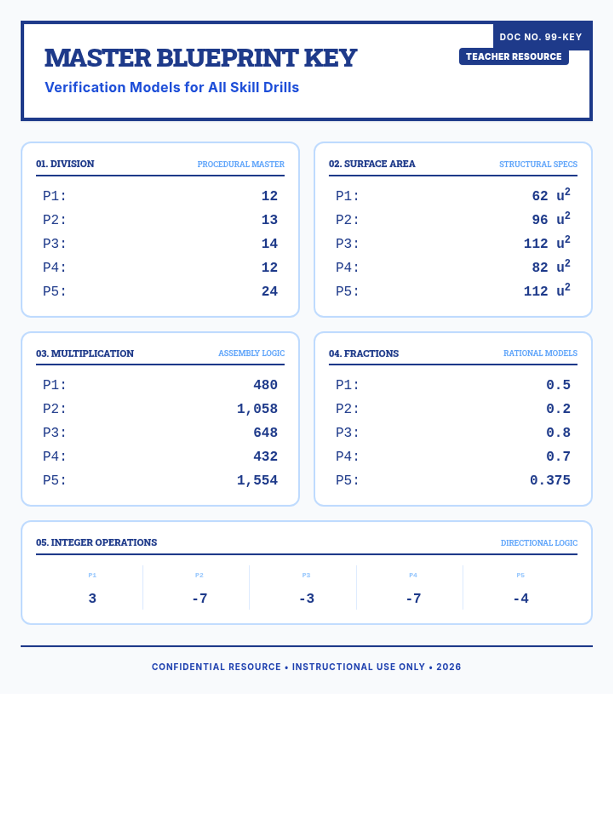 A collection of 5 foundational math worksheets focused on procedural mastery in division, surface area, multi-digit multiplication, fraction-decimal conversion, and integer arithmetic. Each sheet includes a step-by-step checklist and a worked example.