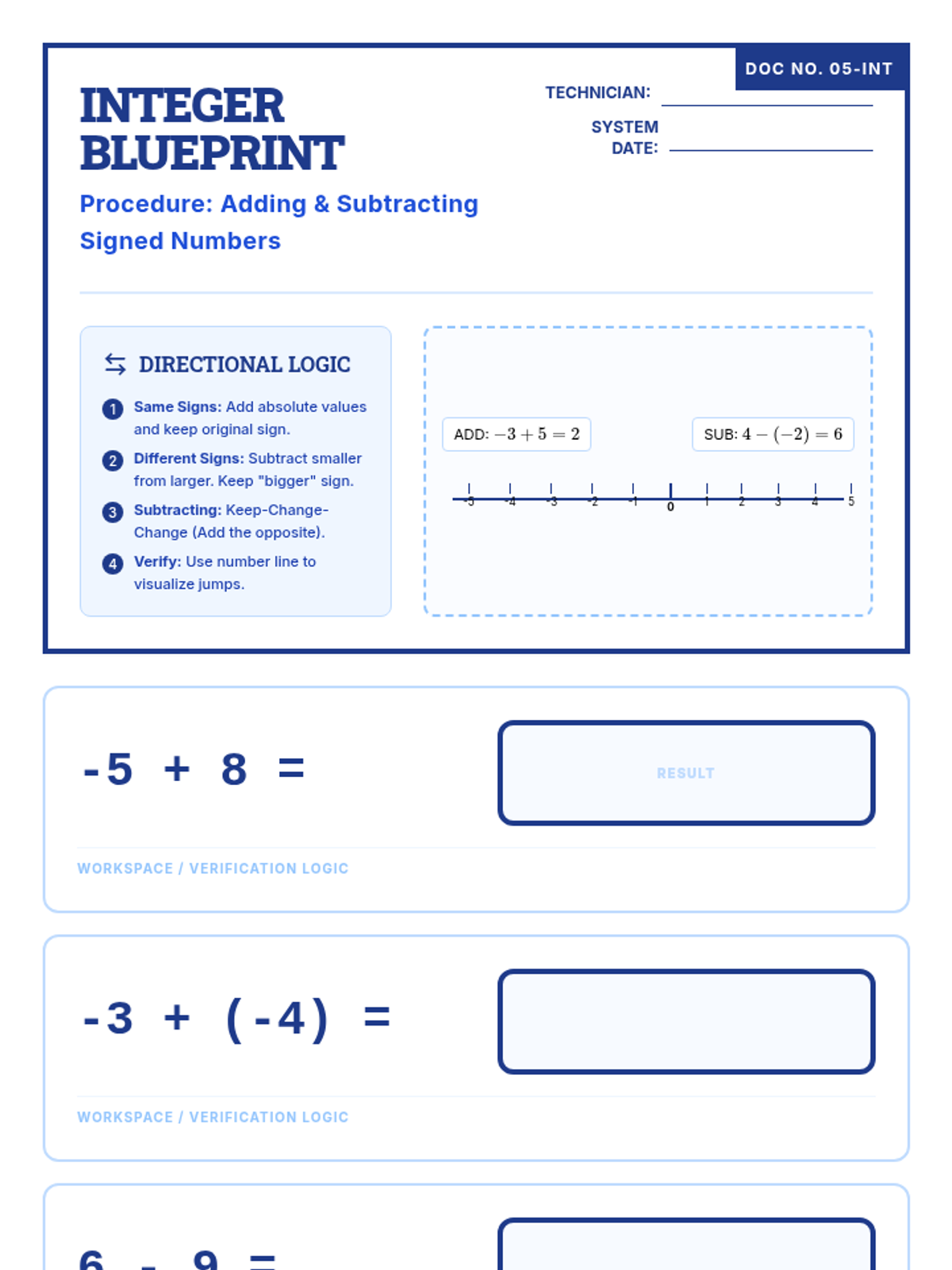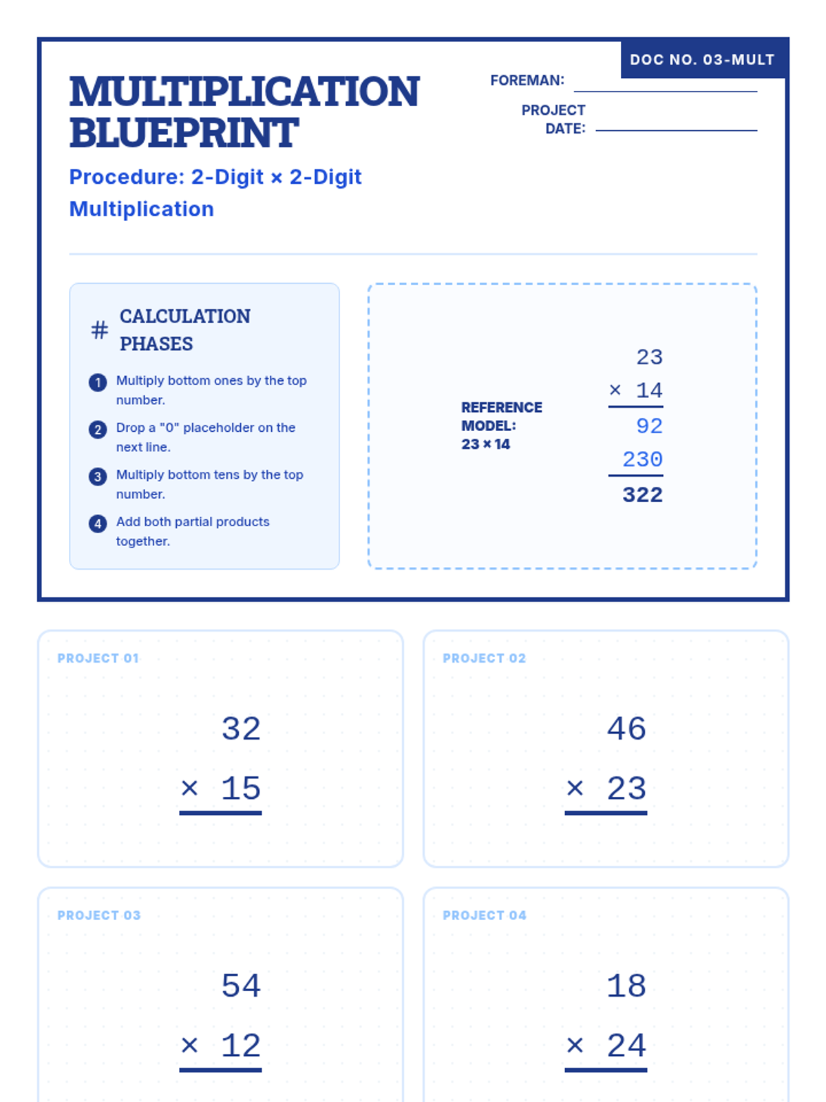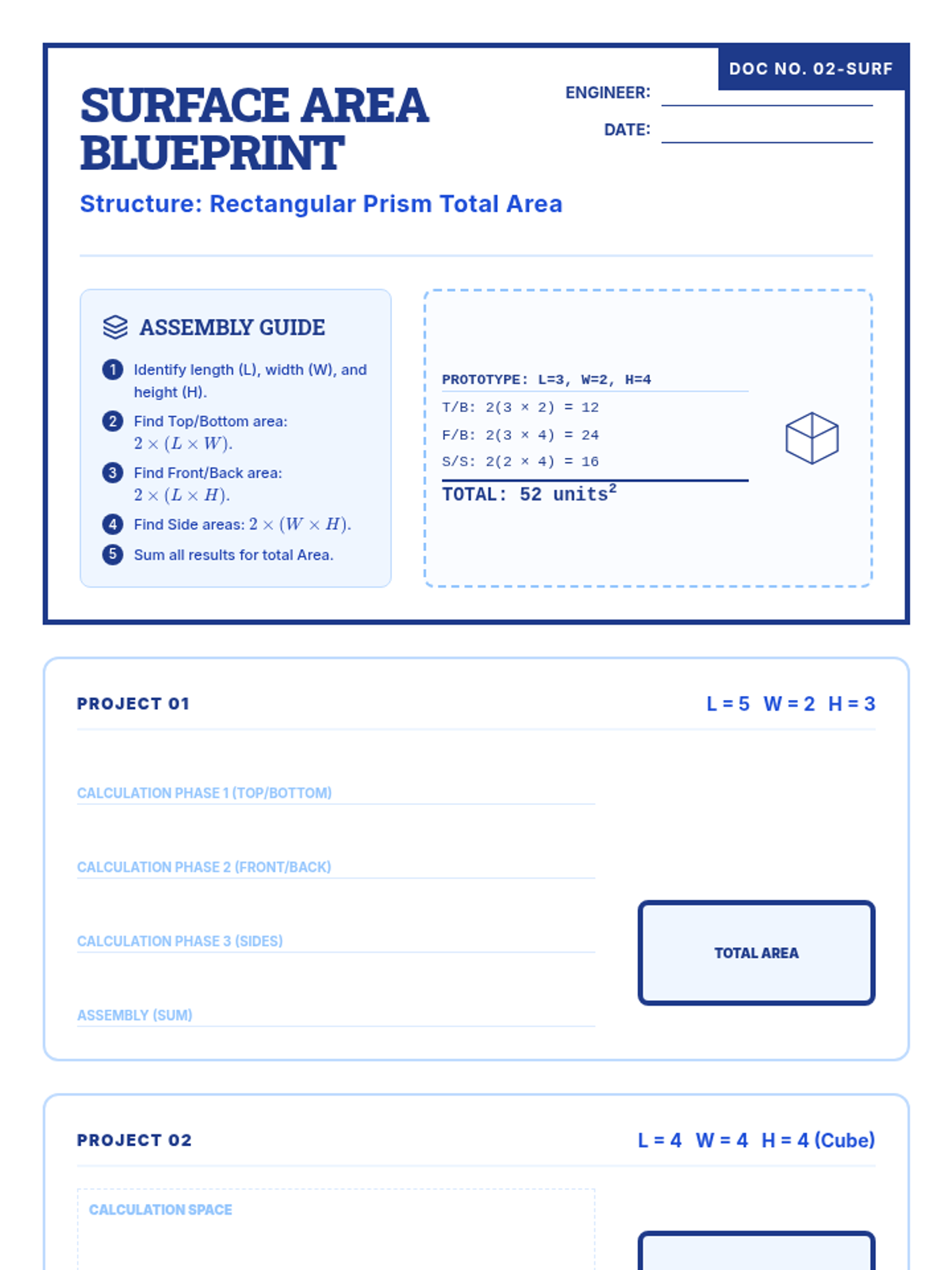 A collection of 5 foundational math worksheets focused on procedural mastery in division, surface area, multi-digit multiplication, fraction-decimal conversion, and integer arithmetic. Each sheet includes a step-by-step checklist and a worked example.