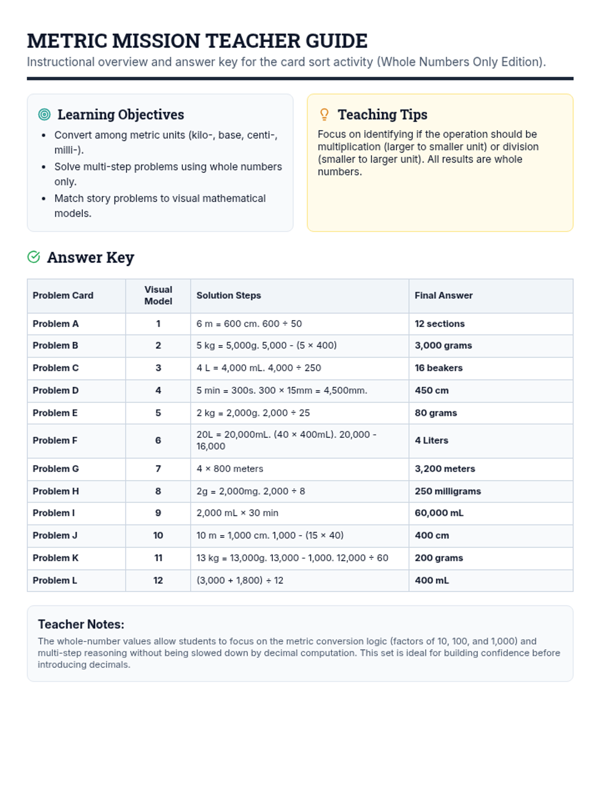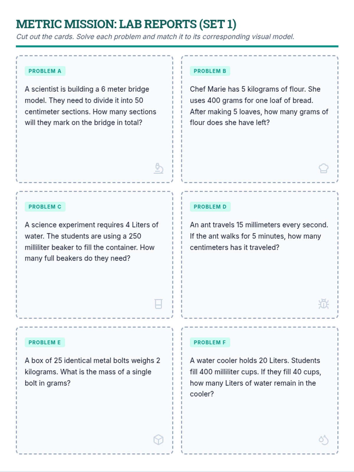 A hands-on lesson where students solve real-world metric conversion problems and match them with visual models. students will apply multiplication and division strategies to convert between units of length, mass, and capacity.