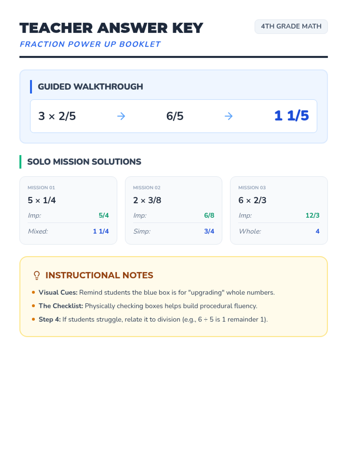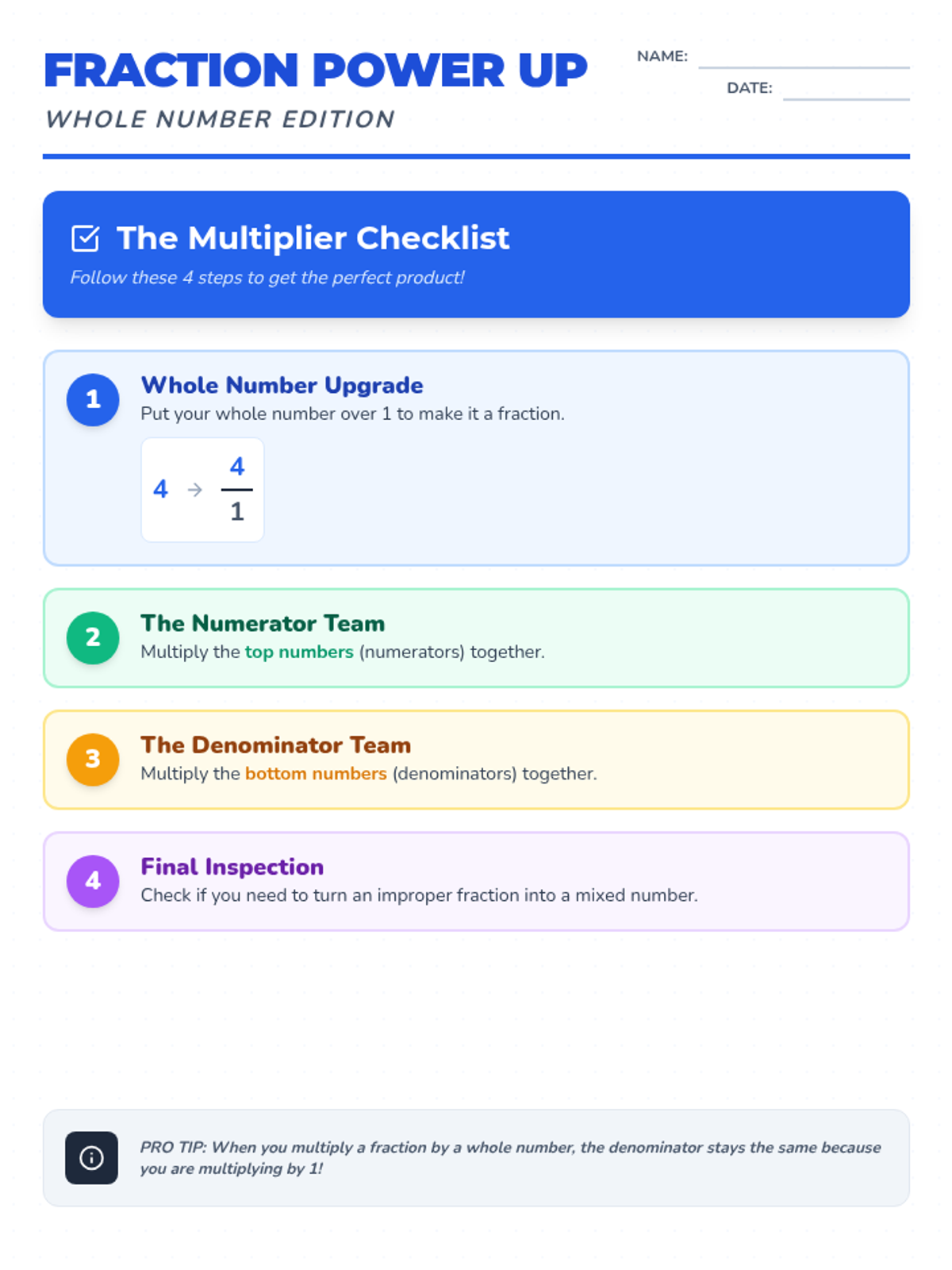 A comprehensive guide and practice set for 4th-grade students to master multiplying fractions by whole numbers using a structured checklist and color-coded visual aids.
