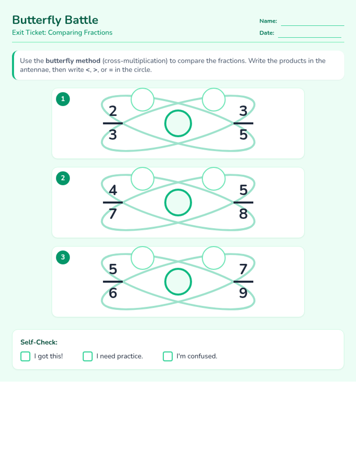 A quick assessment on comparing fractions with unlike denominators using the butterfly cross-multiplication method.