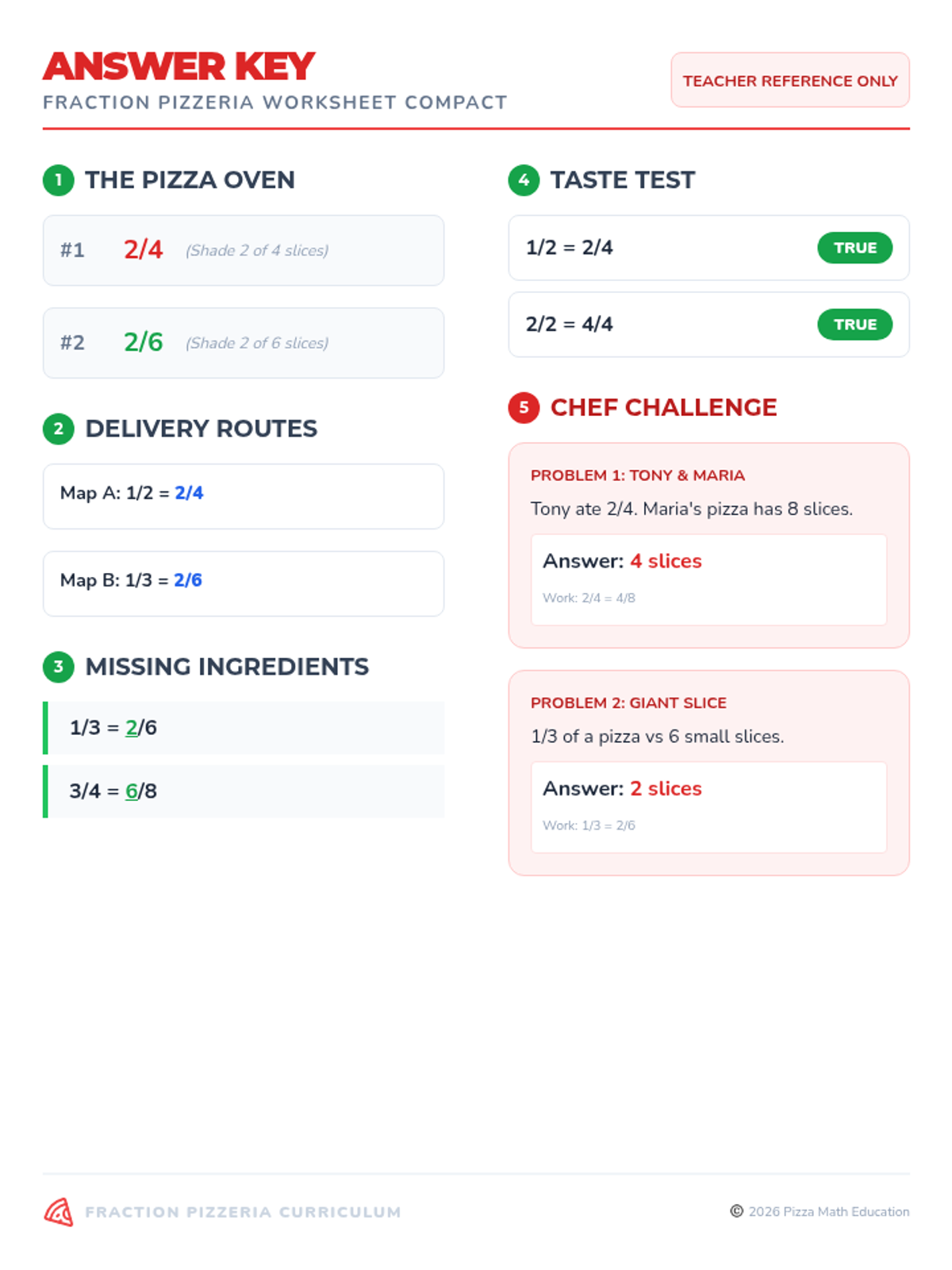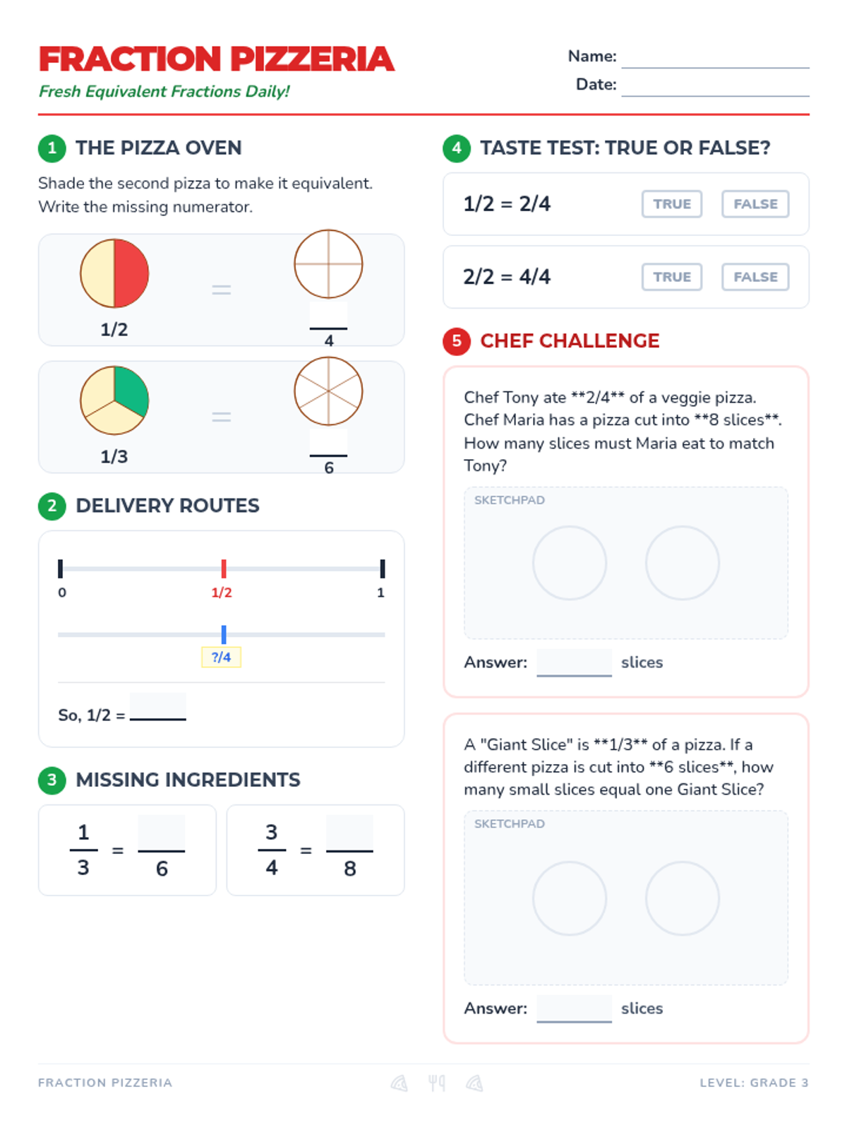 A lesson focused on identifying and creating equivalent fractions using visual models and number lines, themed around a pizza parlor.
